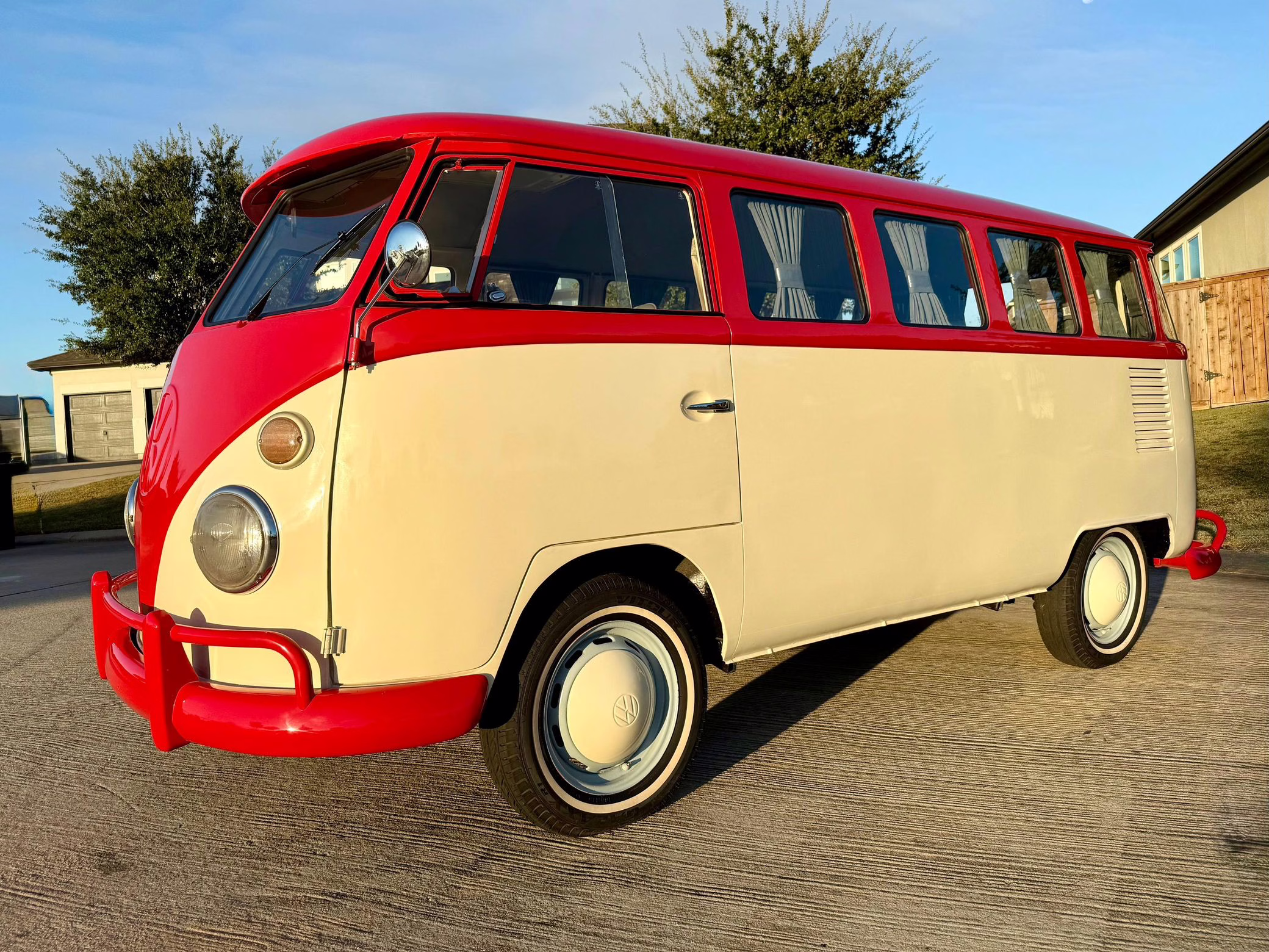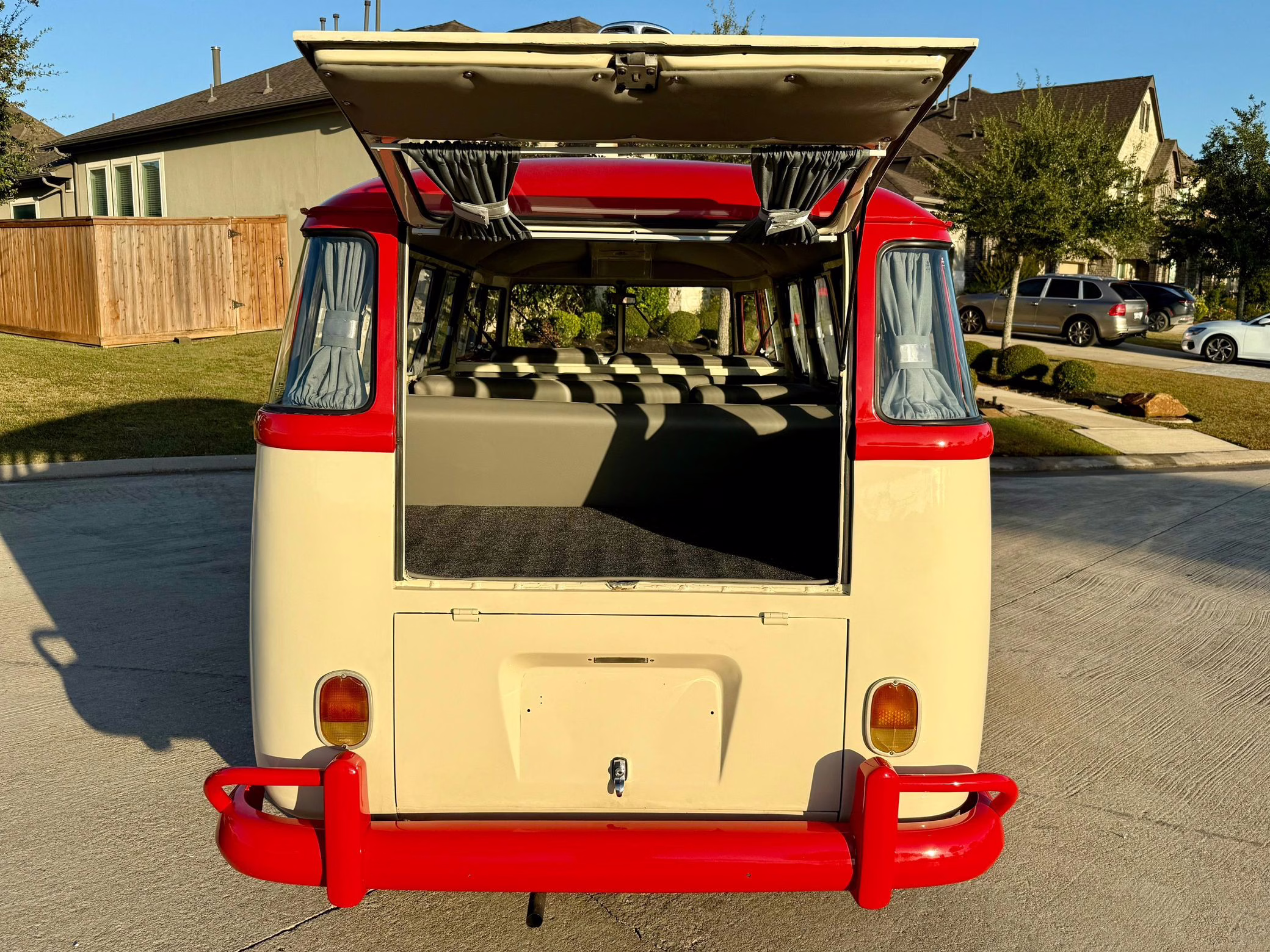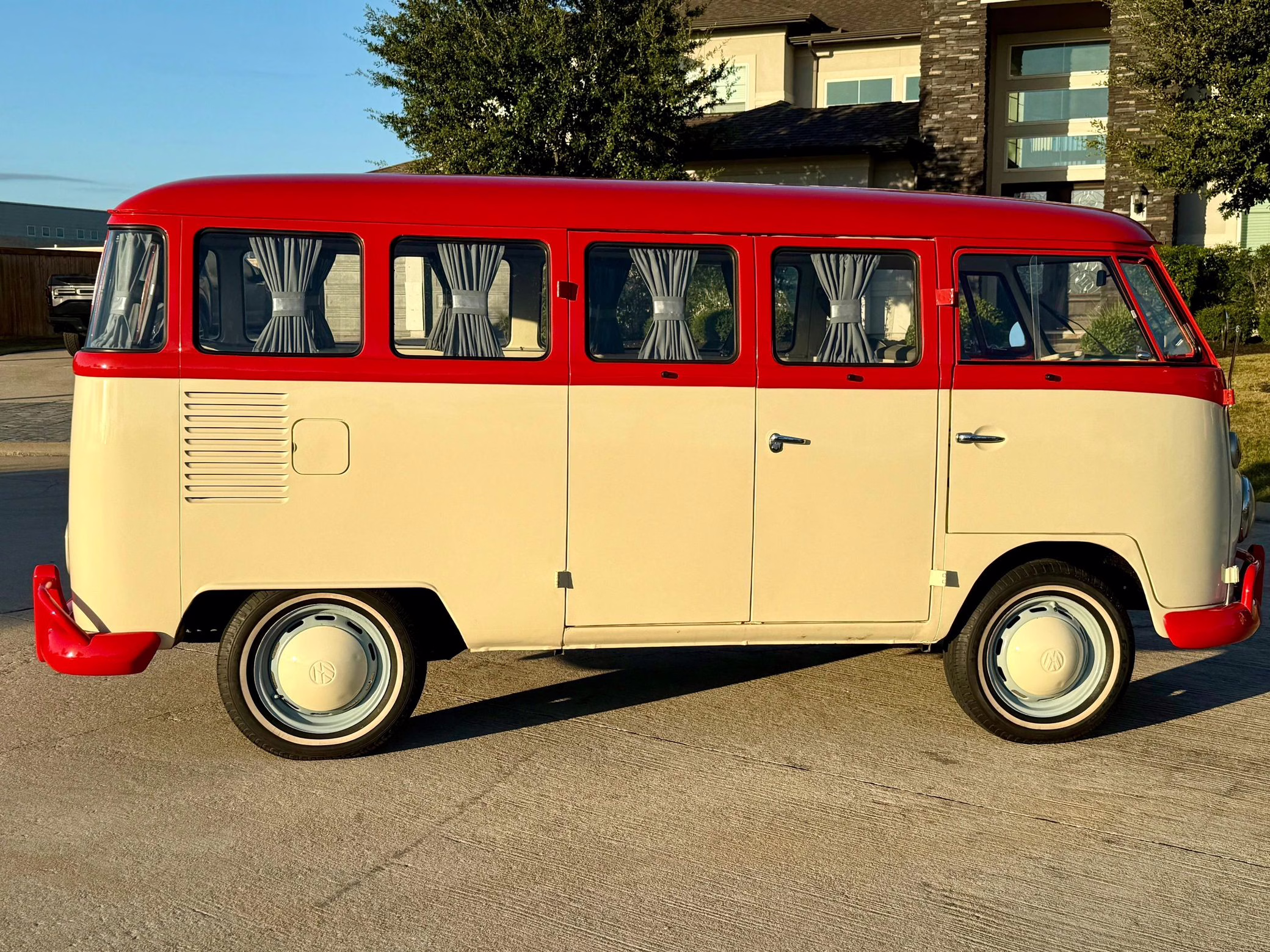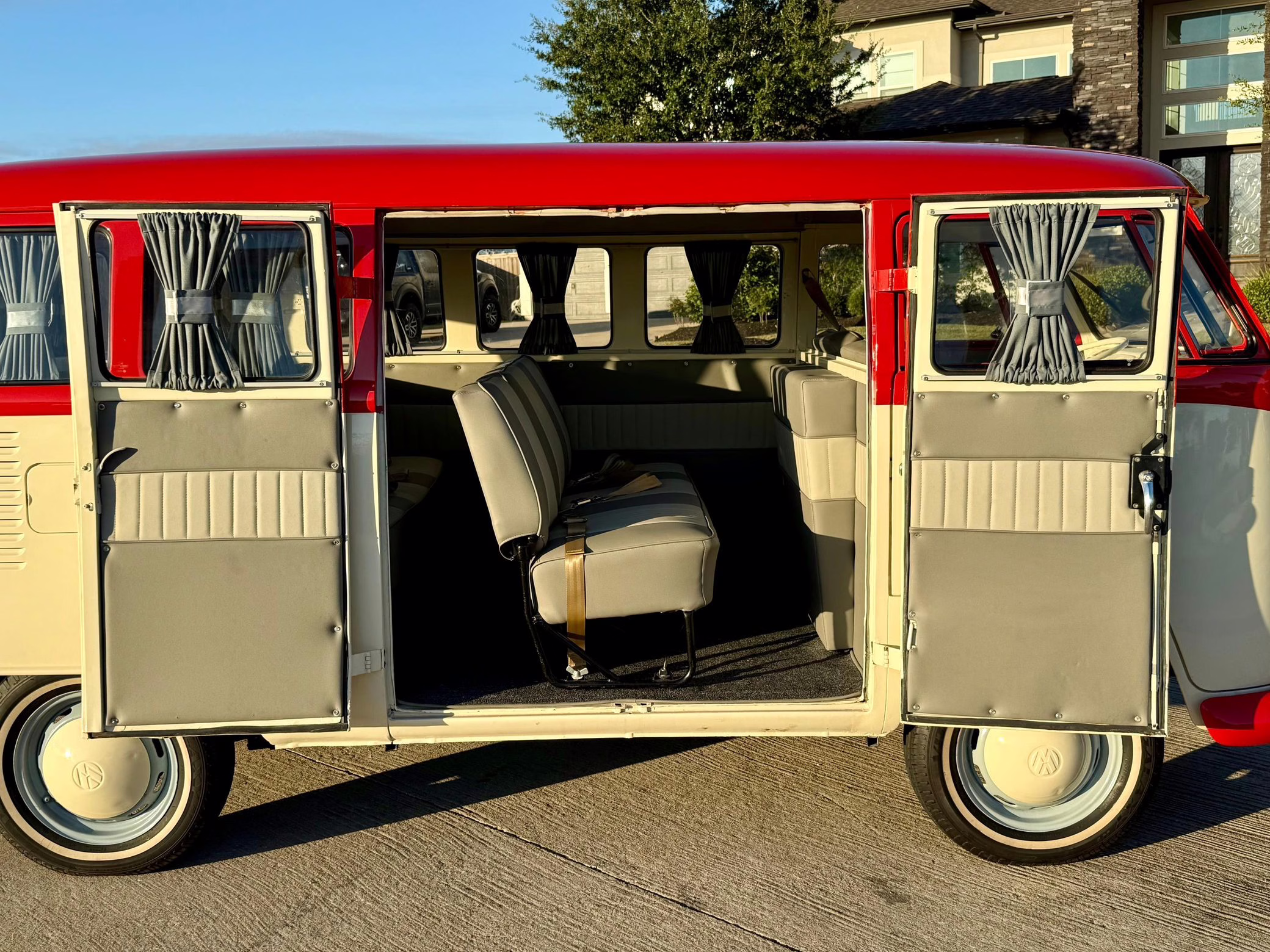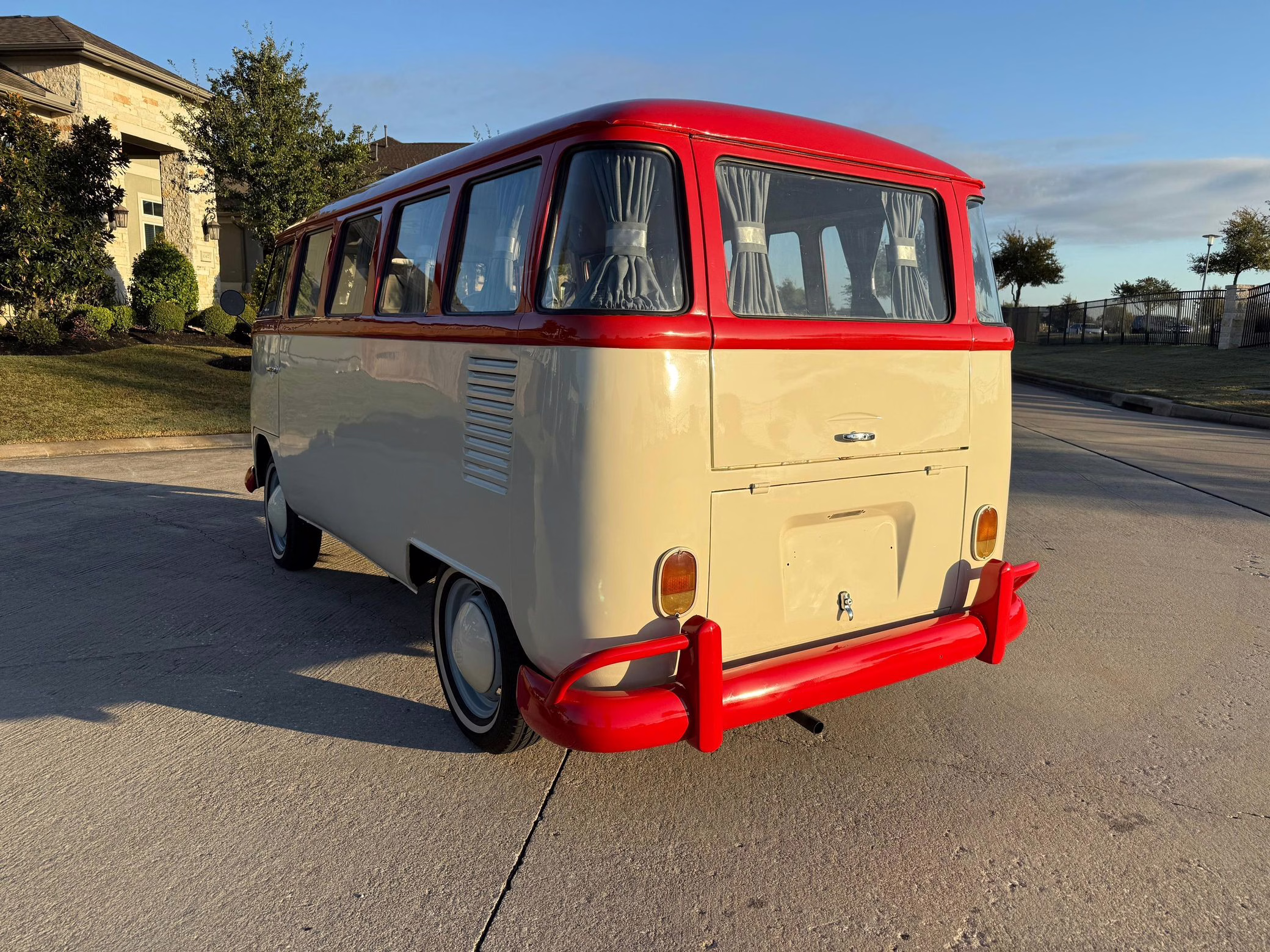 1975 Volkswagen Bus, finished in red and beige with a gray interior.