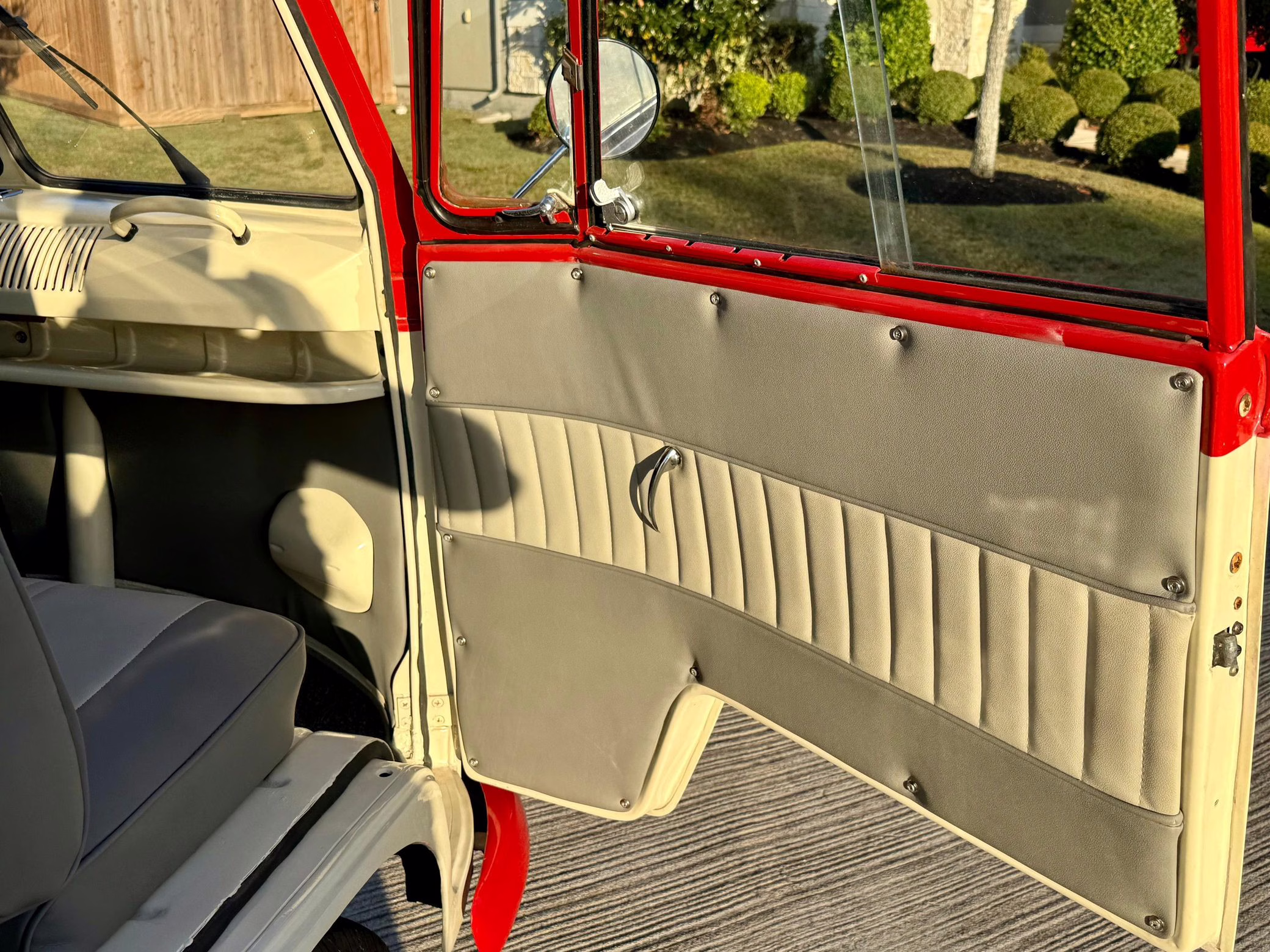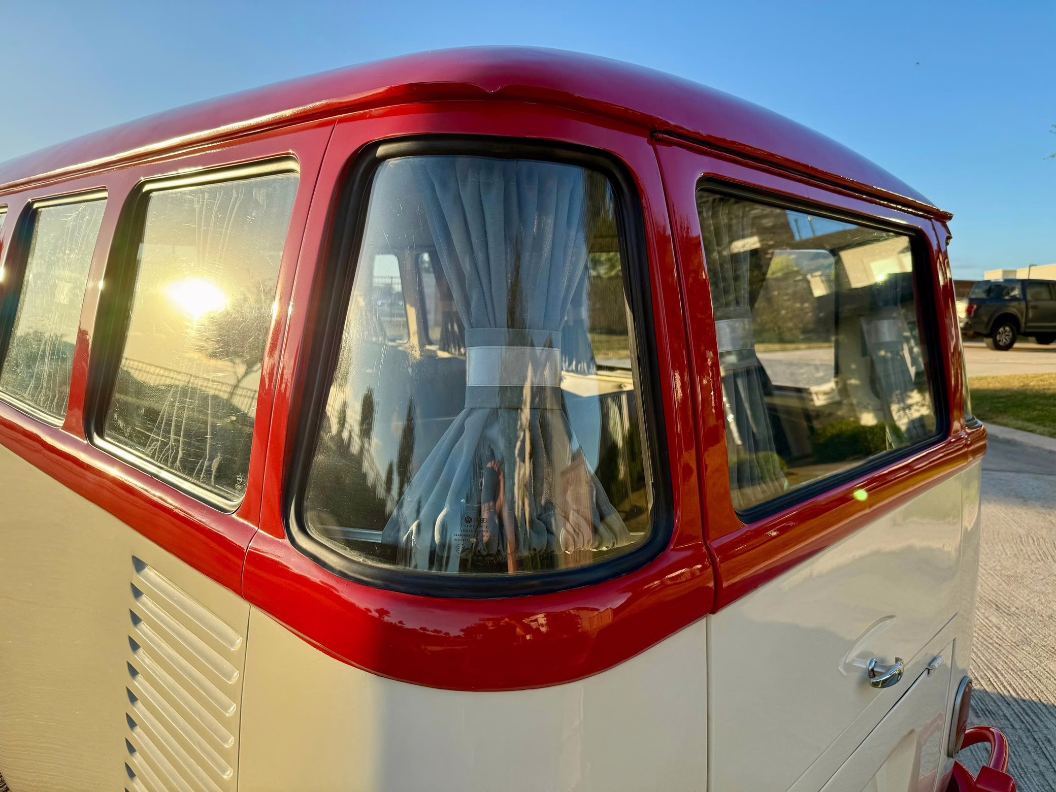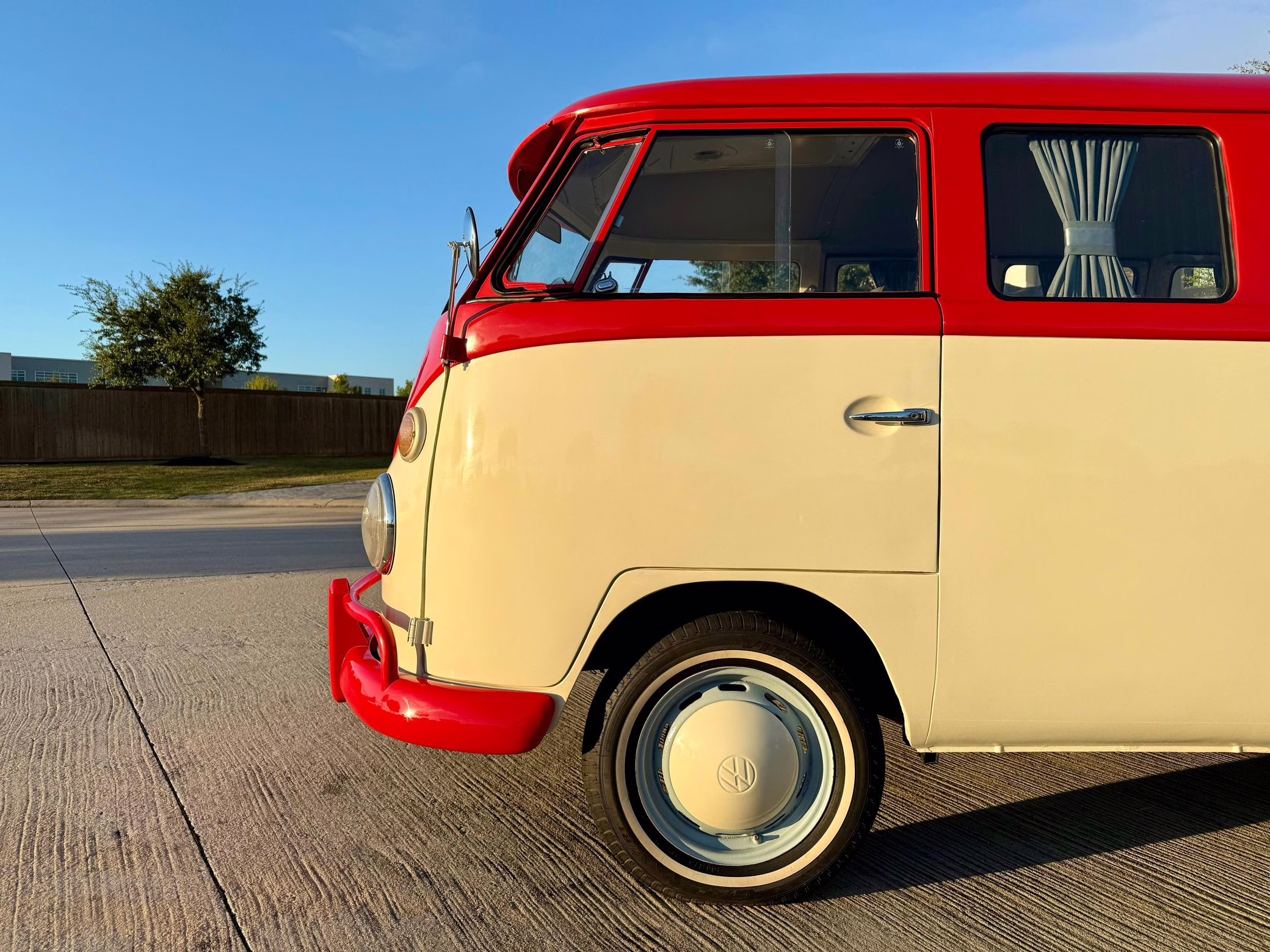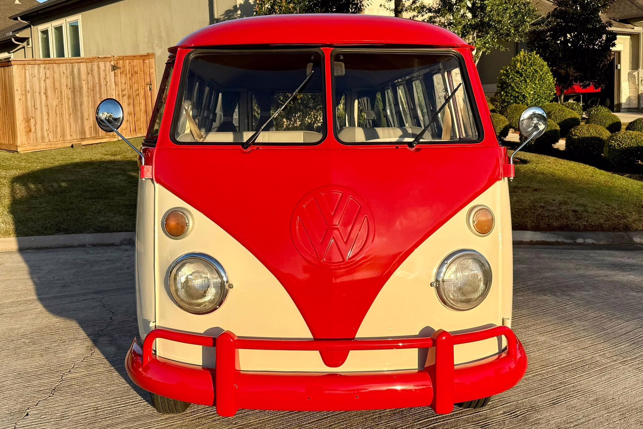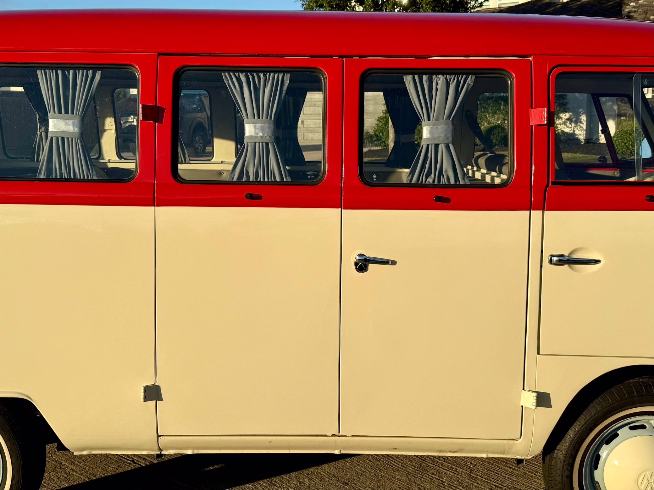 1975 Volkswagen Bus, finished in red and beige with a gray interior.