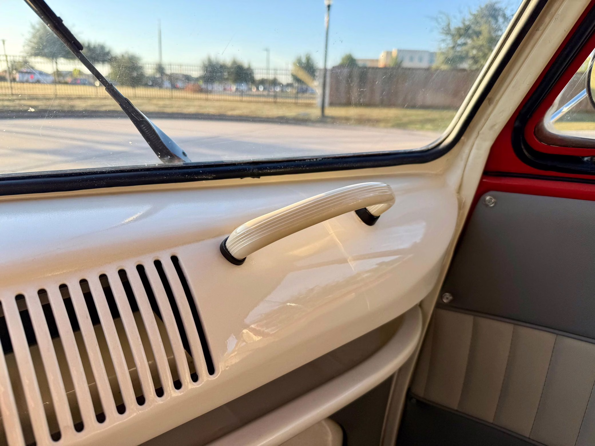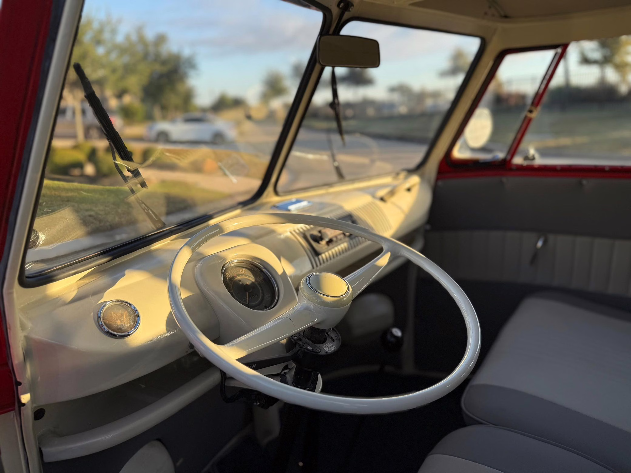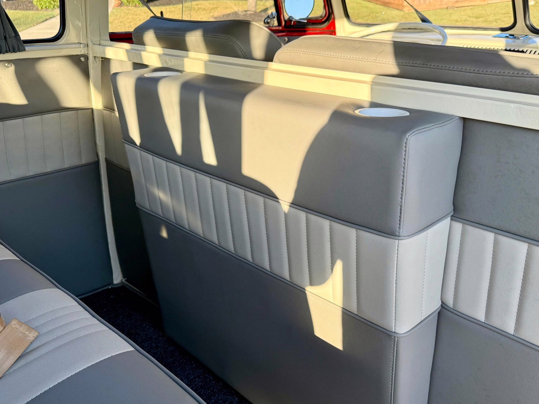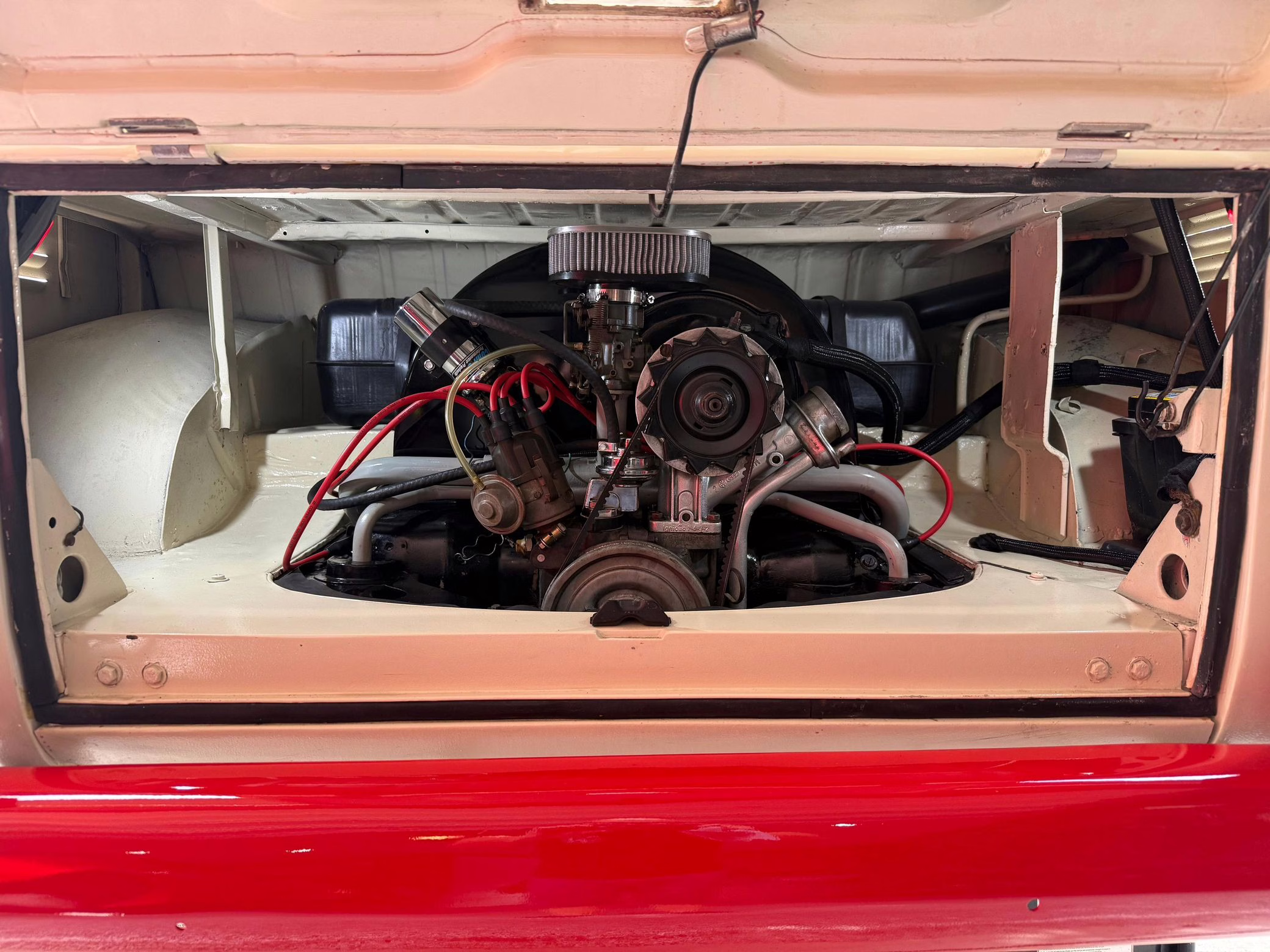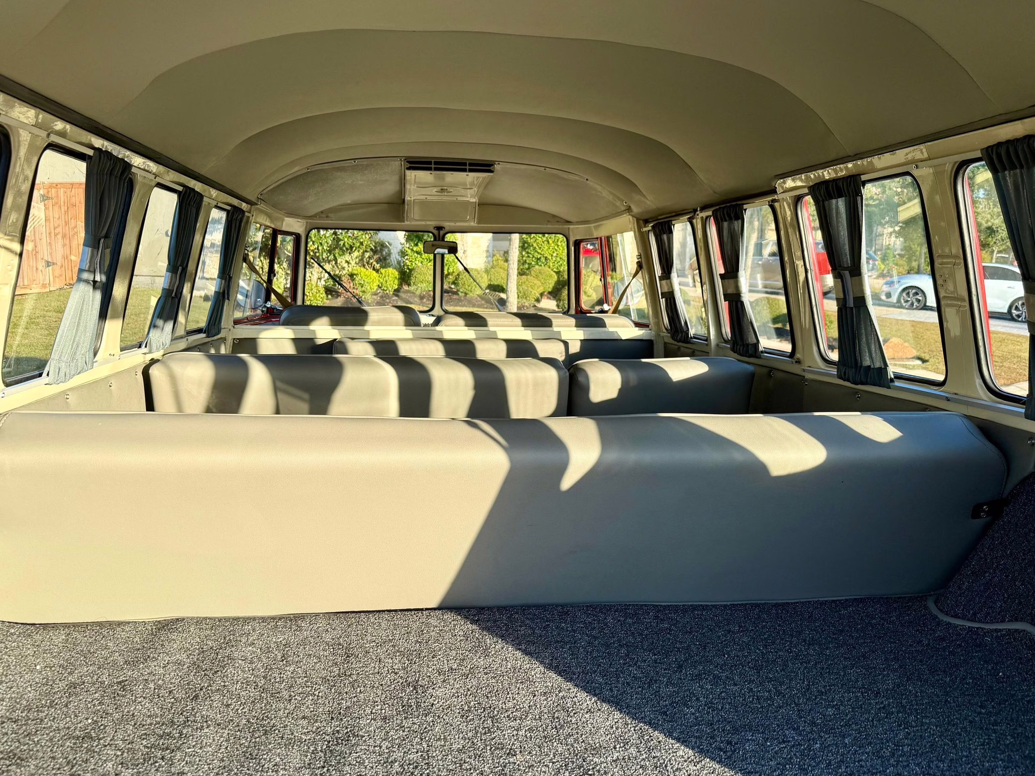 1975 Volkswagen Bus, finished in red and beige with a gray interior.