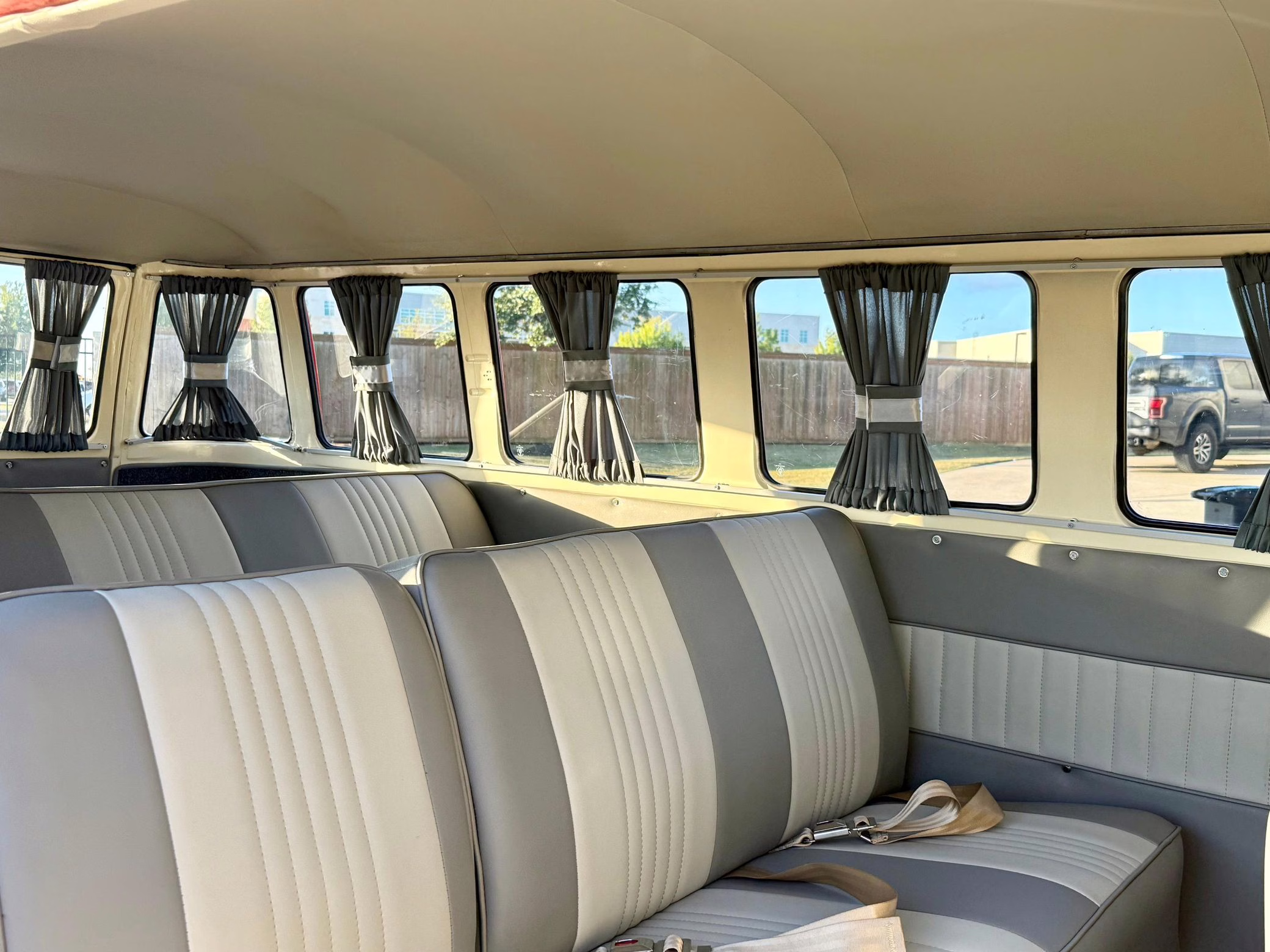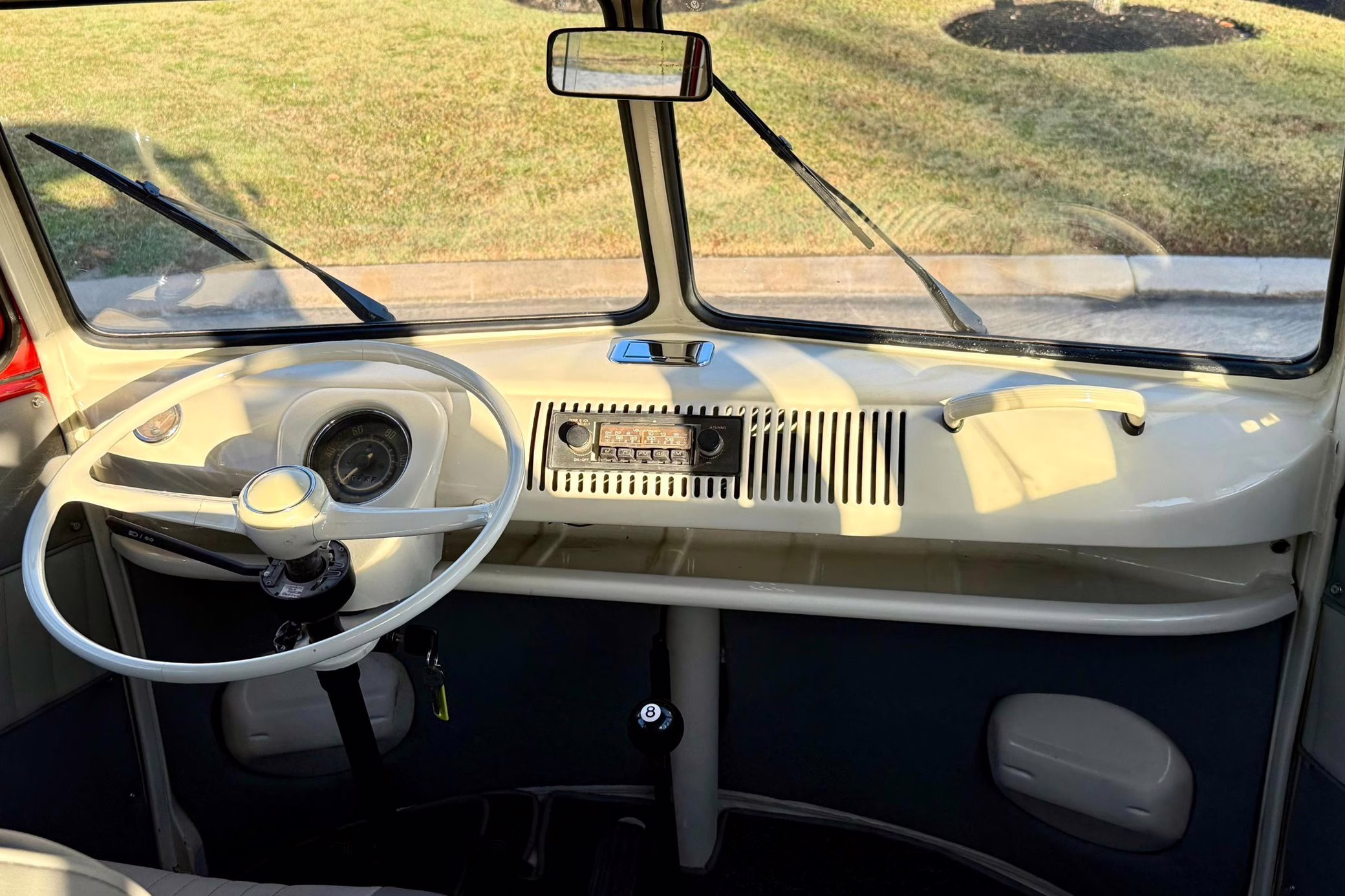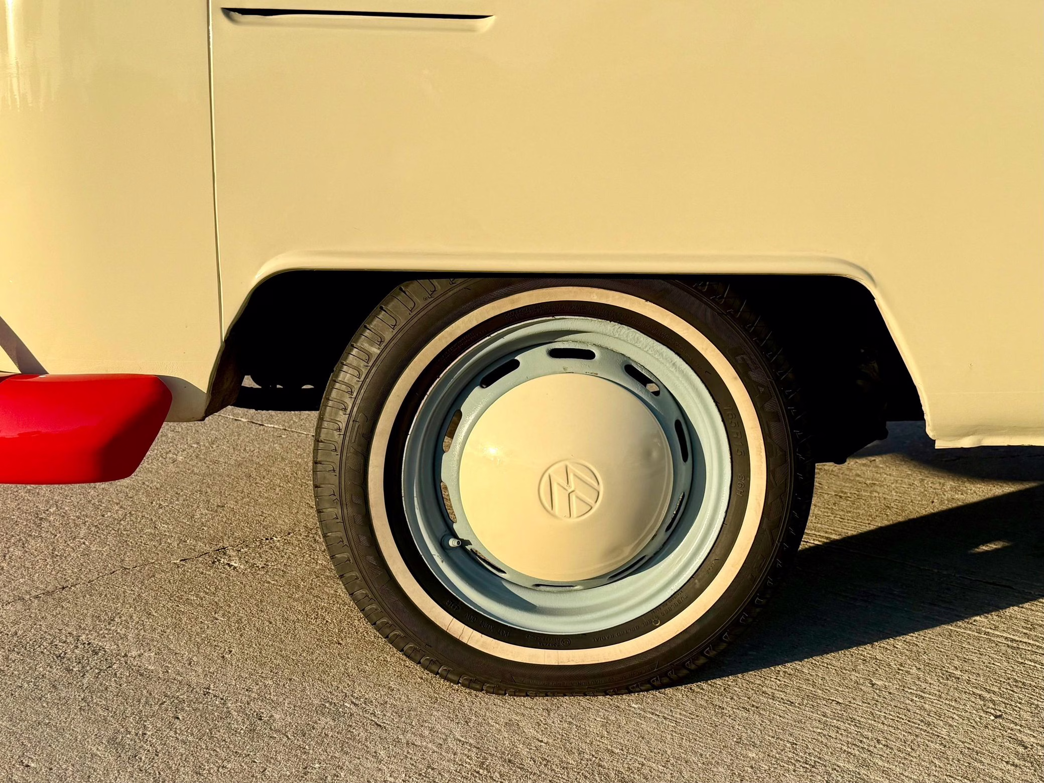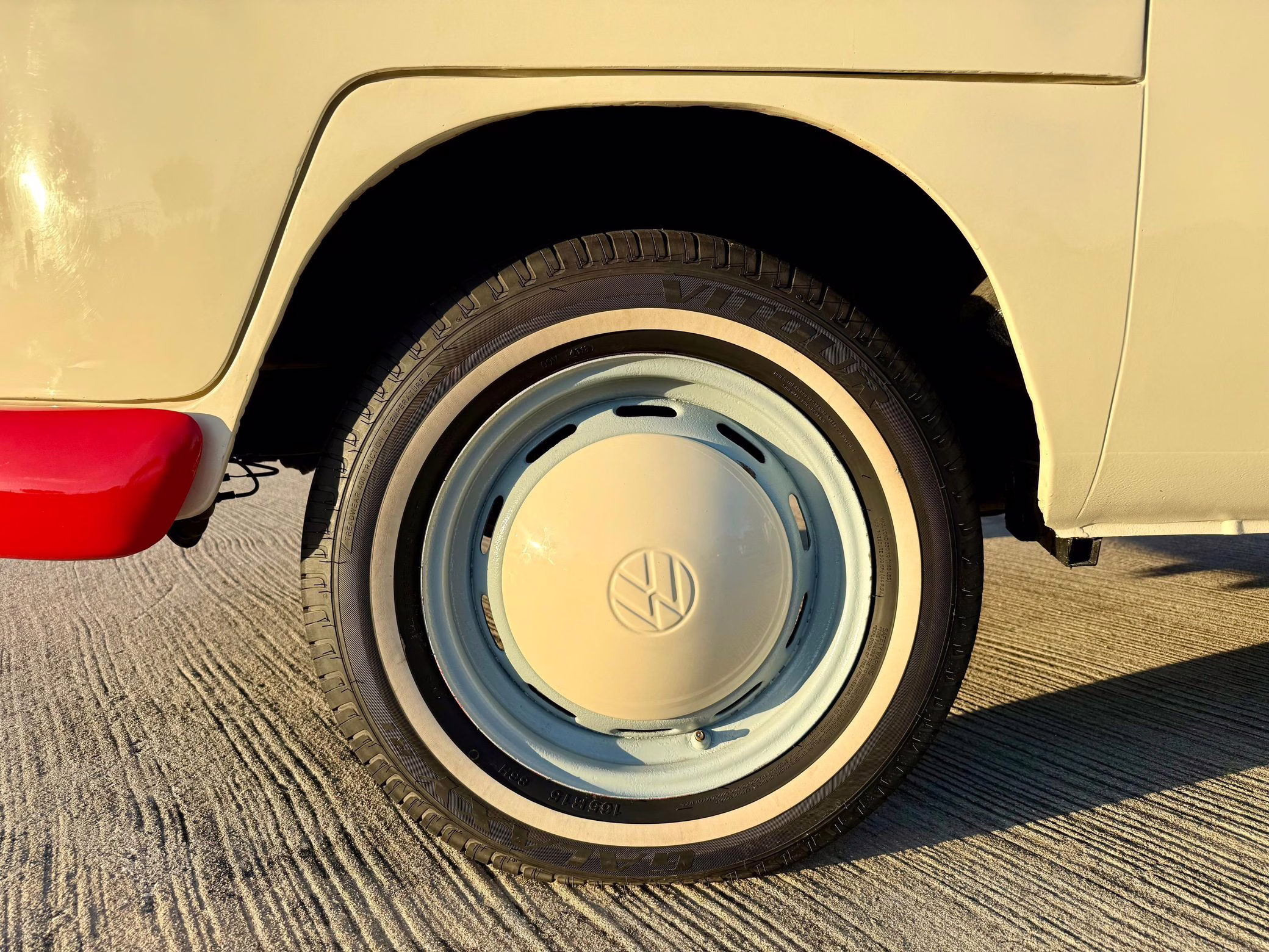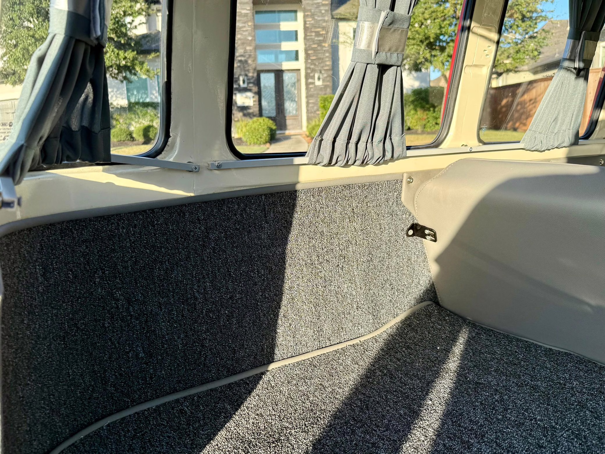1975 Volkswagen Bus, finished in red and beige with a gray interior.