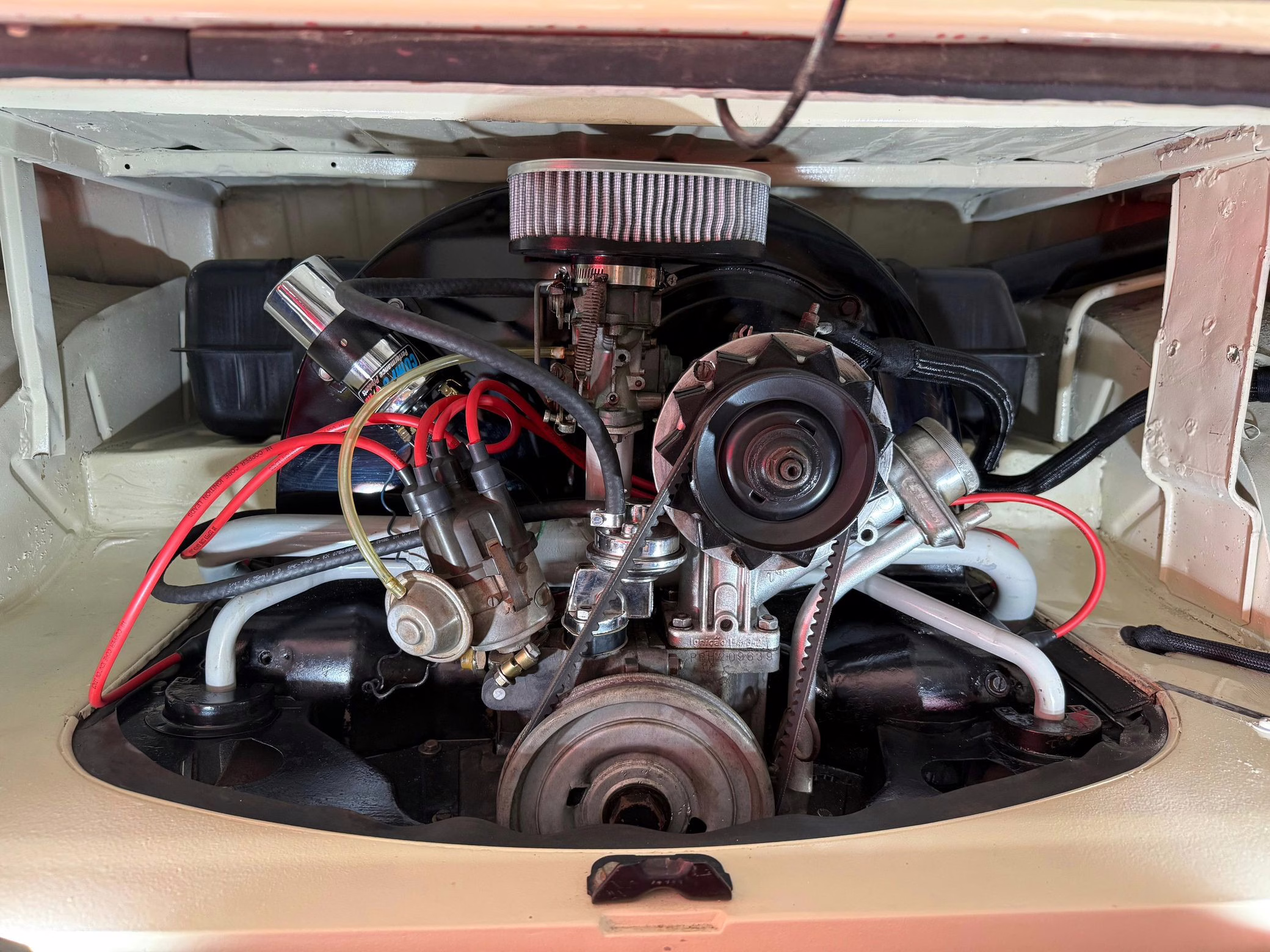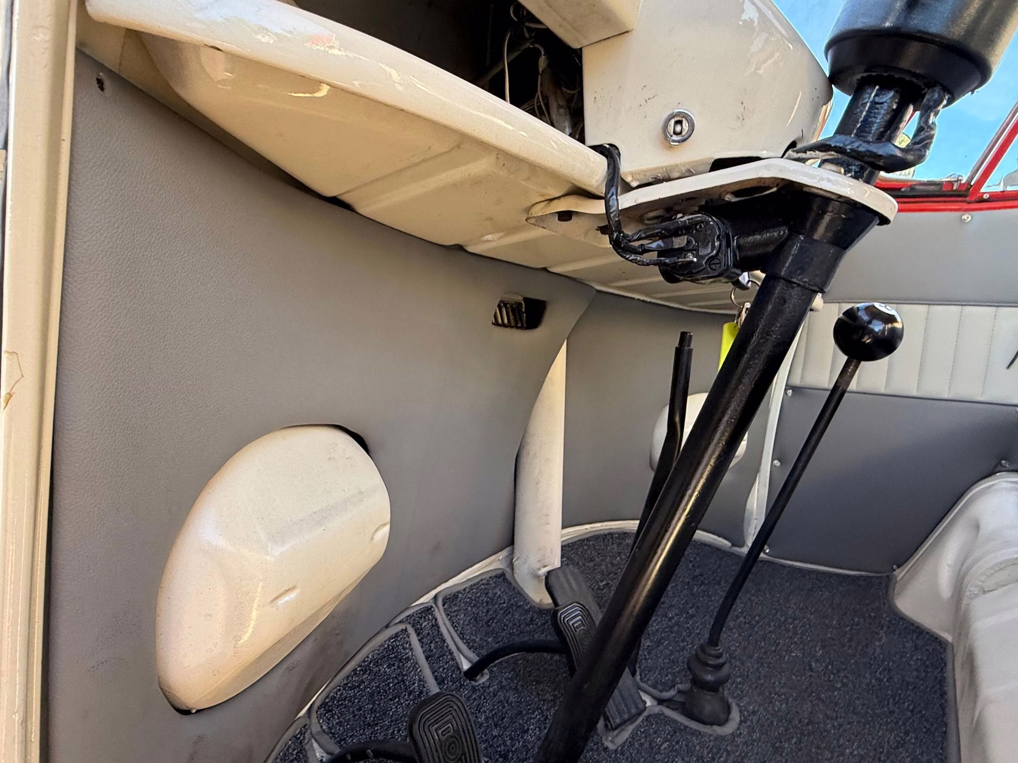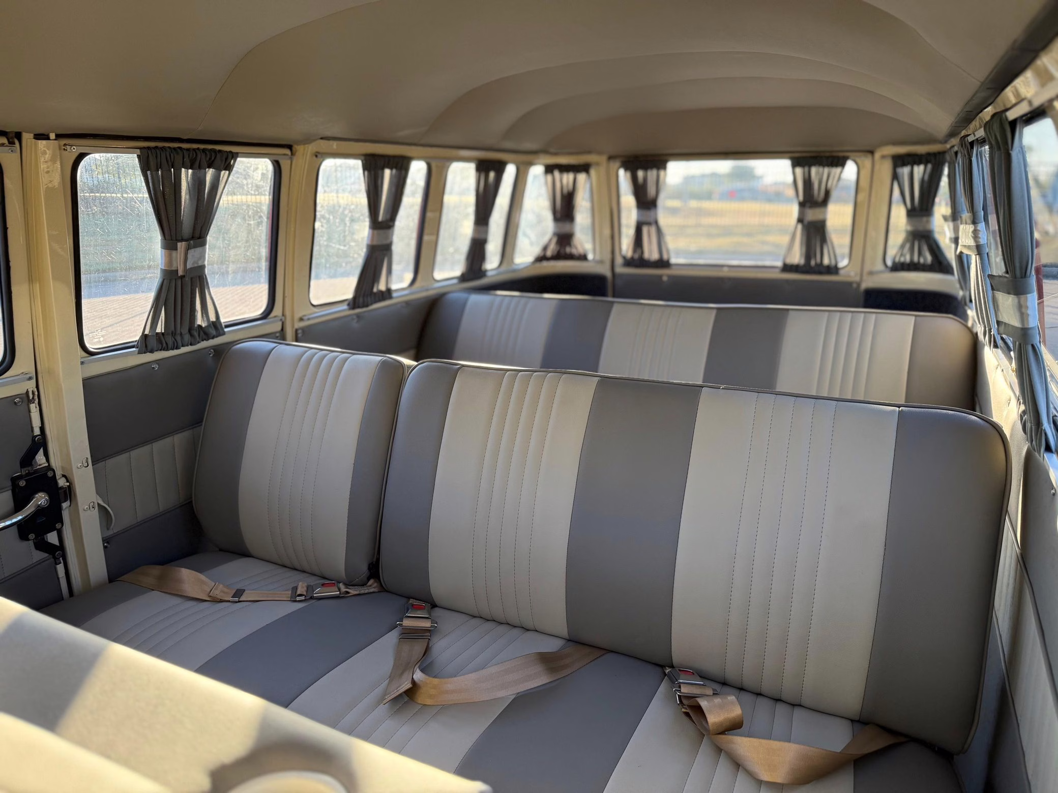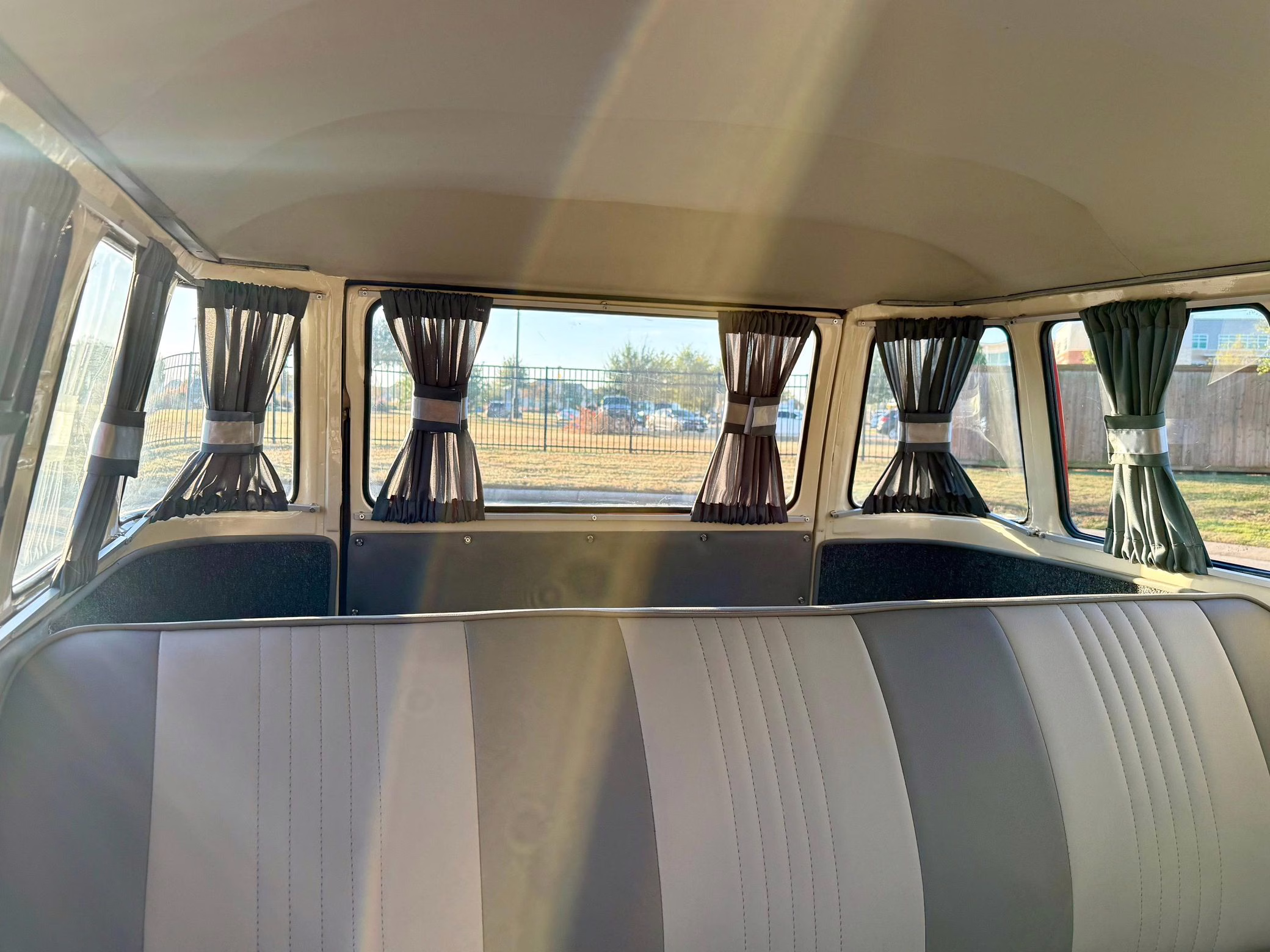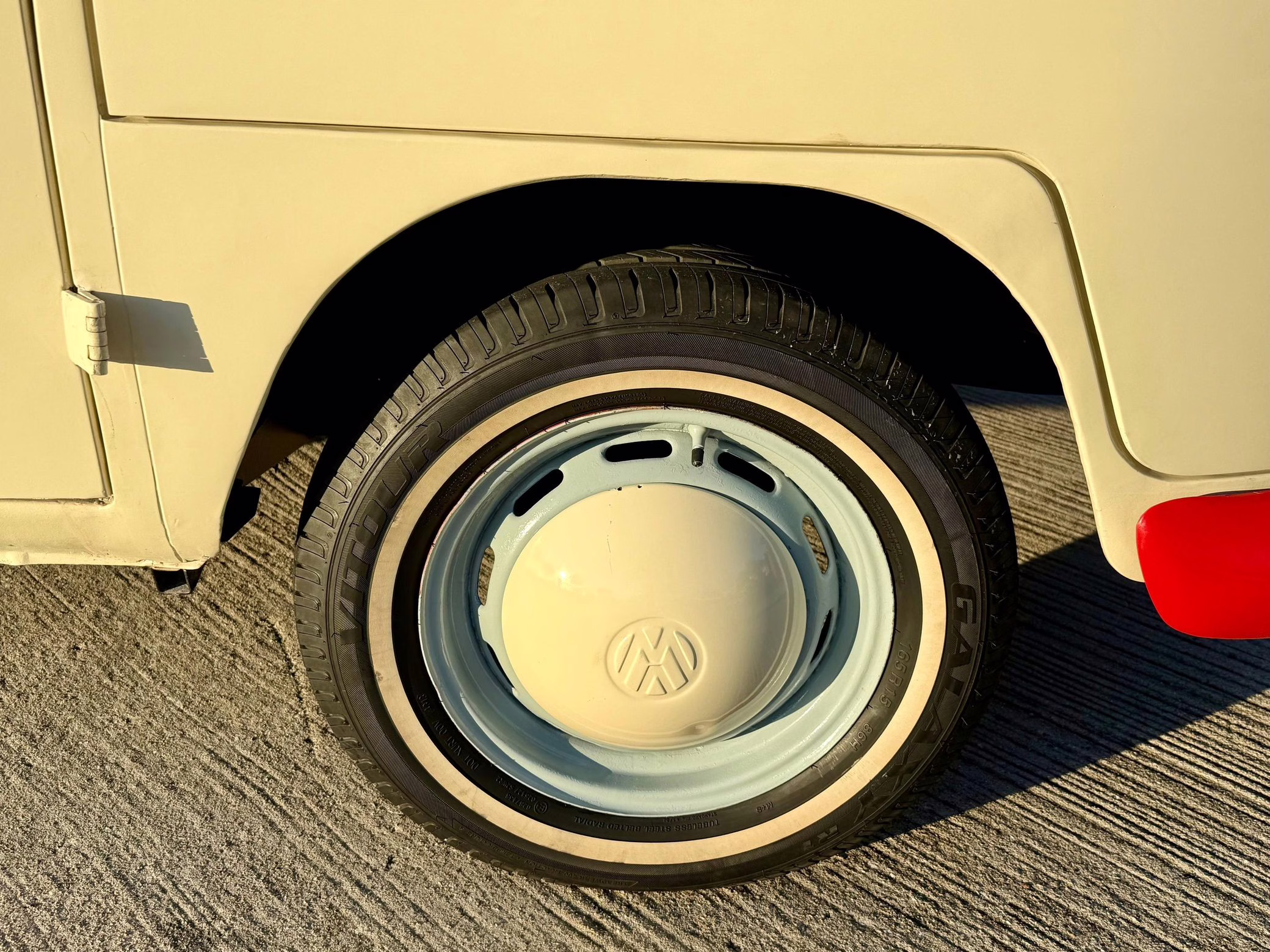 1975 Volkswagen Bus, finished in red and beige with a gray interior.