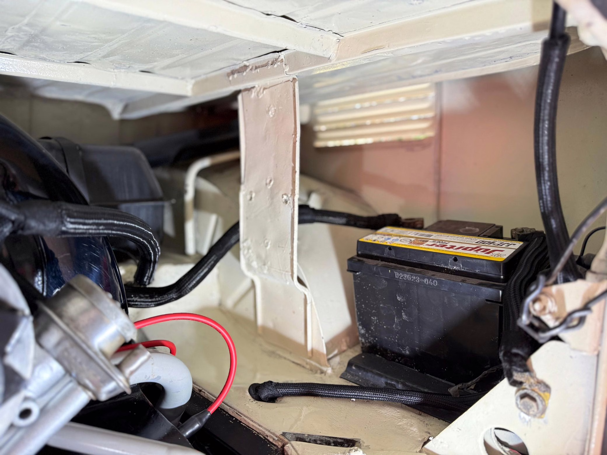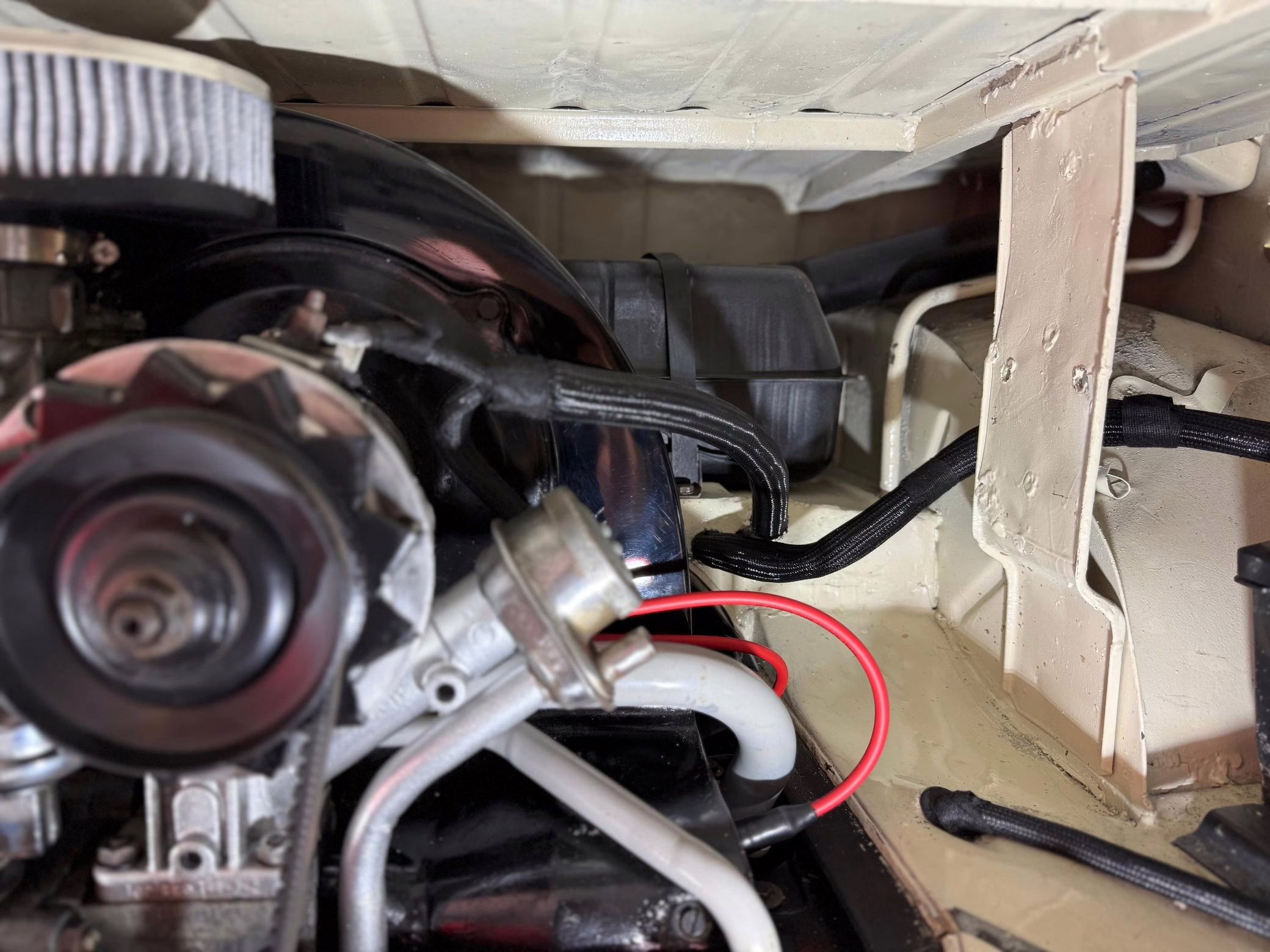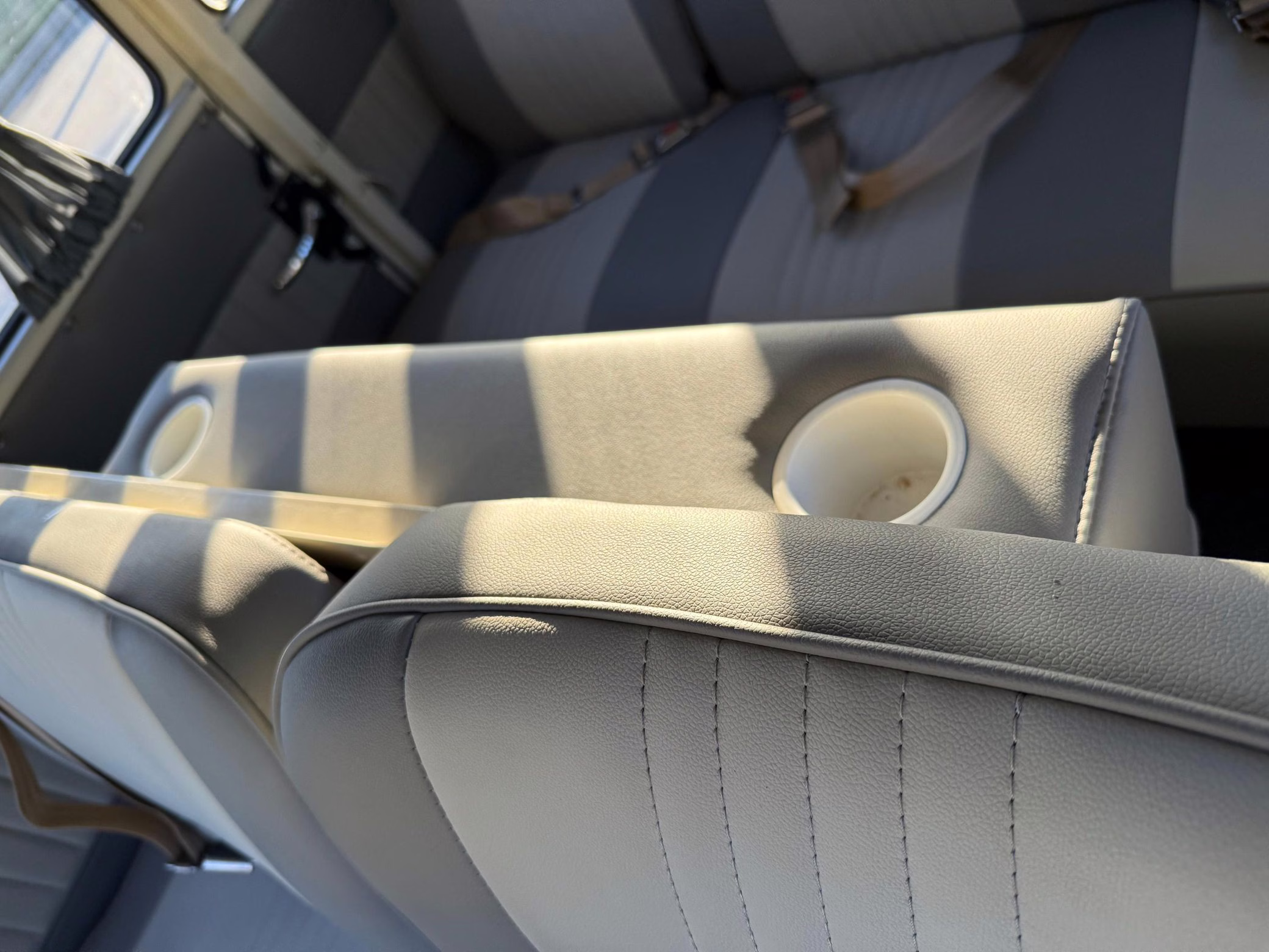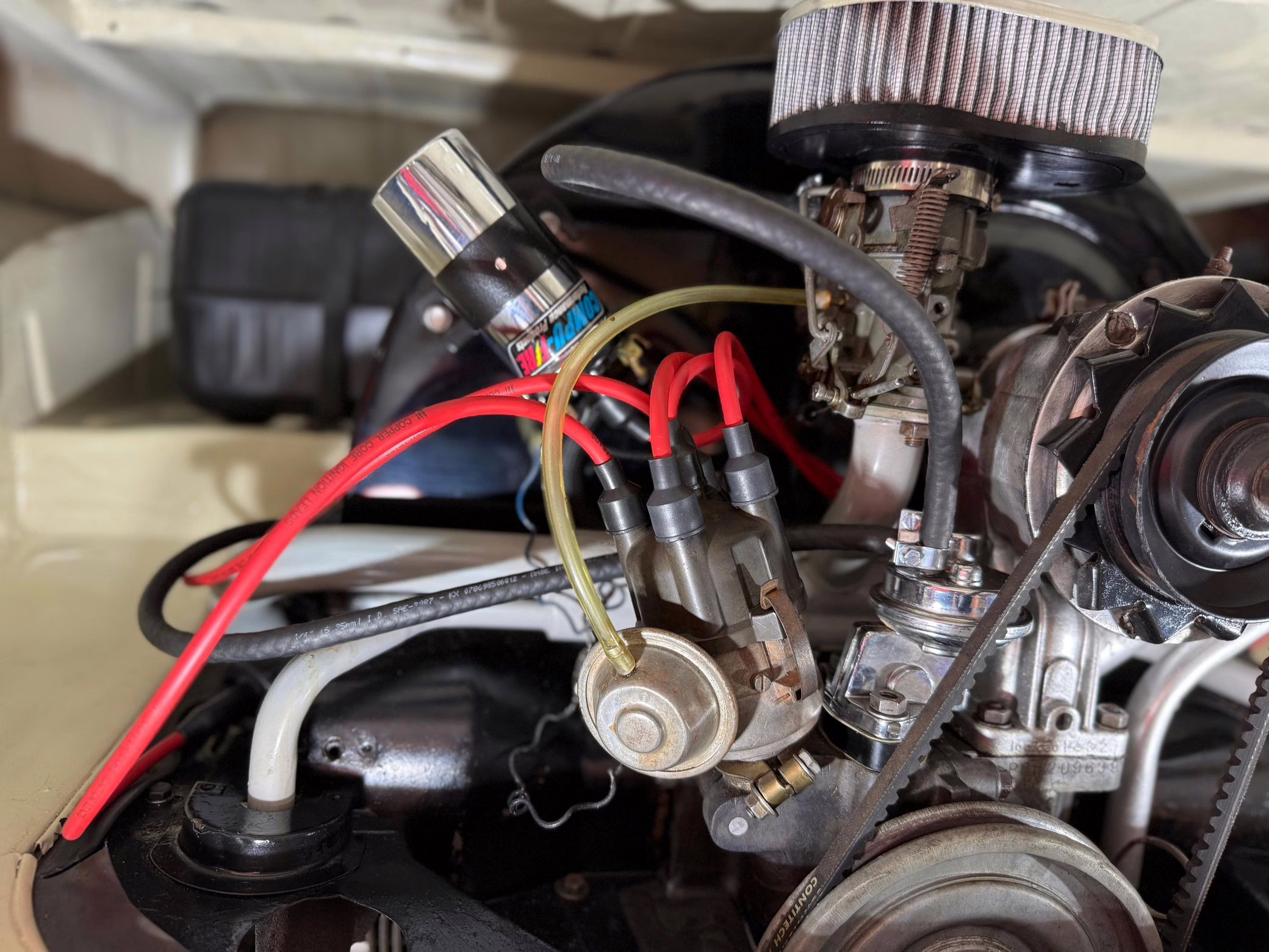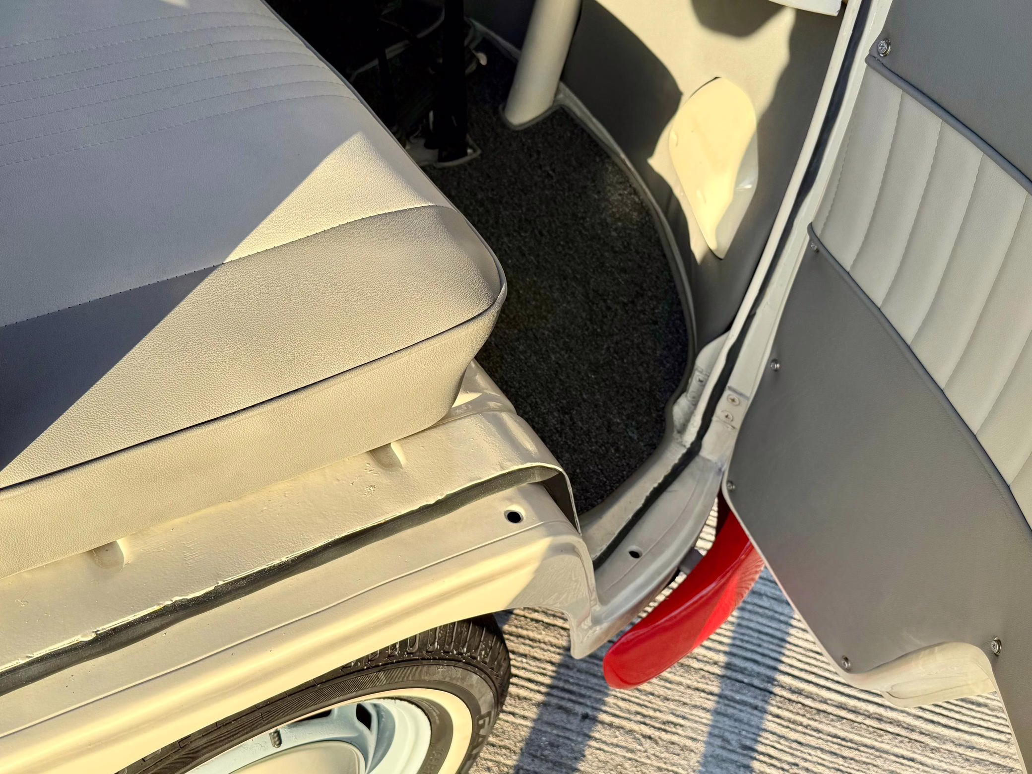 1975 Volkswagen Bus, finished in red and beige with a gray interior.
