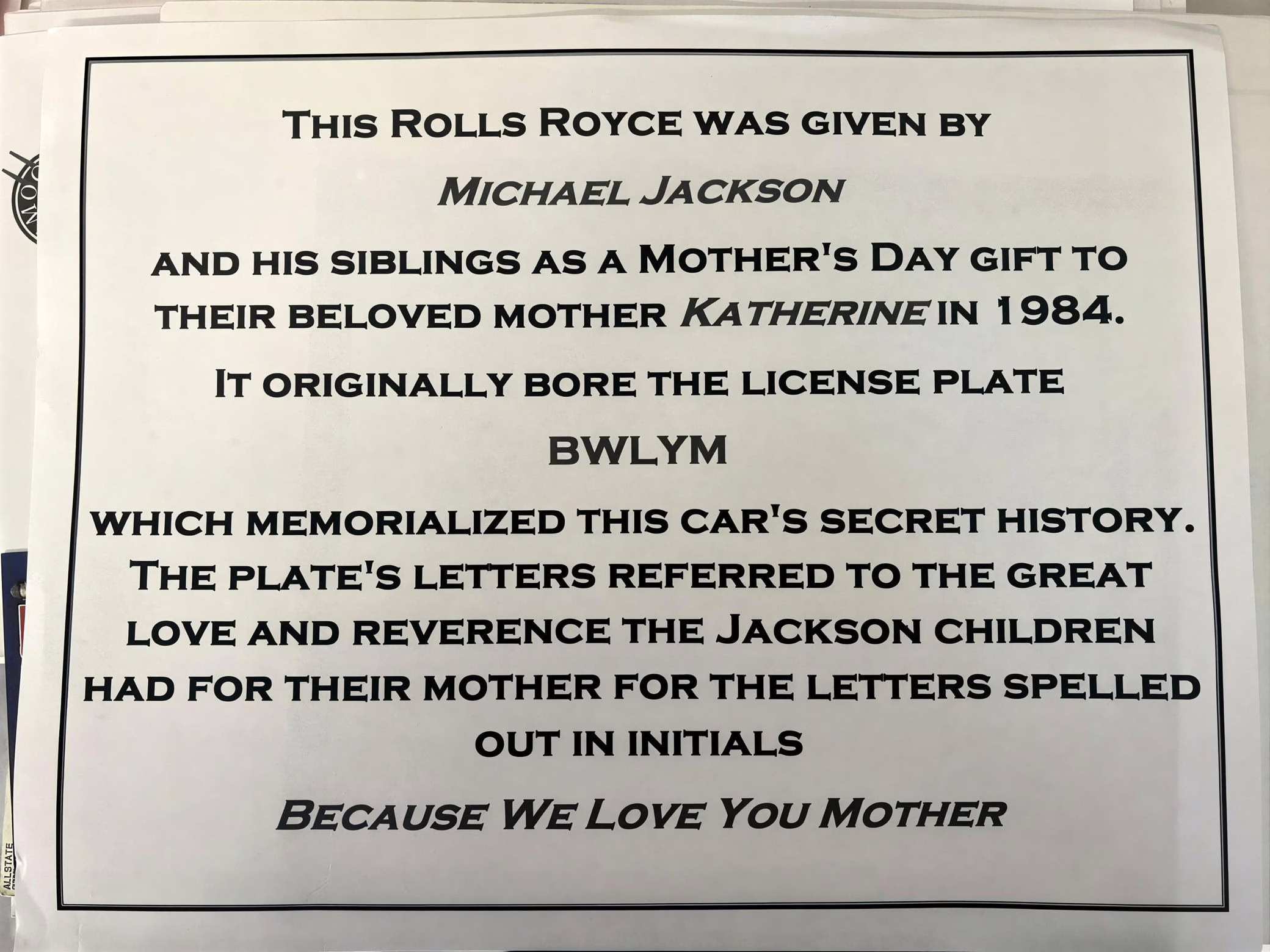 This Silver Spur was purchased new by Michael Jackson as a gift for his mother Katherine, according to the former owner. The California-issued “BWLYM” (“because we love you, mother”) license plate that this car reportedly wore during Jackson’s ownership is pictured in the gallery and included in the sale.