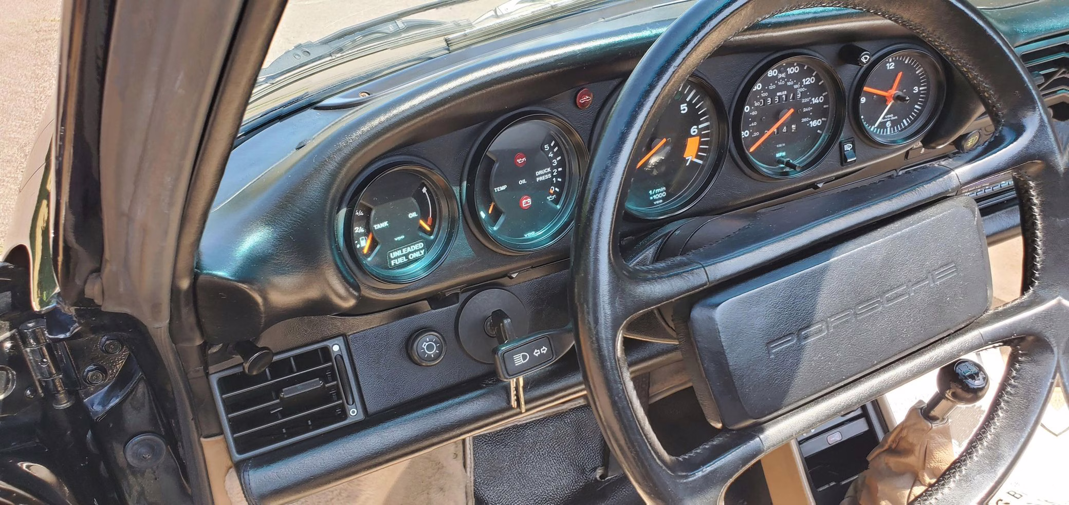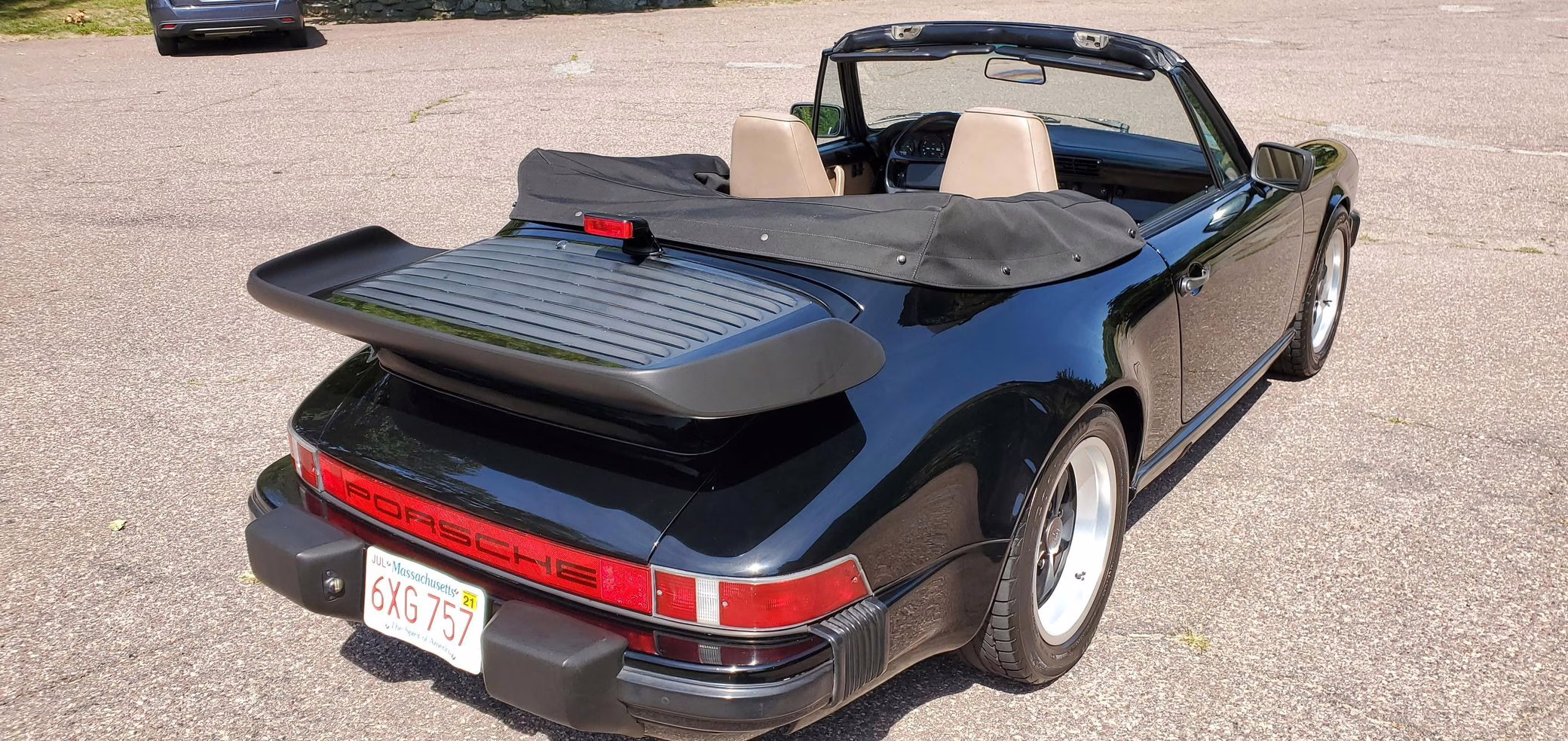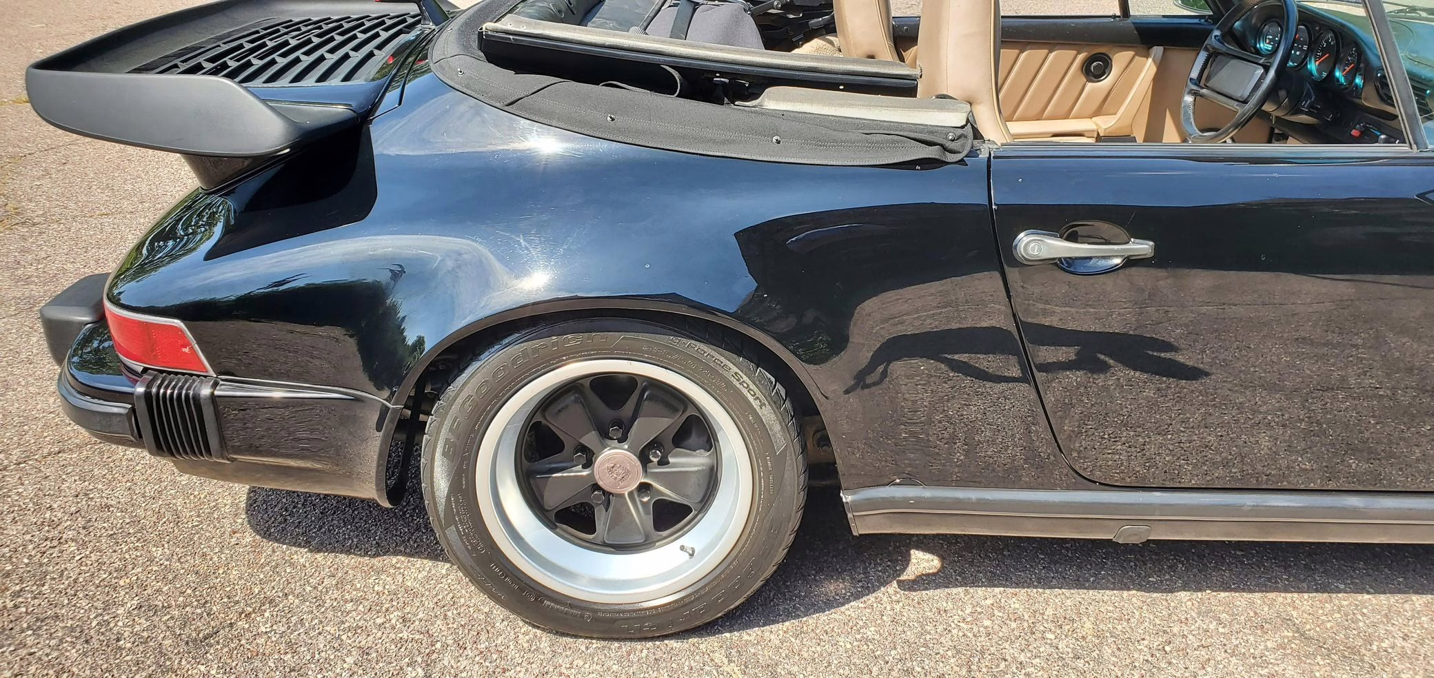 Riding on 16-inch Fuchs wheels, this 911 is equipped with leather upholstery, air conditioning, and a power-operated cloth soft top. It’s largely unmodified with the exception of a Turbo-style rear spoiler, an aftermarket Sony CD player, and a set of aftermarket speakers.