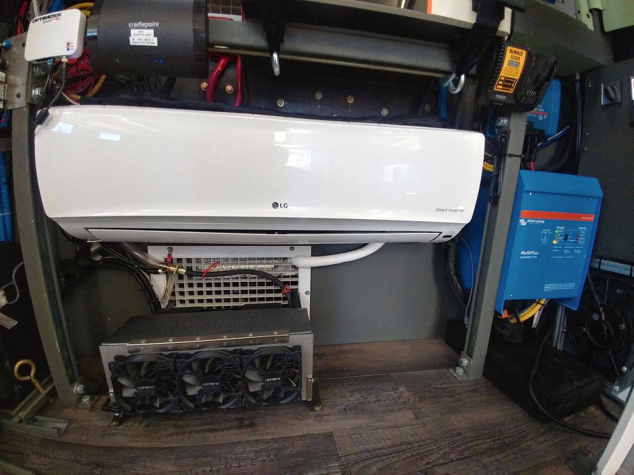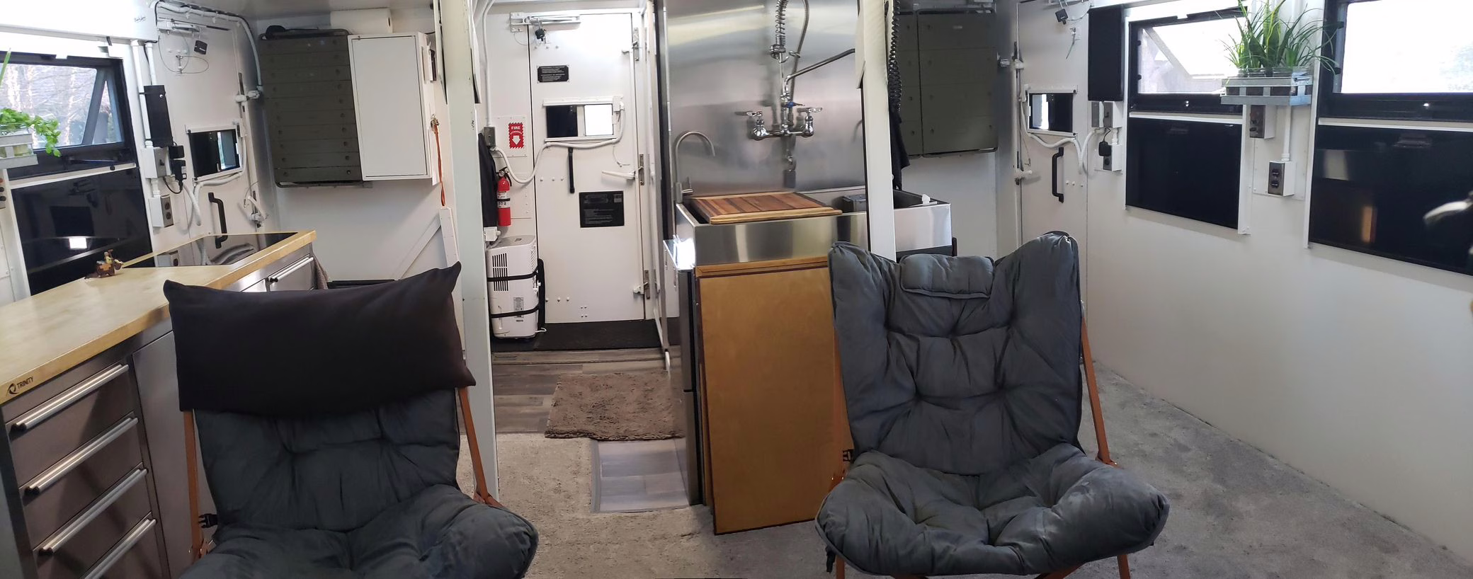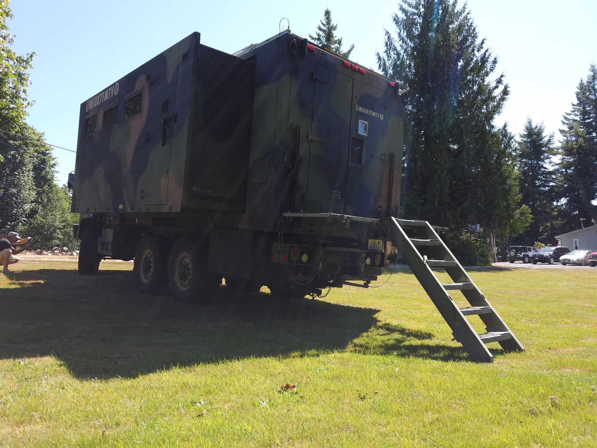 Originally configured as a command center with expandable side panels, this M1087 was converted into an RV with extra insulation, flooring, a 60-gallon fresh water tank, a stainless-steel shower, a Vitrifrigo DRW180 refrigerator and freezer unit, a Sony X750H 55-inch 4K Ultra HD LED television, a king-sized memory foam mattress on a lift system, a cassette toilet, roof-mounted solar panels, Guangzhou Felicity Solar Technology LiFePO4 battery packs, and a weBoost cell signal booster, among numerous other modifications. More details about the motorhome conversion are provided below.
