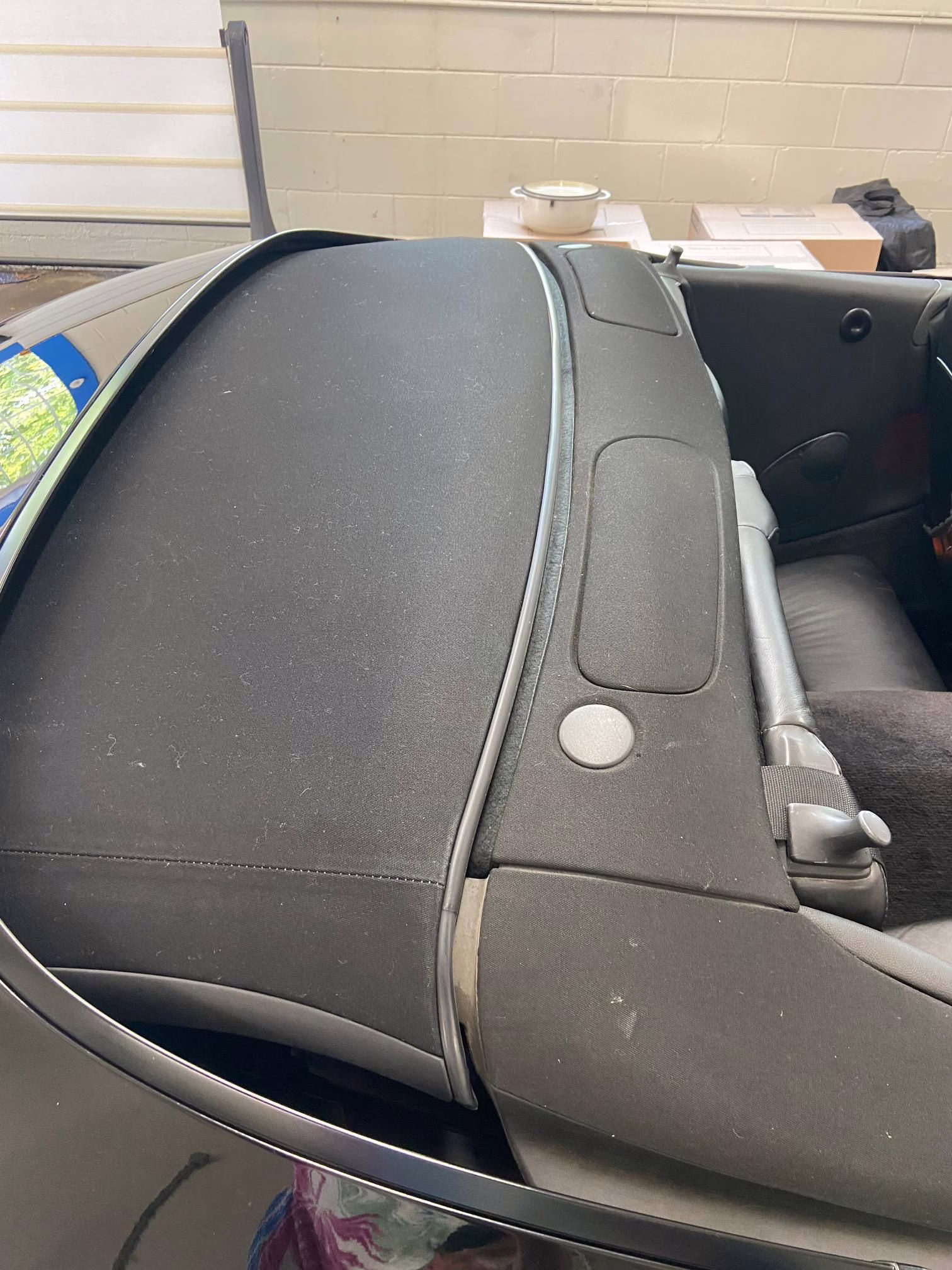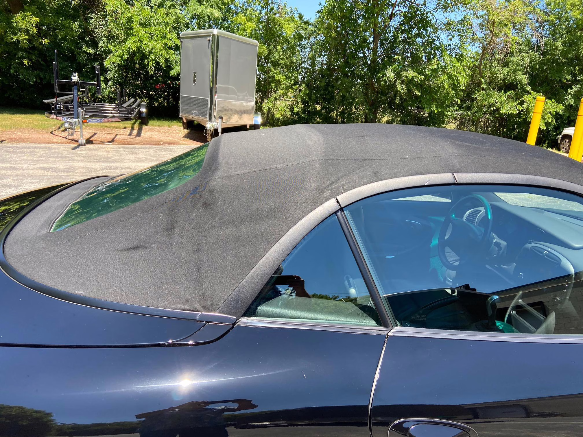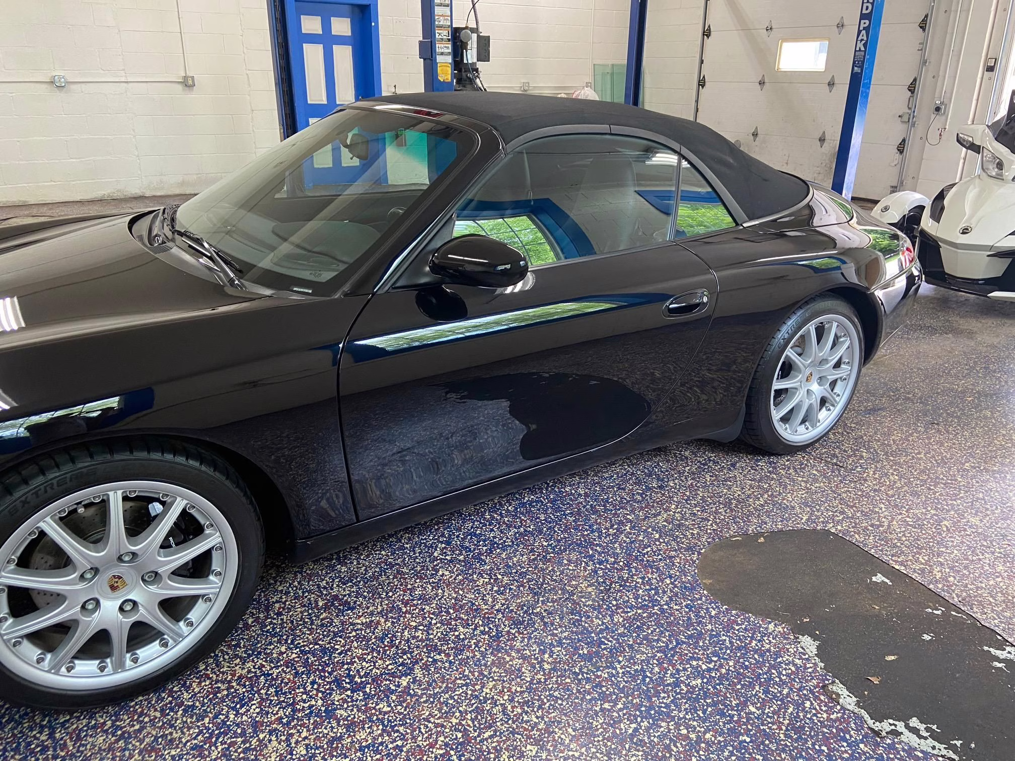 Equipment includes 18-inch Sport Design wheels, a power-operated soft top, limited slip differential, draped leather upholstery, and 8-way power seats. Modifications are limited to an aftermarket sport exhaust, clear side marker lights, and a Kenwood head unit.