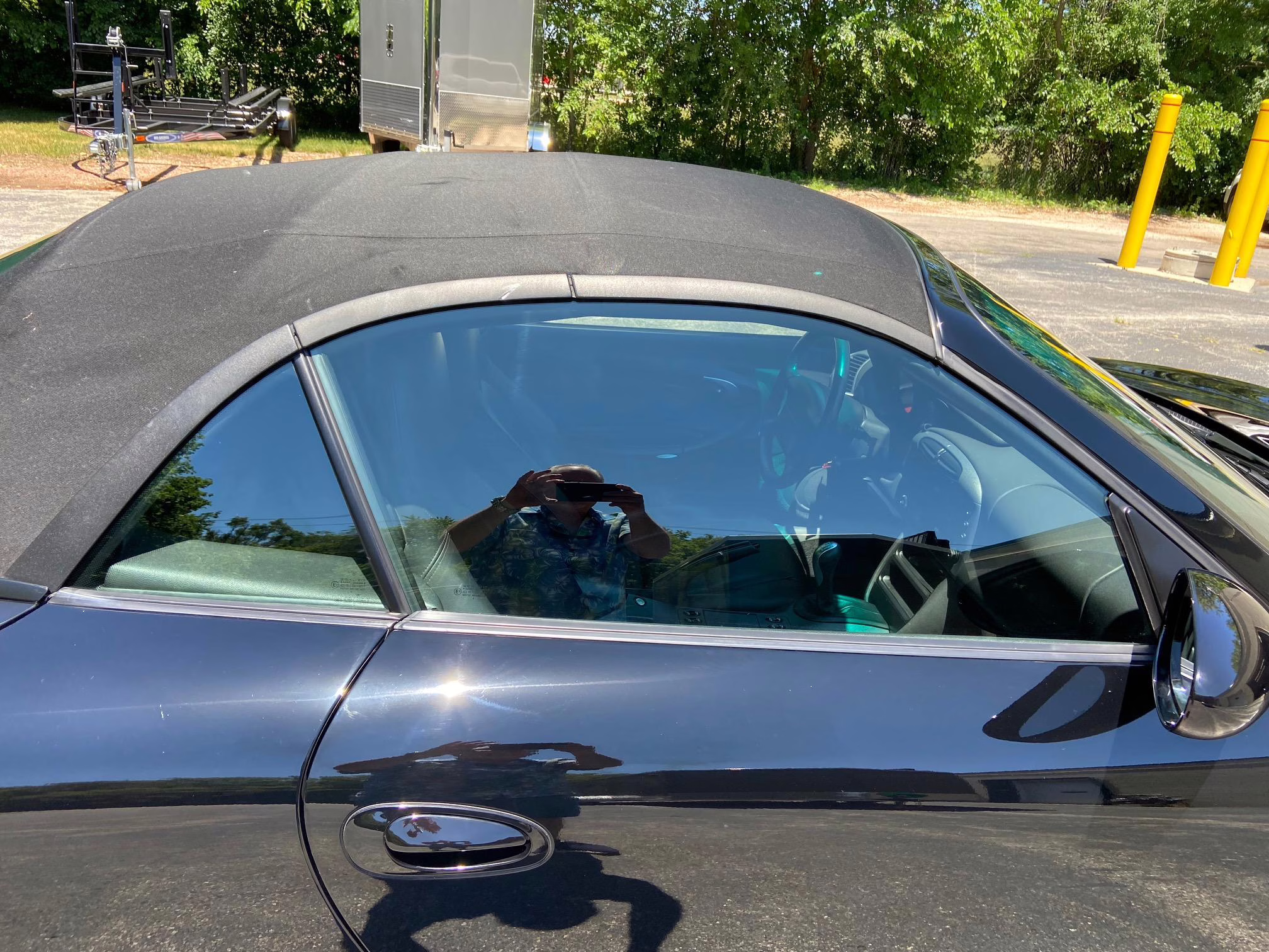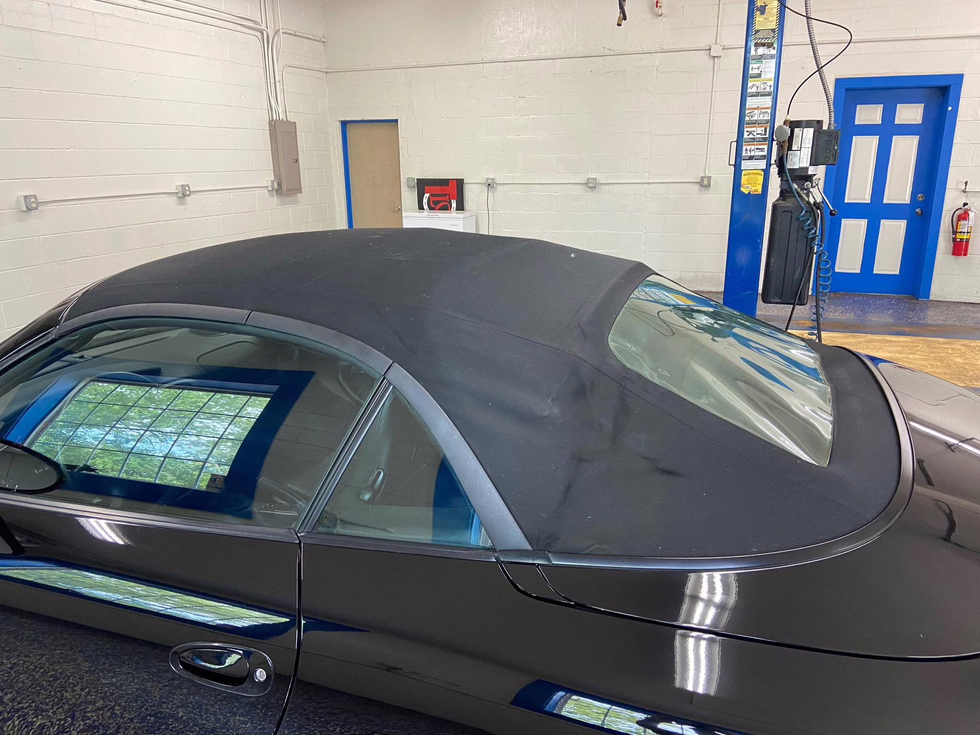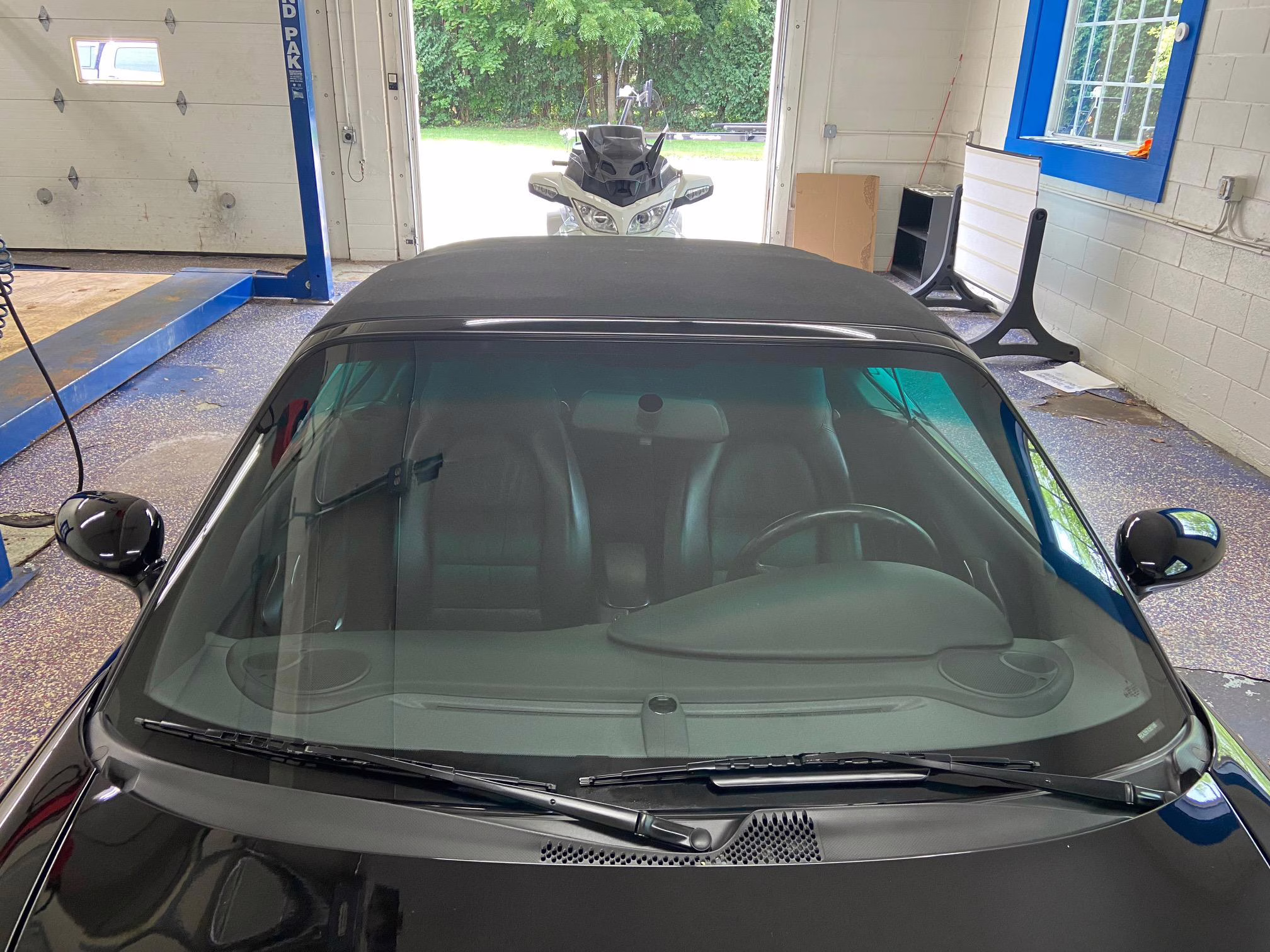 Equipment includes 18-inch Sport Design wheels, a power-operated soft top, limited slip differential, draped leather upholstery, and 8-way power seats. Modifications are limited to an aftermarket sport exhaust, clear side marker lights, and a Kenwood head unit.