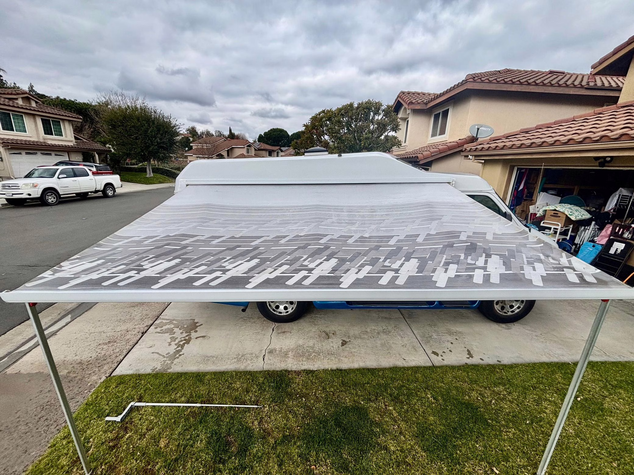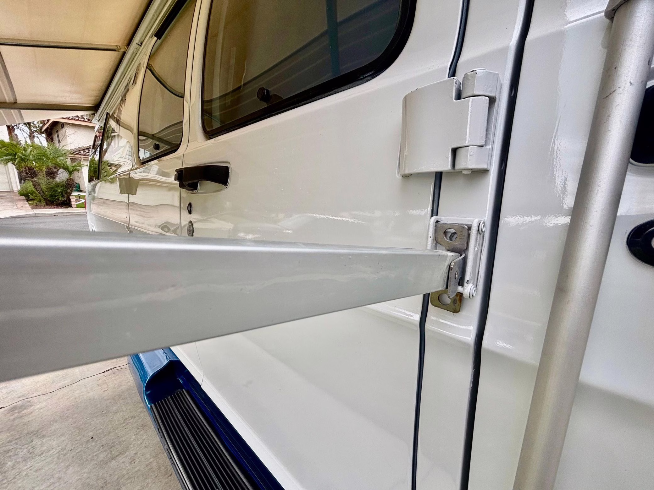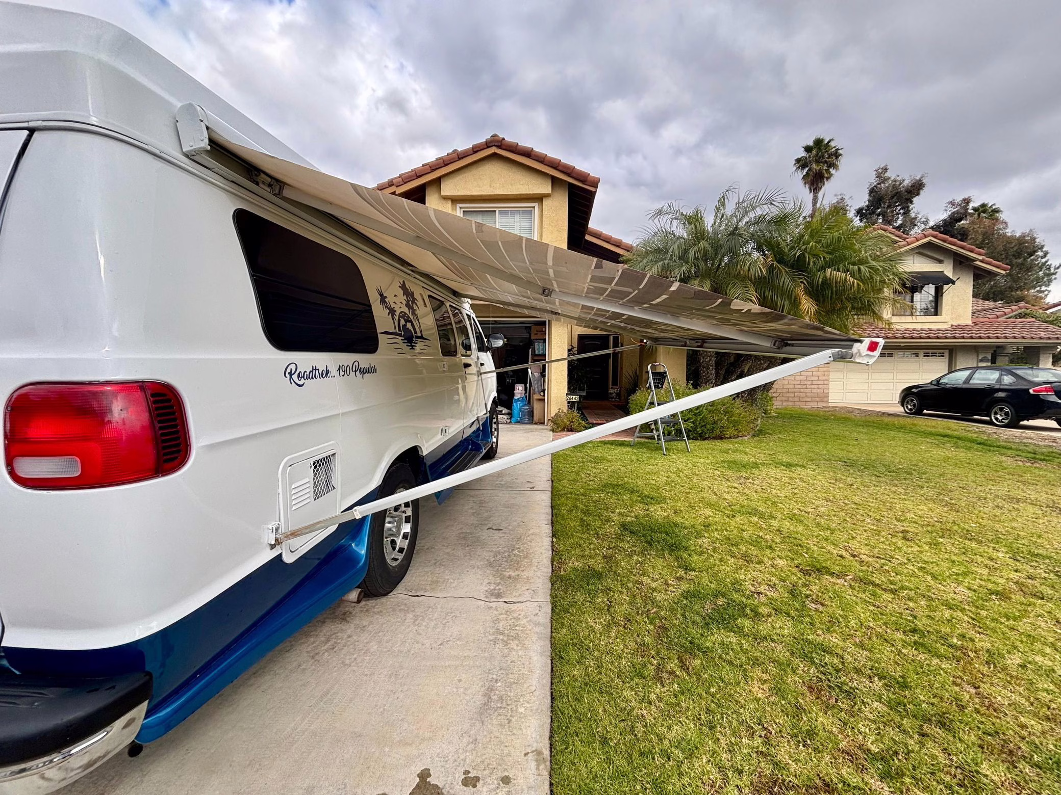 Modifications reported by the seller include a Fiamma F45 awning, running boards, a trailer hitch, two twin beds, a refrigerator with an integrated freezer, a propane-powered stove, a sink, storage cabinets, a toilet, a shower, a Fan-Tastic roof-mounted fan, an Alpine touchscreen, a Supersonic television, a DVD player, household-type power outlets, a 34-gallon fresh water tank, a 29-gallon gray water tank, a water heater, and an Onan generator. The accessories shown in the gallery are included in the sale.