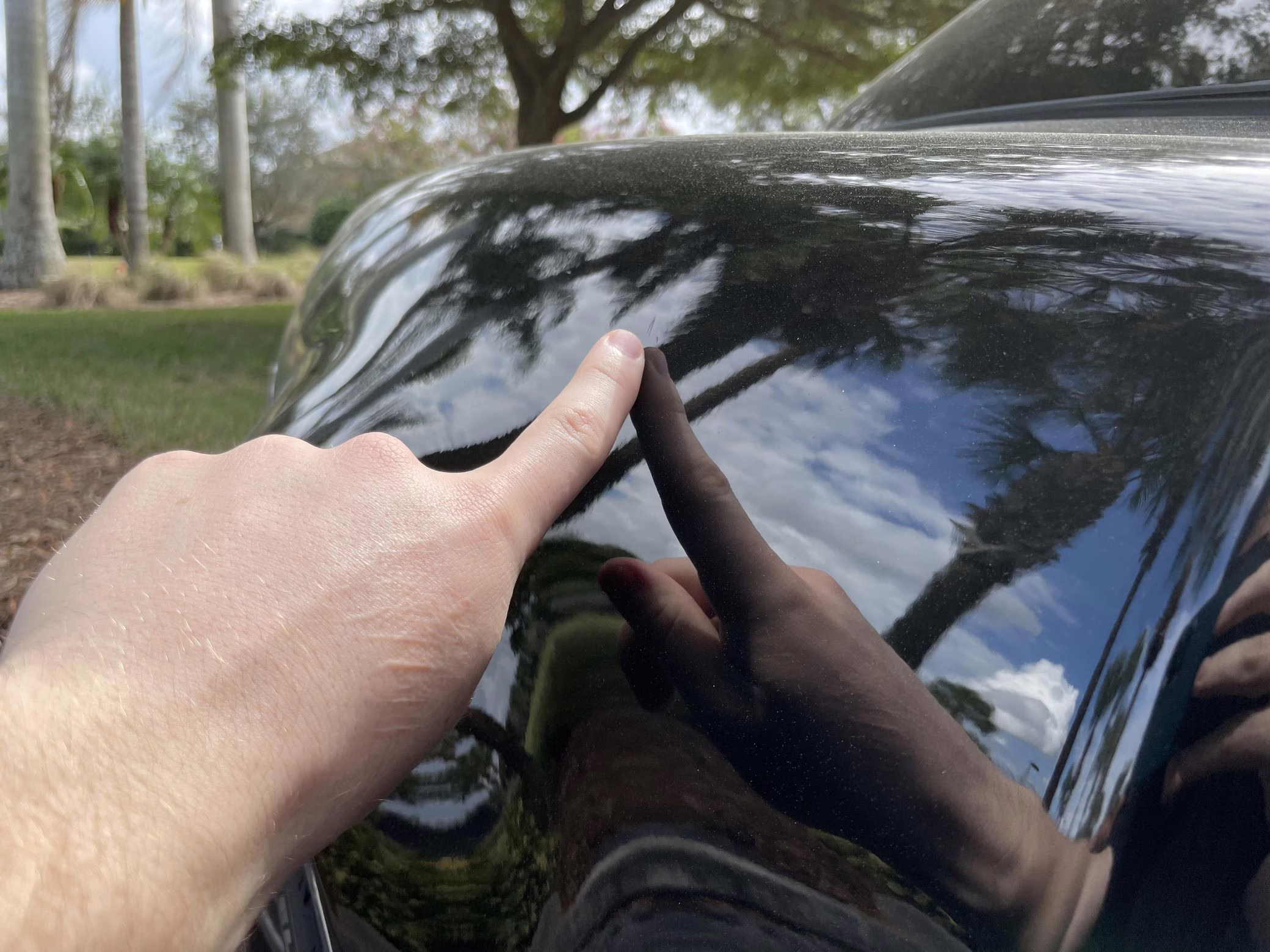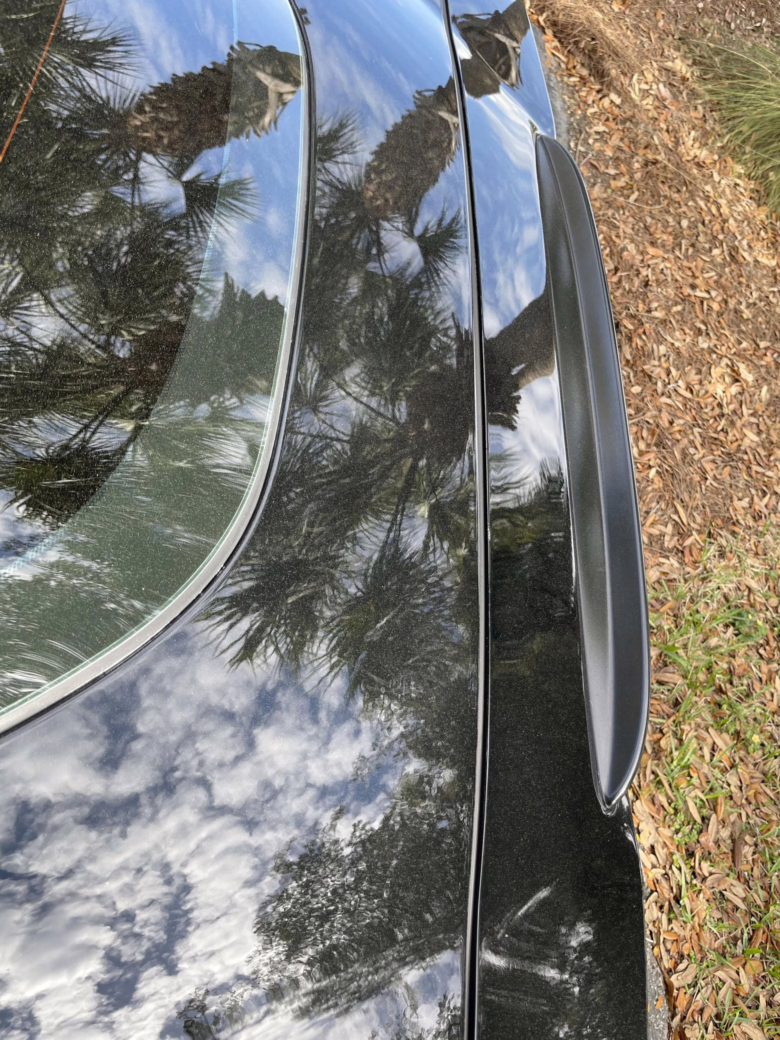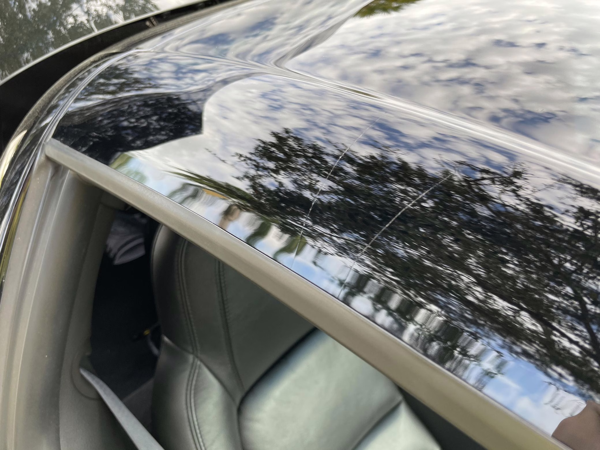 Scratch on passenger-side rear quarter panel, near rear spoiler, and on transparent roof panel