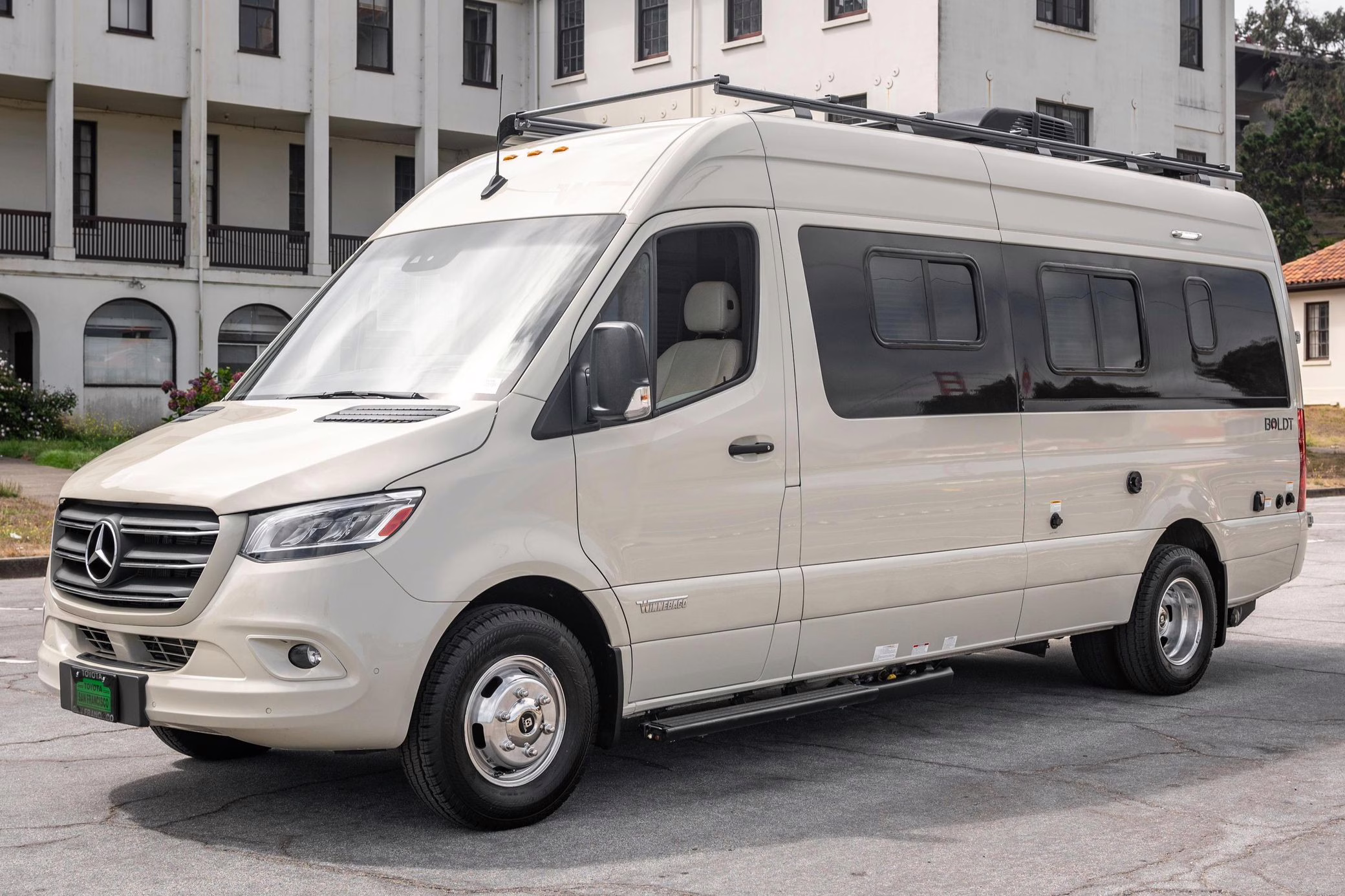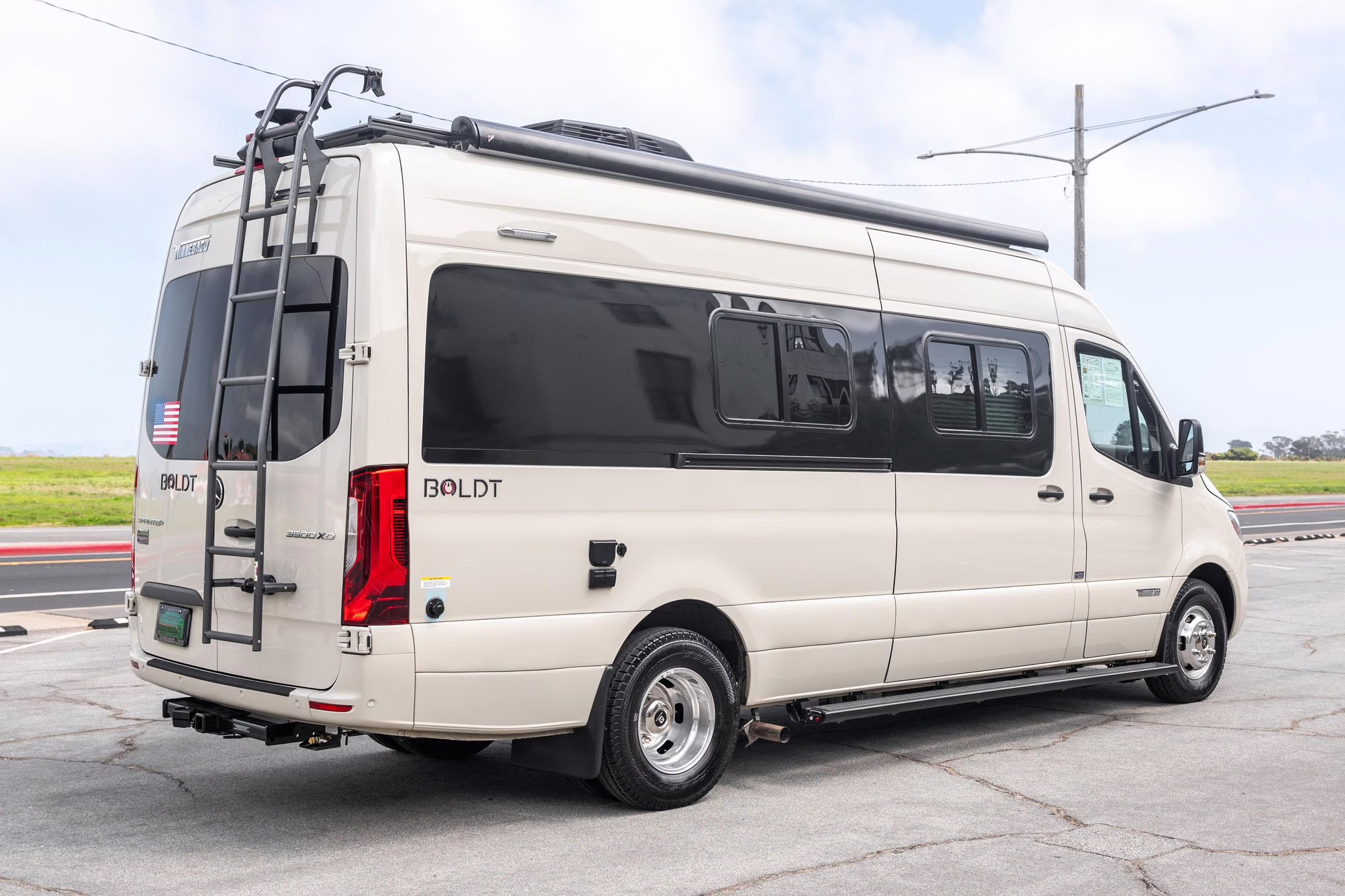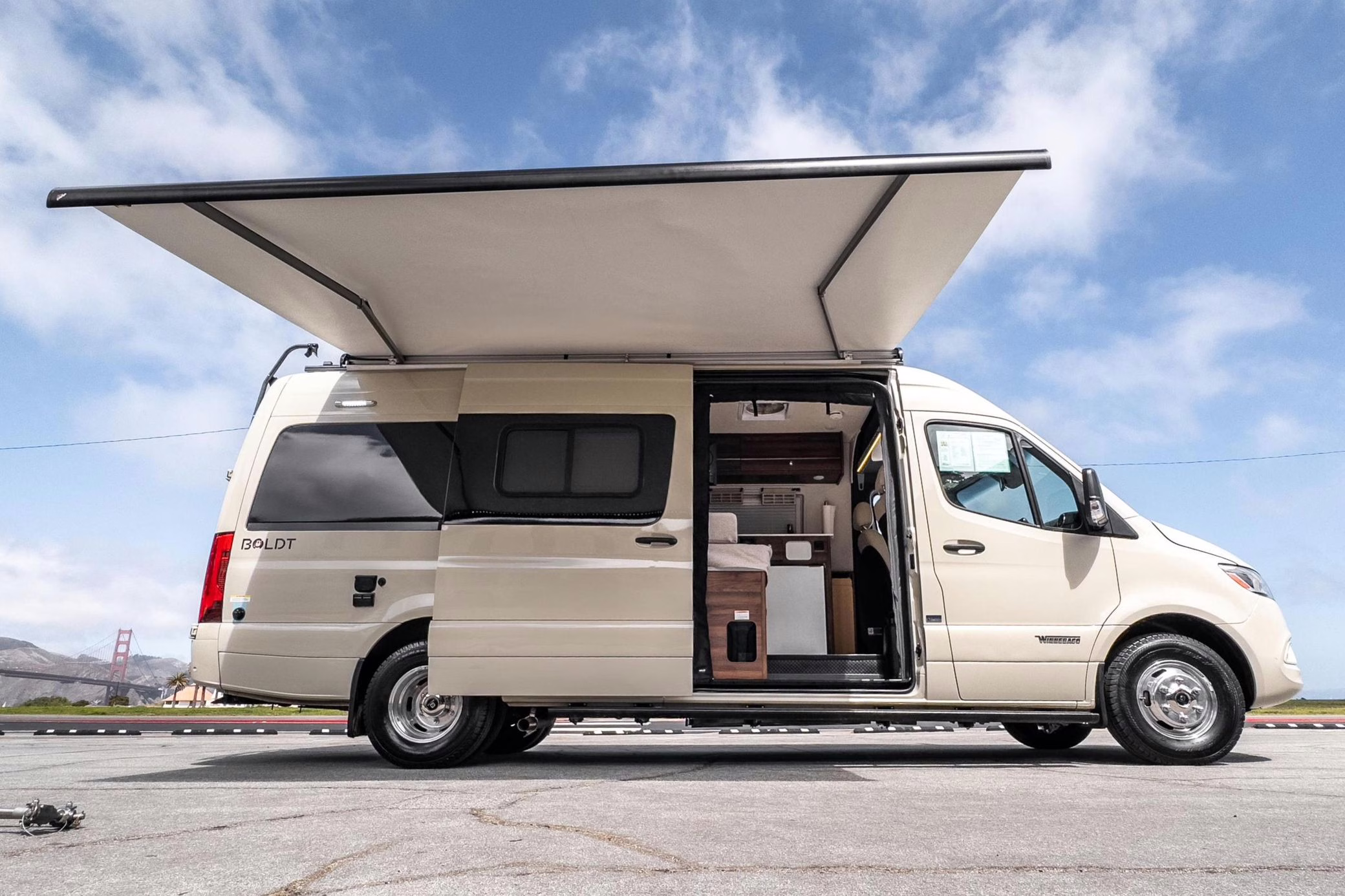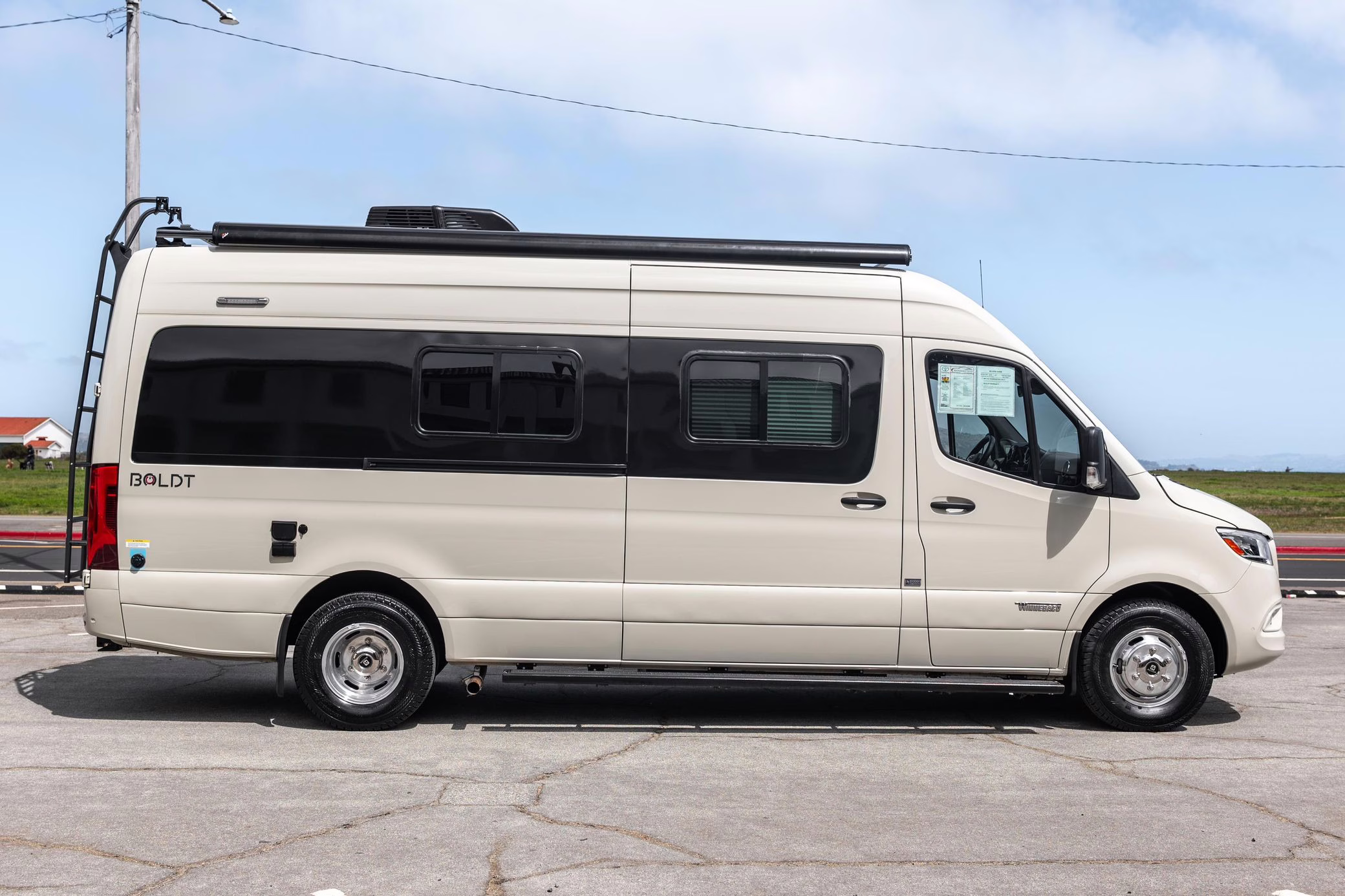 Winnebago Boldt RV conversion (includes side steps, sliding side windows, awning, trailer hitch, rear-mounted ladder, roof rack, 16-inch wheels, Katzkin leather upholstery, twin folding beds, countertop, folding table, Nova Kool fridge, High Pointe microwave, single-burner induction cooktop, stainless-steel sink, shower, toilet, storage cabinets, wardrobe with adjustable and removable shelves, vinyl flooring, window shades, door screens, LED interior lighting, roof-mounted vent, Coleman air conditioning system, Truma Combi Eco Plus heater, electrical outlets, USB charging ports, television, KING OmniGo antenna, roof-mounted solar panels, inverter, AC/DC load center/converter, and systems monitoring panel)