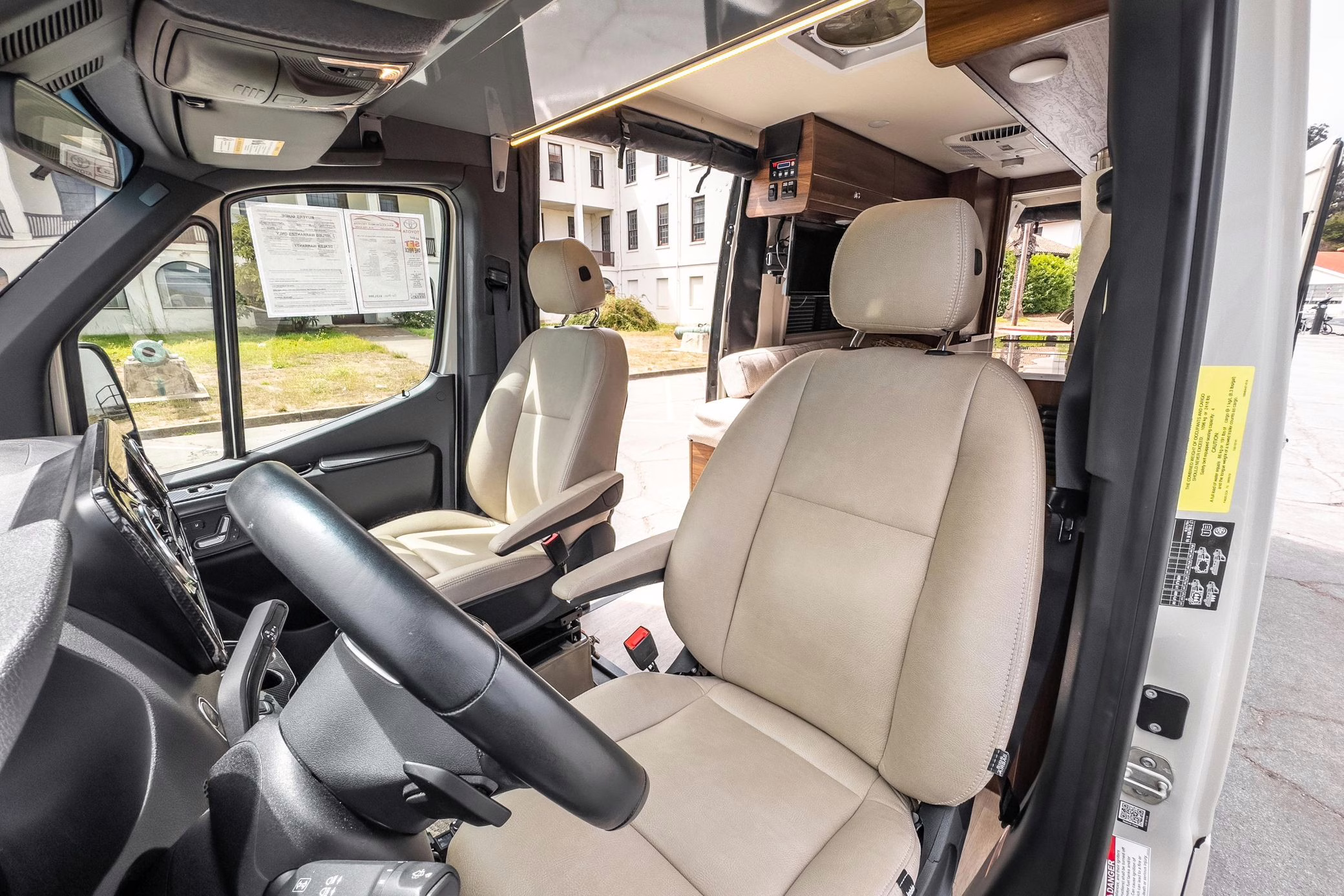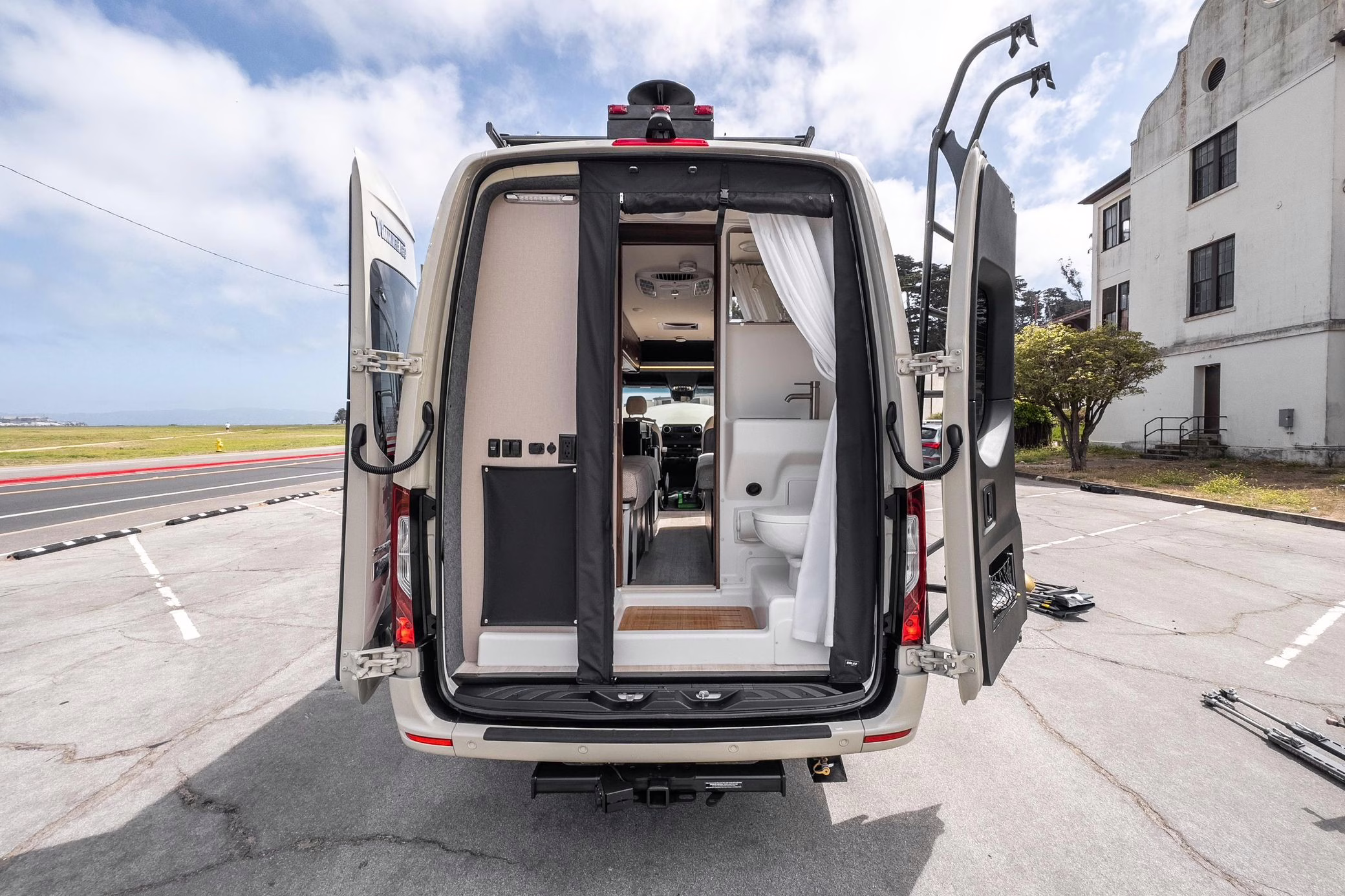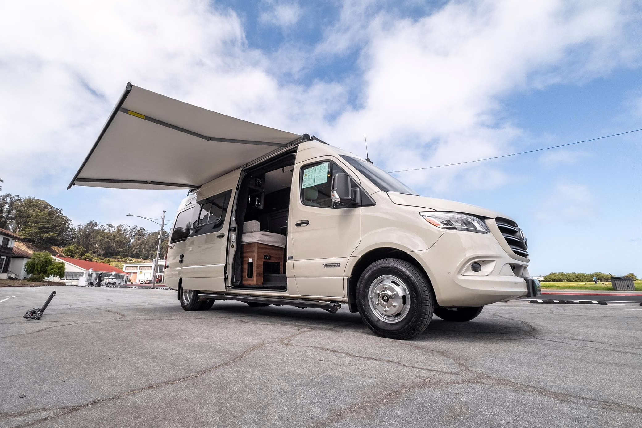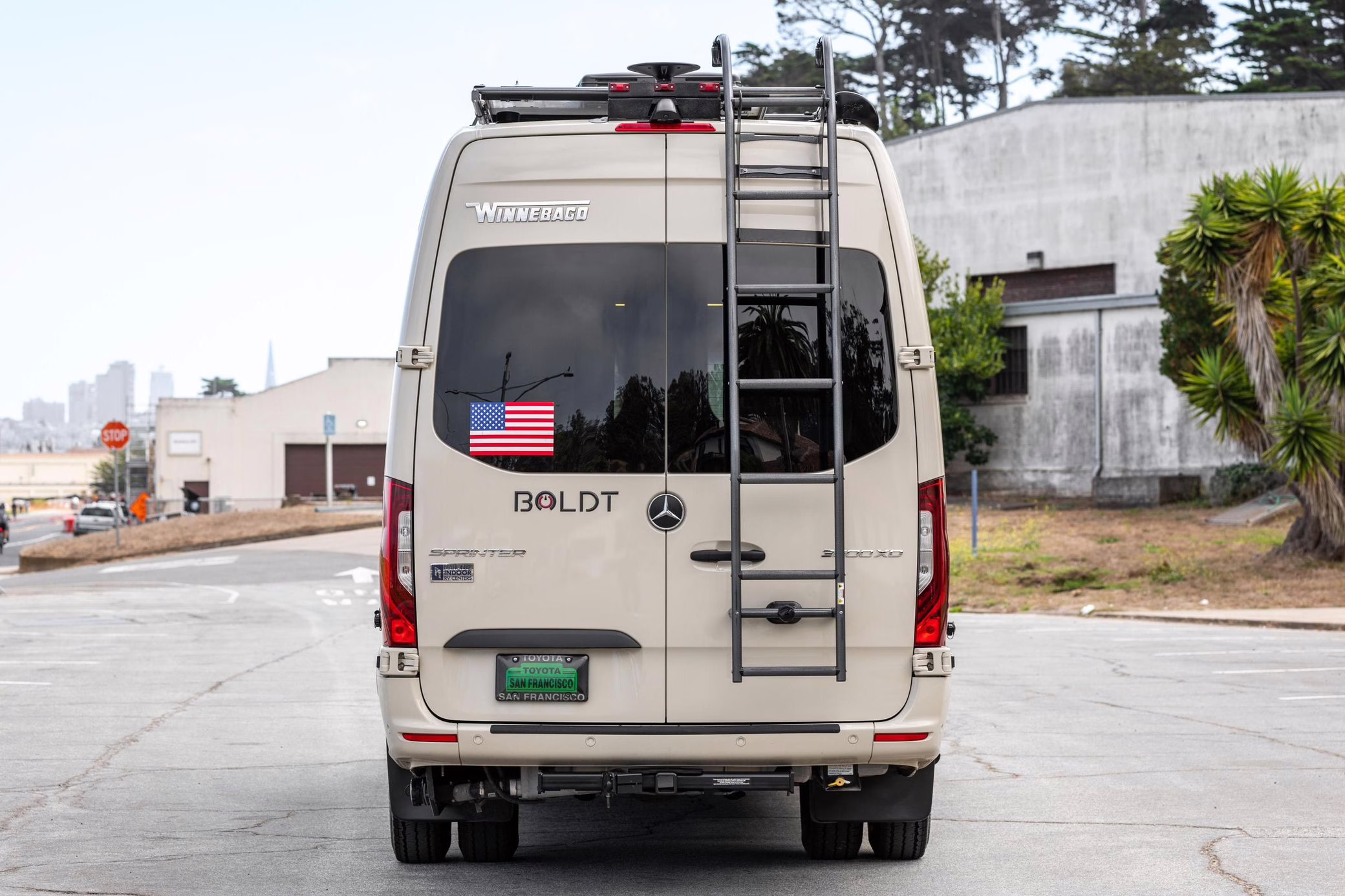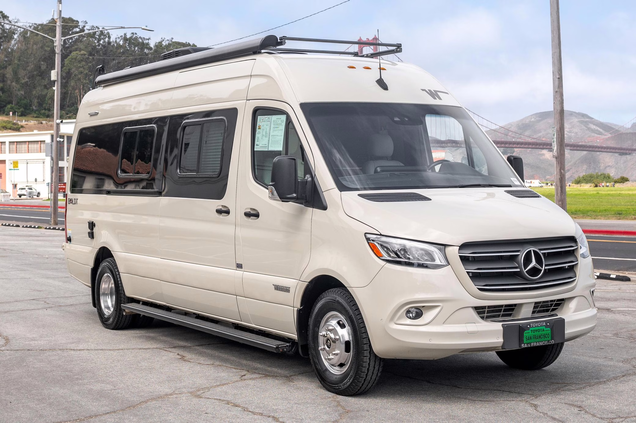 Winnebago Boldt RV conversion (includes side steps, sliding side windows, awning, trailer hitch, rear-mounted ladder, roof rack, 16-inch wheels, Katzkin leather upholstery, twin folding beds, countertop, folding table, Nova Kool fridge, High Pointe microwave, single-burner induction cooktop, stainless-steel sink, shower, toilet, storage cabinets, wardrobe with adjustable and removable shelves, vinyl flooring, window shades, door screens, LED interior lighting, roof-mounted vent, Coleman air conditioning system, Truma Combi Eco Plus heater, electrical outlets, USB charging ports, television, KING OmniGo antenna, roof-mounted solar panels, inverter, AC/DC load center/converter, and systems monitoring panel)