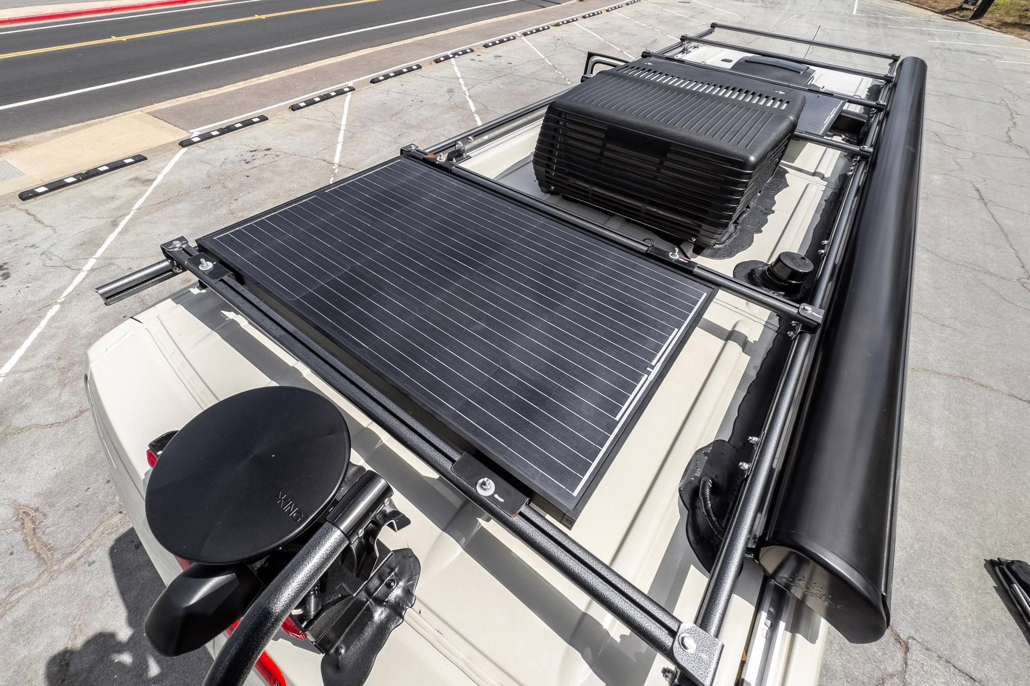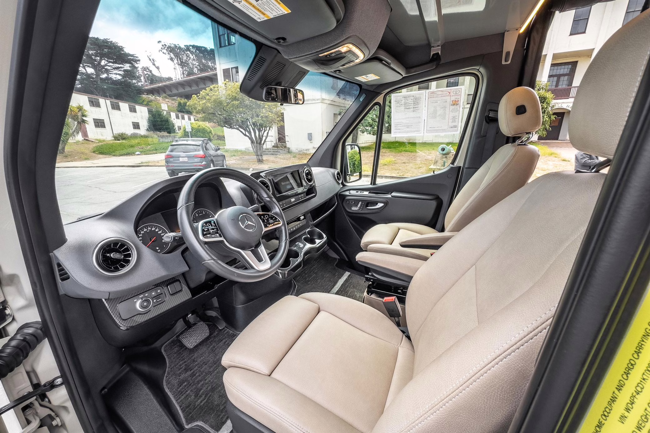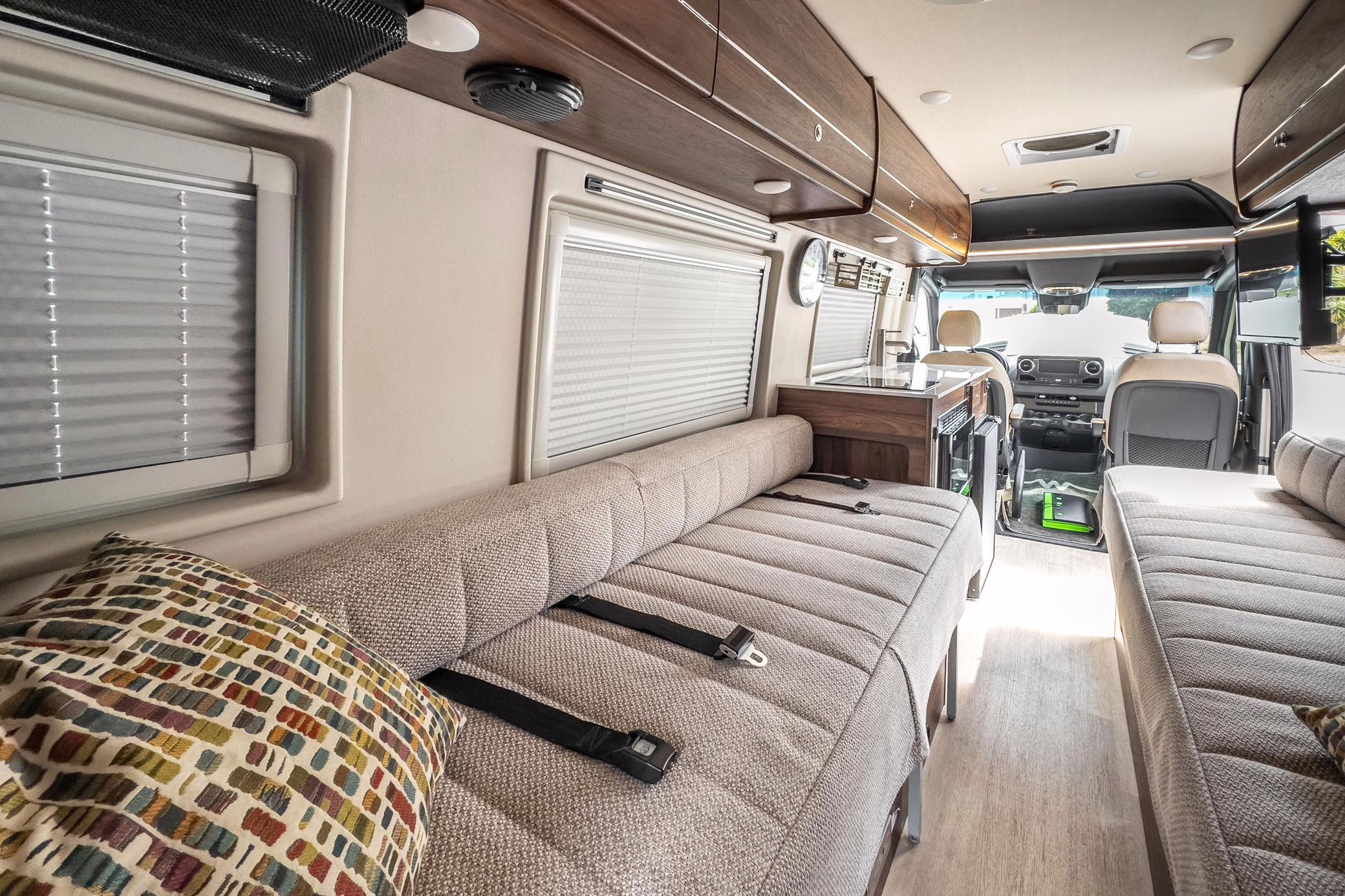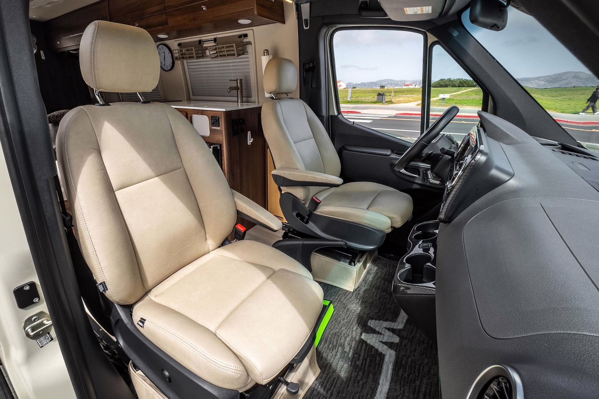 Winnebago Boldt RV conversion (includes side steps, sliding side windows, awning, trailer hitch, rear-mounted ladder, roof rack, 16-inch wheels, Katzkin leather upholstery, twin folding beds, countertop, folding table, Nova Kool fridge, High Pointe microwave, single-burner induction cooktop, stainless-steel sink, shower, toilet, storage cabinets, wardrobe with adjustable and removable shelves, vinyl flooring, window shades, door screens, LED interior lighting, roof-mounted vent, Coleman air conditioning system, Truma Combi Eco Plus heater, electrical outlets, USB charging ports, television, KING OmniGo antenna, roof-mounted solar panels, inverter, AC/DC load center/converter, and systems monitoring panel)