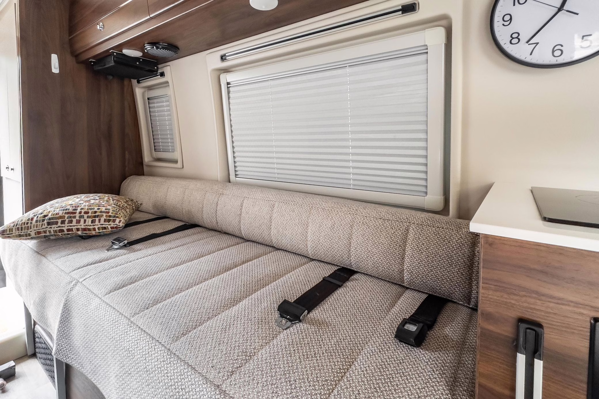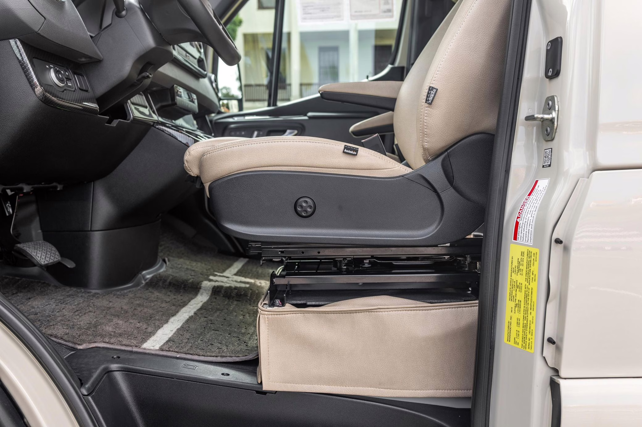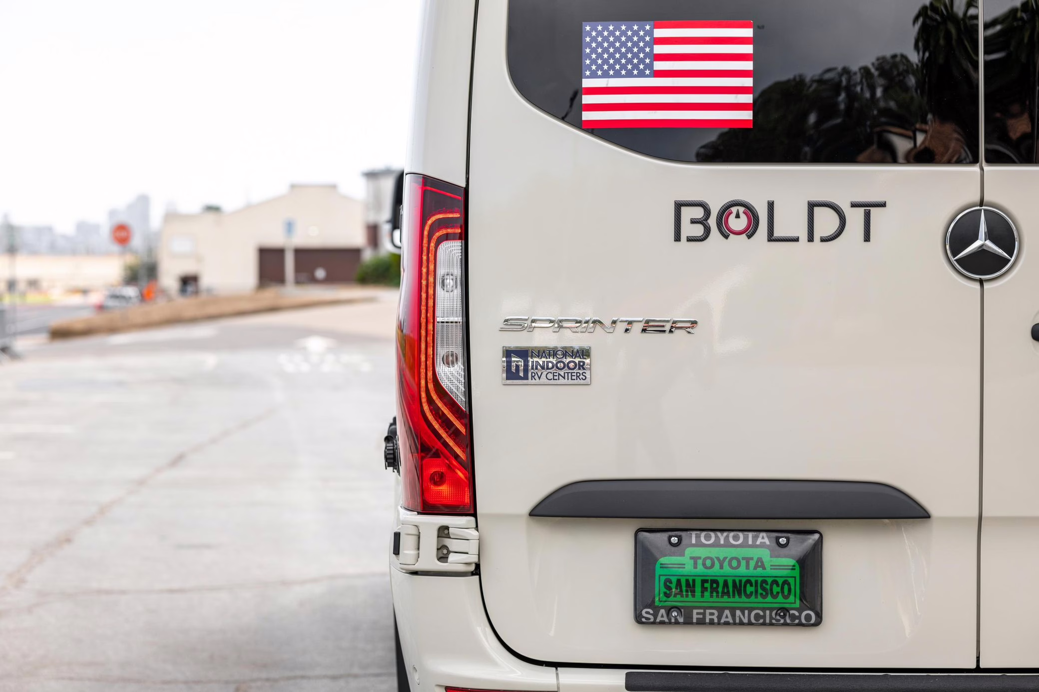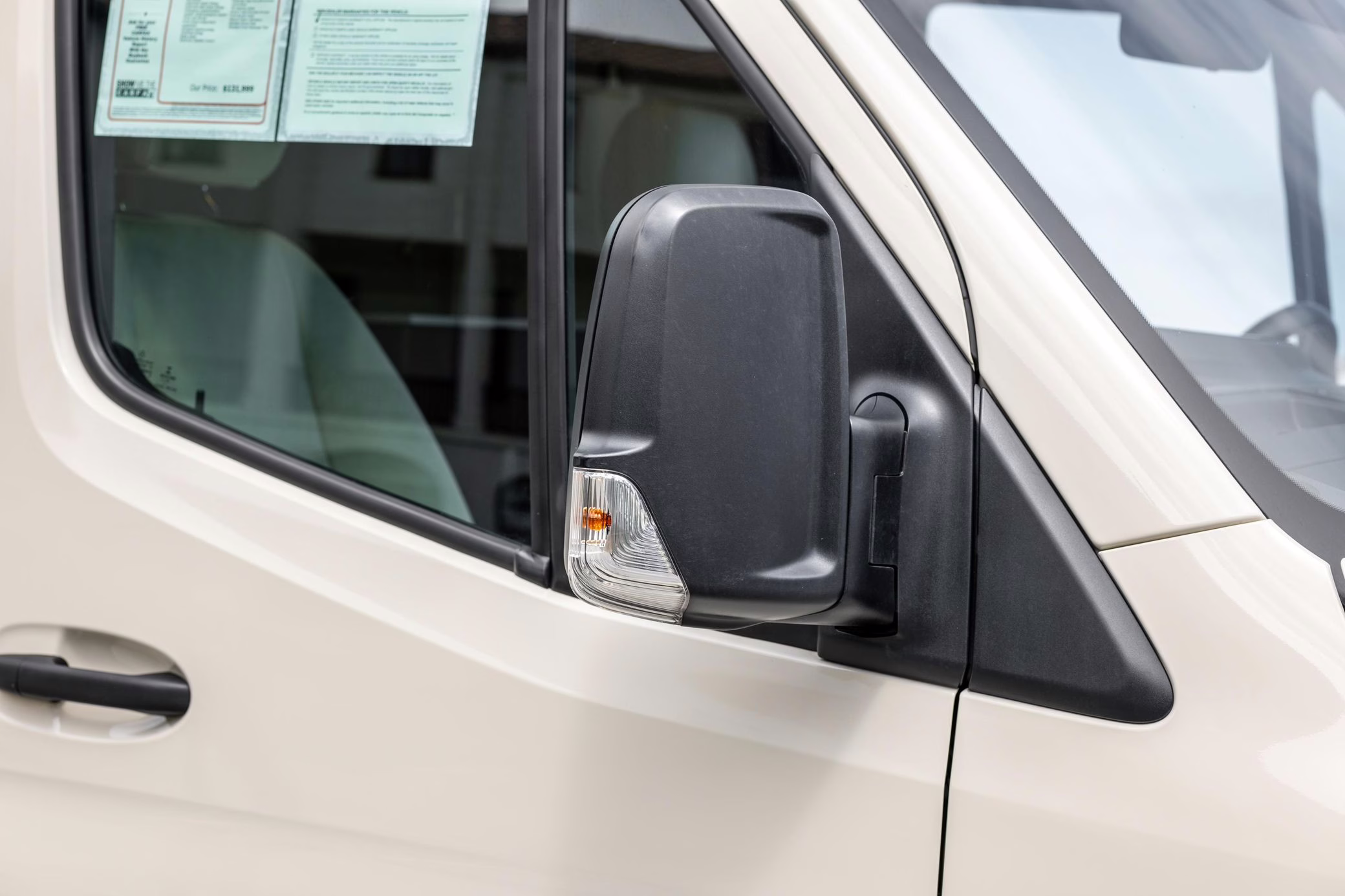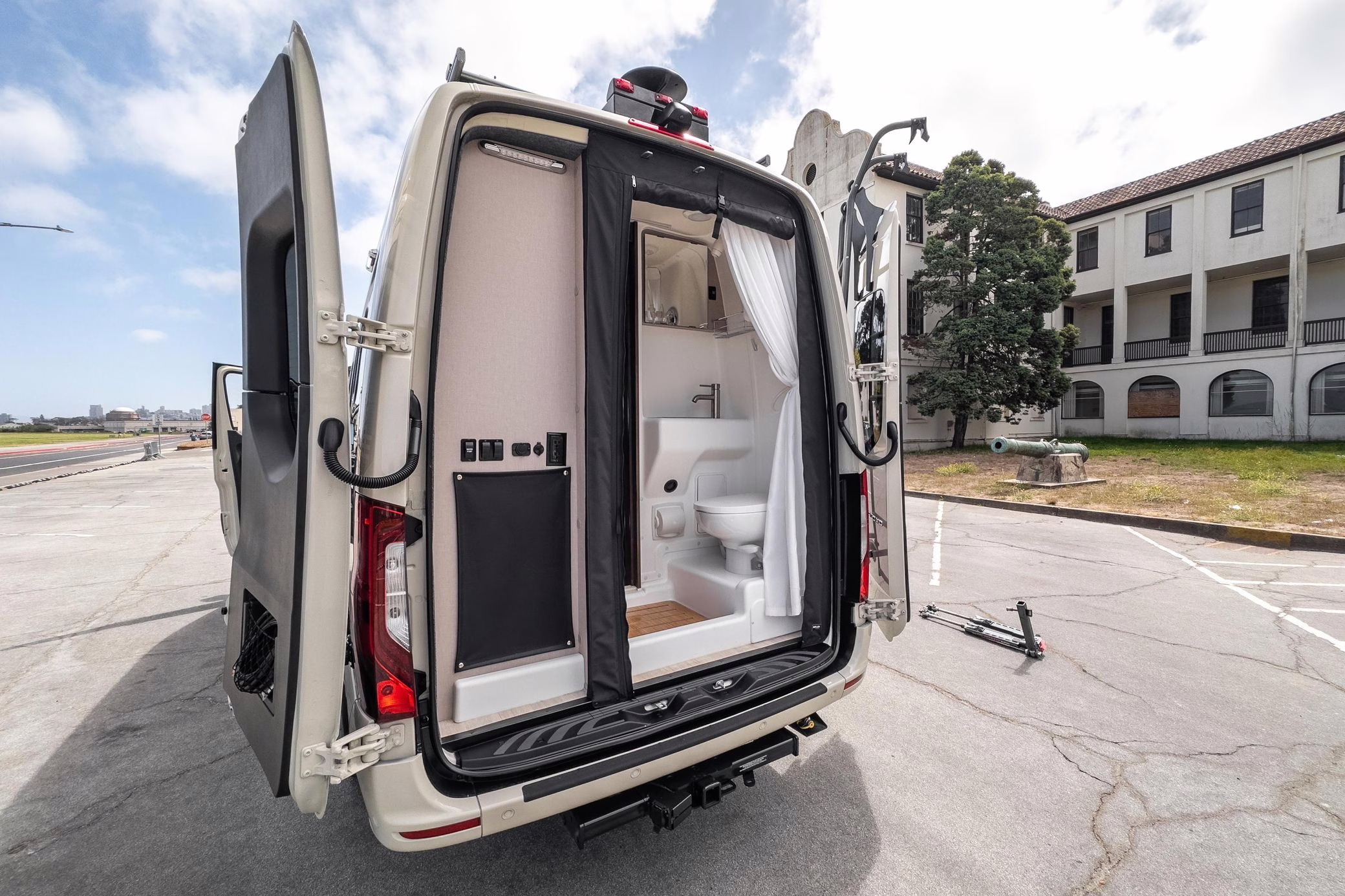 Winnebago Boldt RV conversion (includes side steps, sliding side windows, awning, trailer hitch, rear-mounted ladder, roof rack, 16-inch wheels, Katzkin leather upholstery, twin folding beds, countertop, folding table, Nova Kool fridge, High Pointe microwave, single-burner induction cooktop, stainless-steel sink, shower, toilet, storage cabinets, wardrobe with adjustable and removable shelves, vinyl flooring, window shades, door screens, LED interior lighting, roof-mounted vent, Coleman air conditioning system, Truma Combi Eco Plus heater, electrical outlets, USB charging ports, television, KING OmniGo antenna, roof-mounted solar panels, inverter, AC/DC load center/converter, and systems monitoring panel)