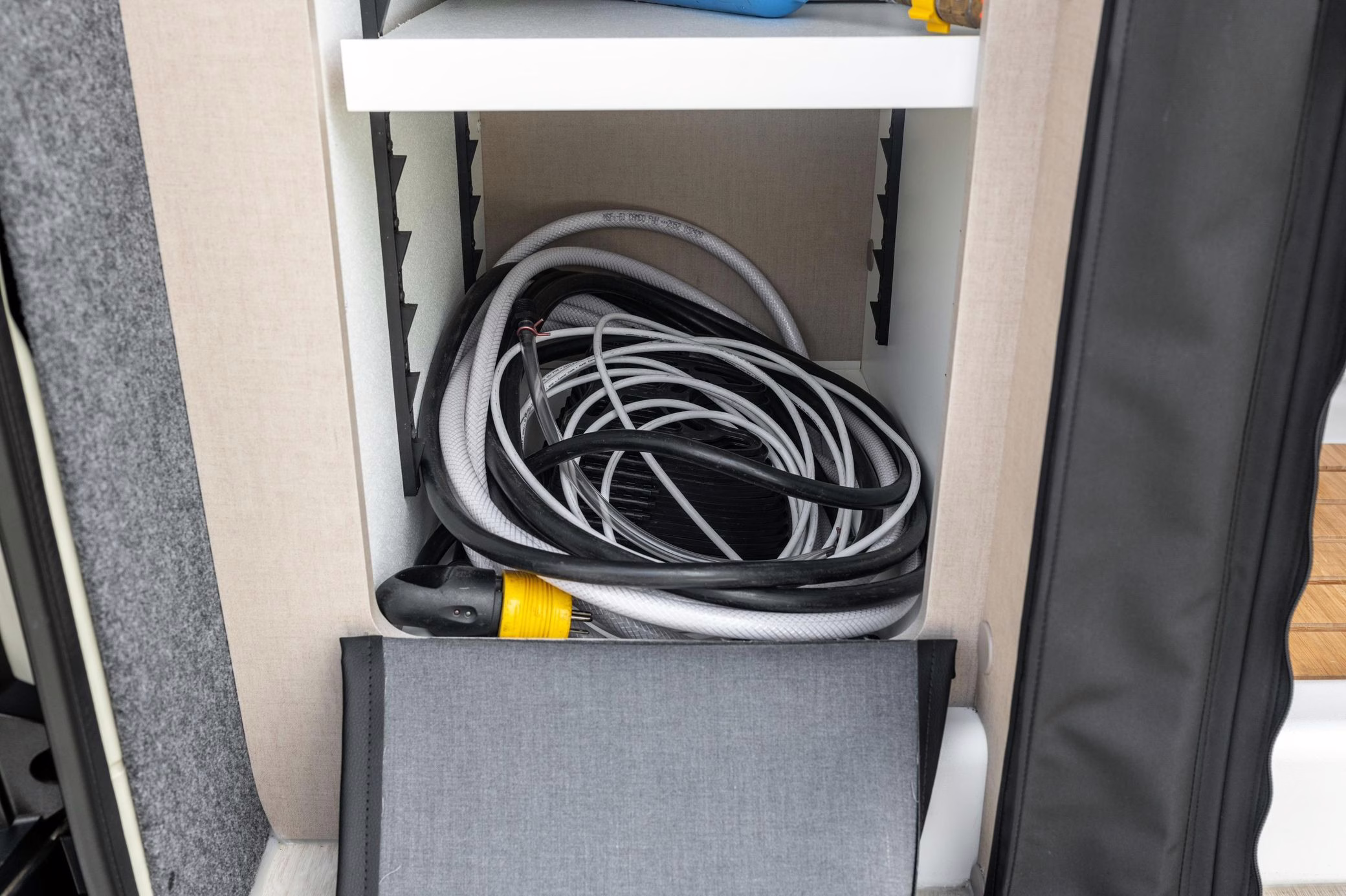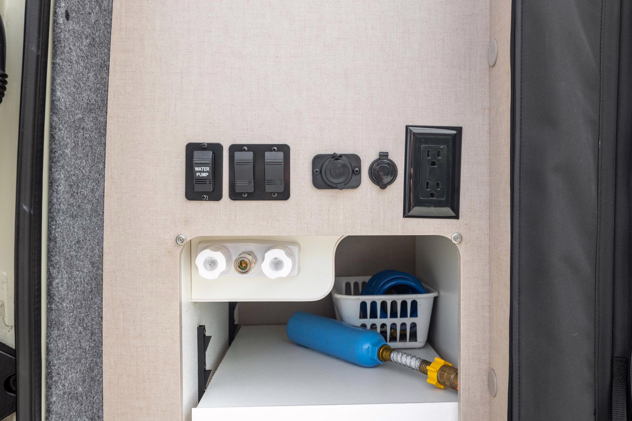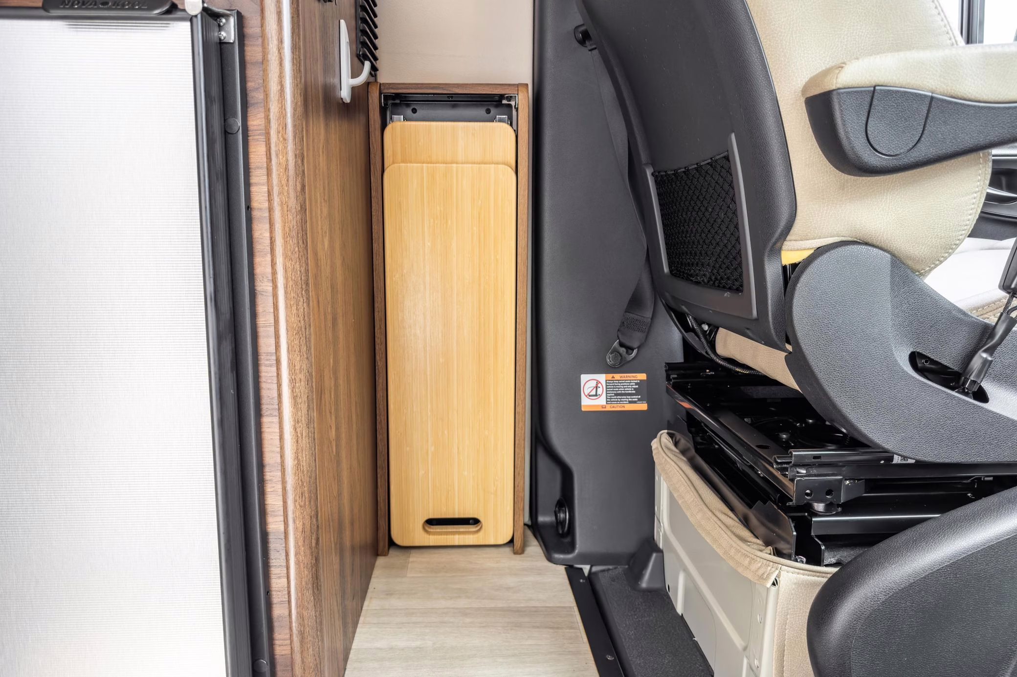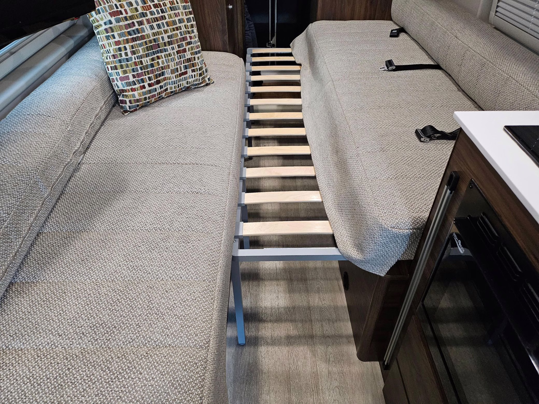 Winnebago Boldt RV conversion (includes side steps, sliding side windows, awning, trailer hitch, rear-mounted ladder, roof rack, 16-inch wheels, Katzkin leather upholstery, twin folding beds, countertop, folding table, Nova Kool fridge, High Pointe microwave, single-burner induction cooktop, stainless-steel sink, shower, toilet, storage cabinets, wardrobe with adjustable and removable shelves, vinyl flooring, window shades, door screens, LED interior lighting, roof-mounted vent, Coleman air conditioning system, Truma Combi Eco Plus heater, electrical outlets, USB charging ports, television, KING OmniGo antenna, roof-mounted solar panels, inverter, AC/DC load center/converter, and systems monitoring panel)