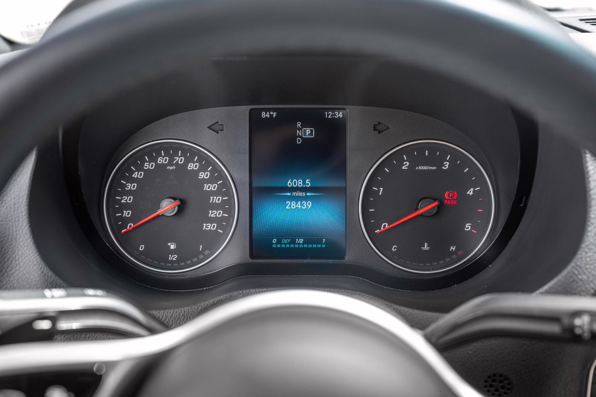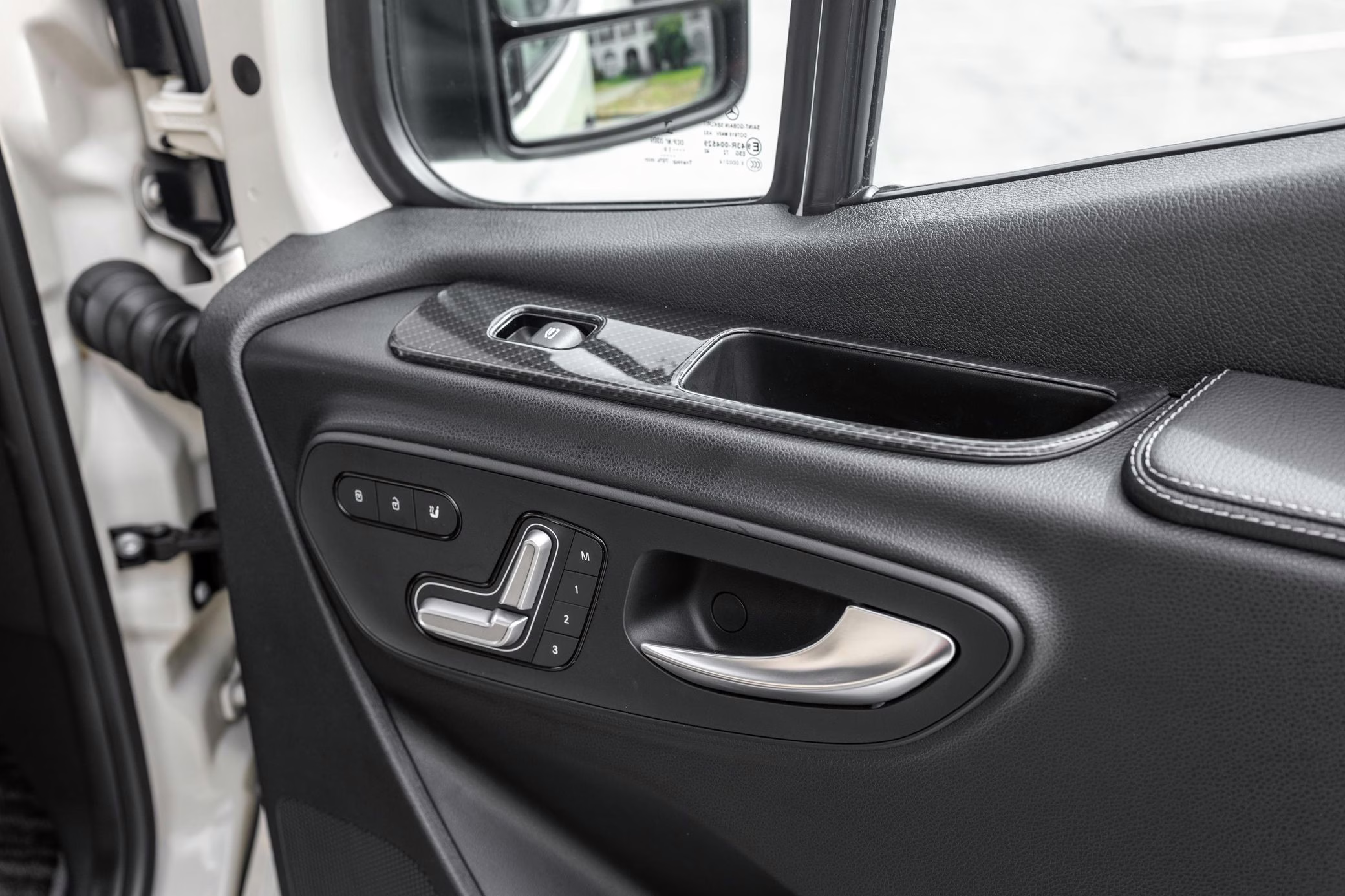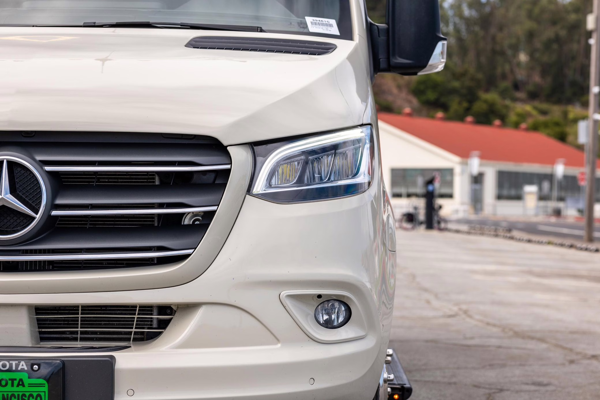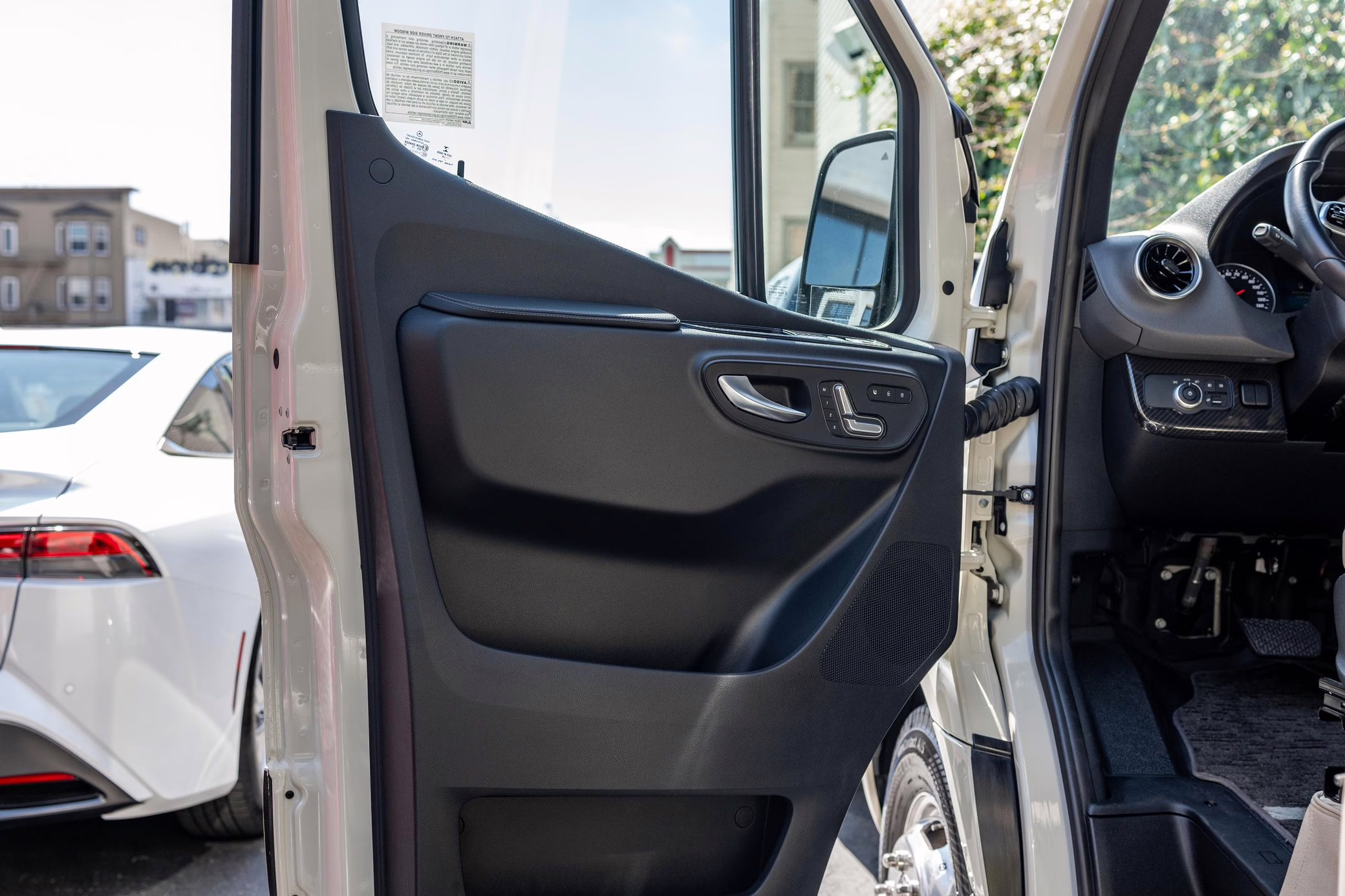 Factory equipment includes LED headlights, a power-operated sliding door, heated, power-adjustable, and swiveling front seats, a wireless device charger, a 10.25-inch touchscreen for the MBUX infotainment system, and crosswind assist, according to a build sheet shown in the gallery.
