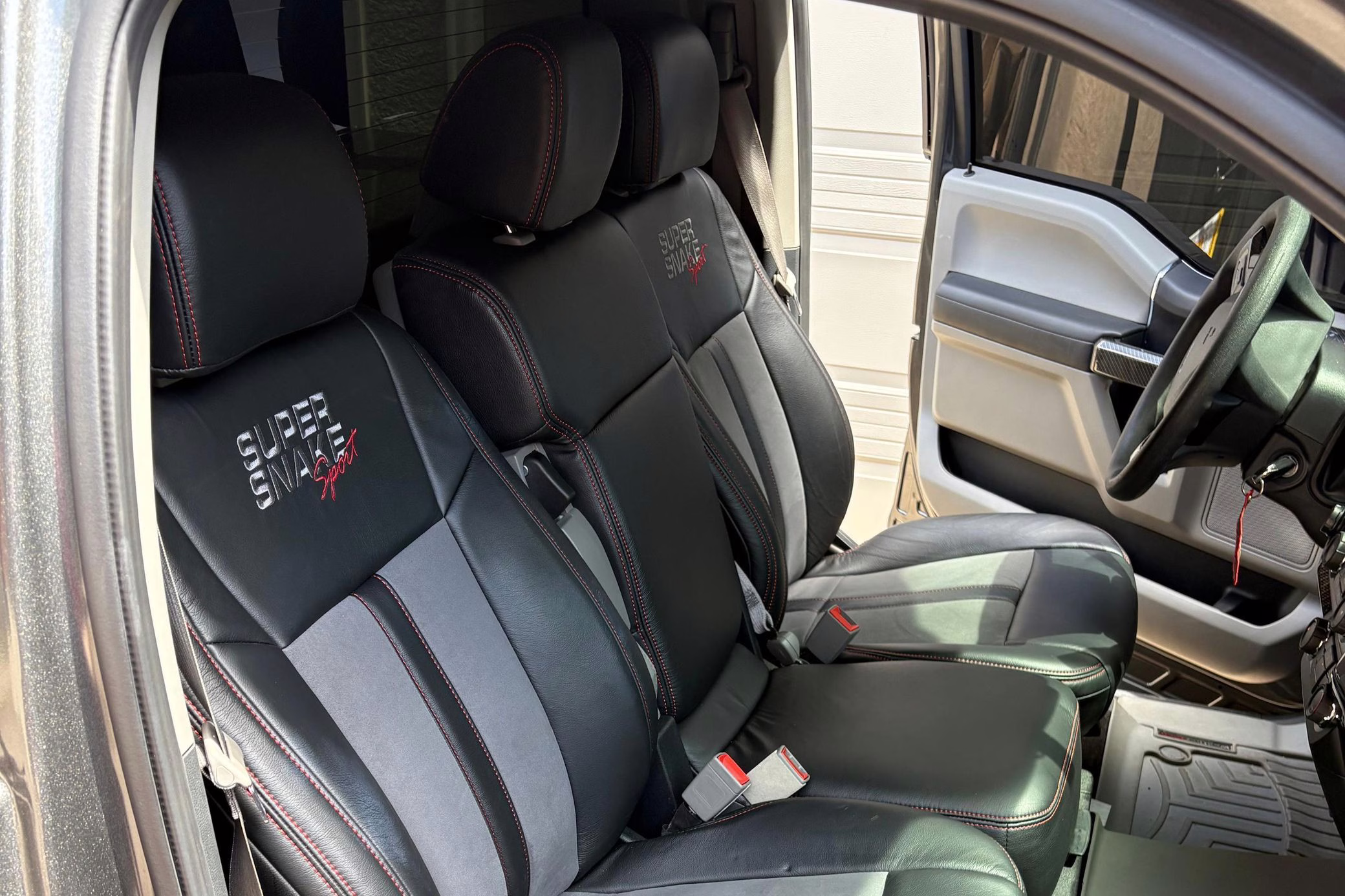 Two-tone leather upholstery with red stitching
