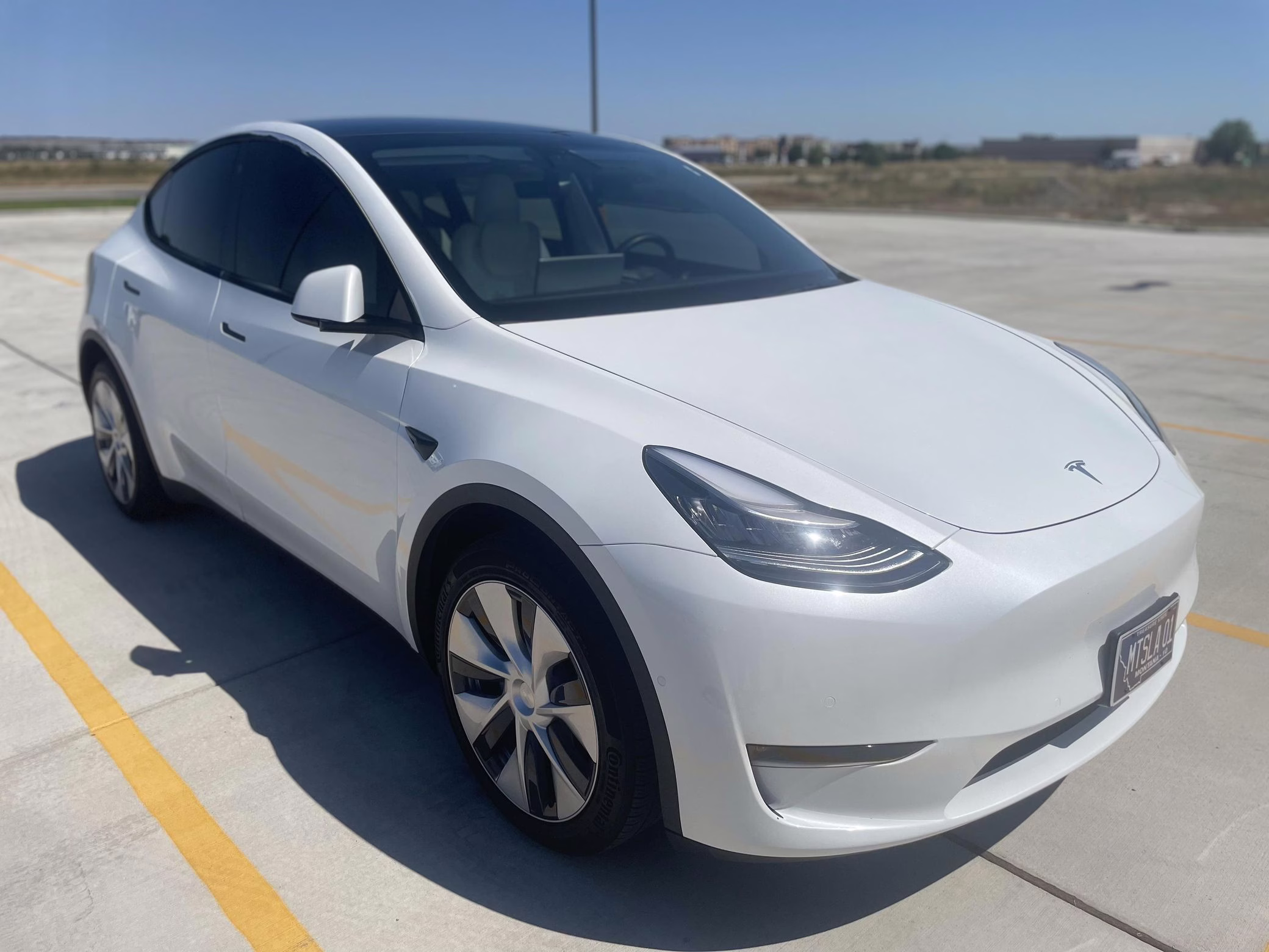 2020 Tesla Model Y Long Range AWD, finished in Pearl White Multi-Coat with a white and black interior.