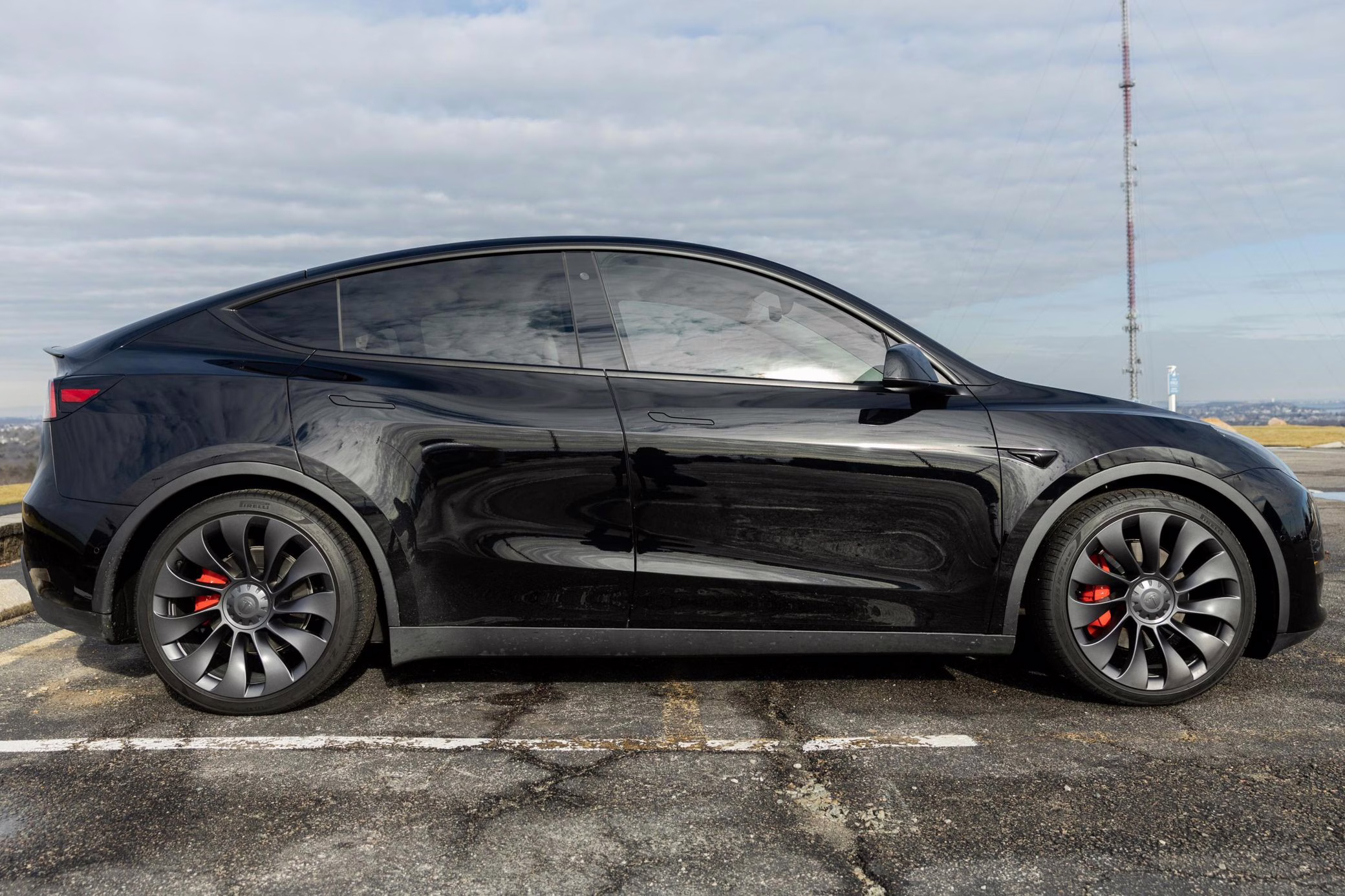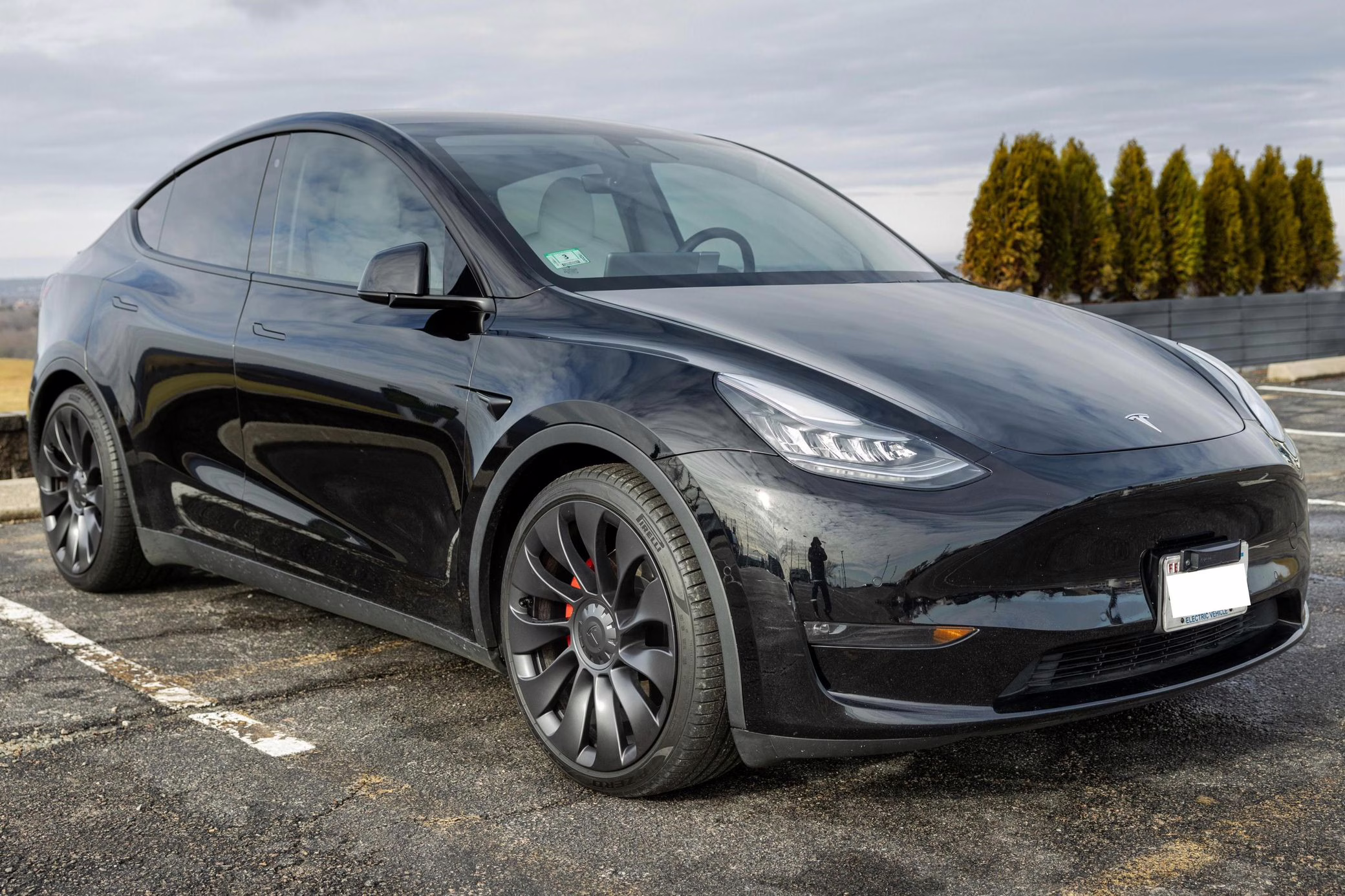 2020 Tesla Model Y Performance, finished in Solid Black with a black and white interior.