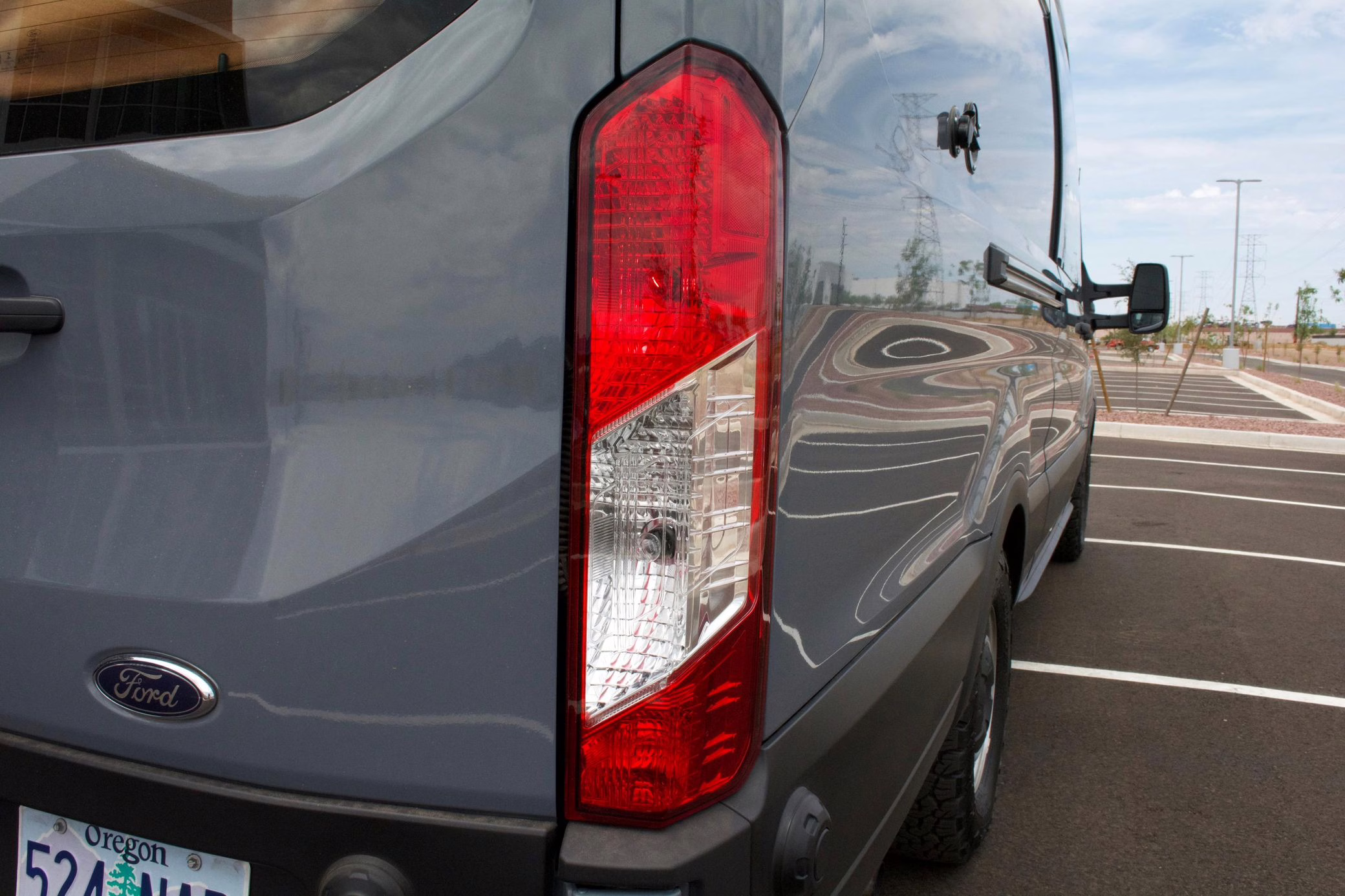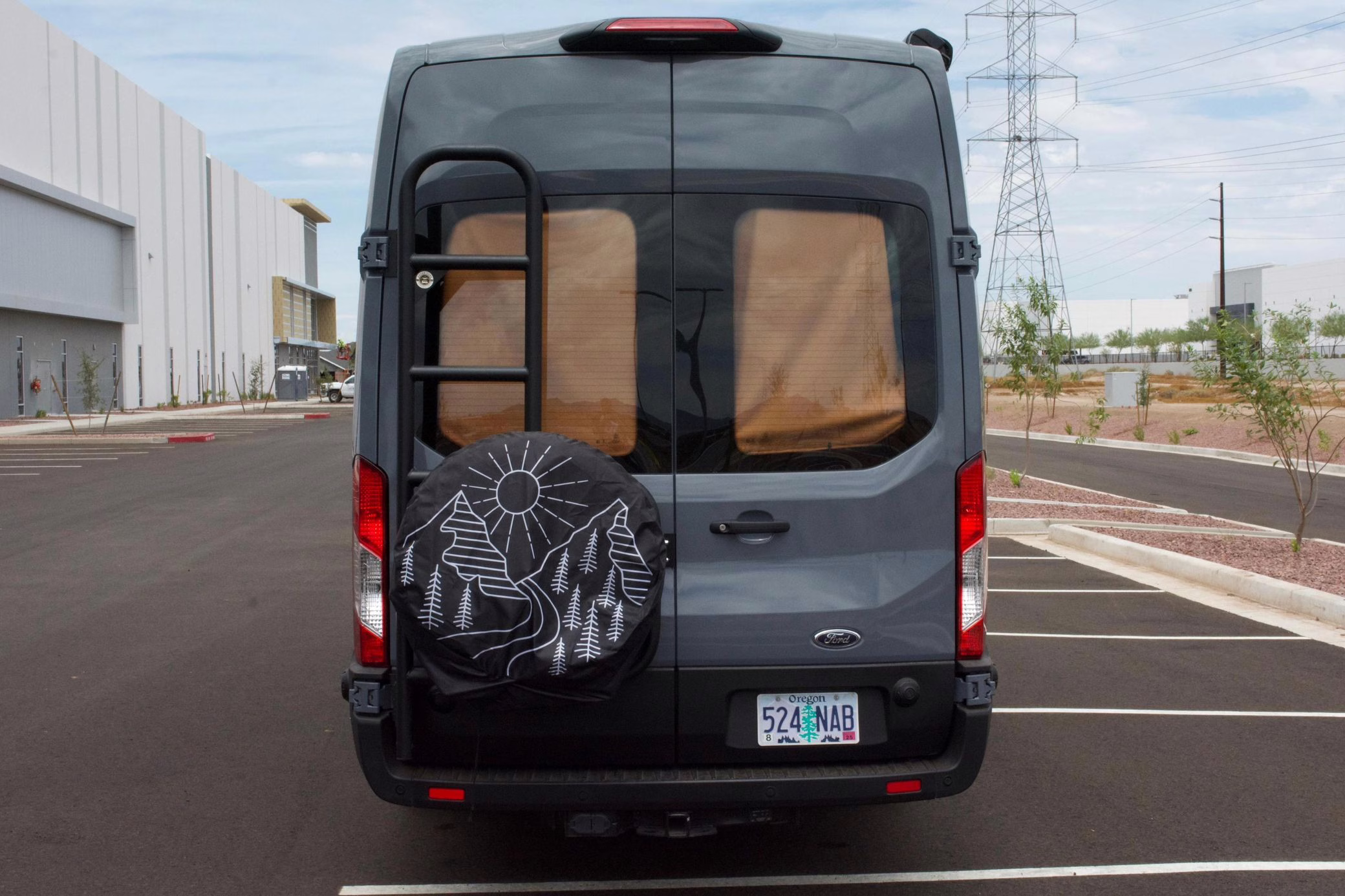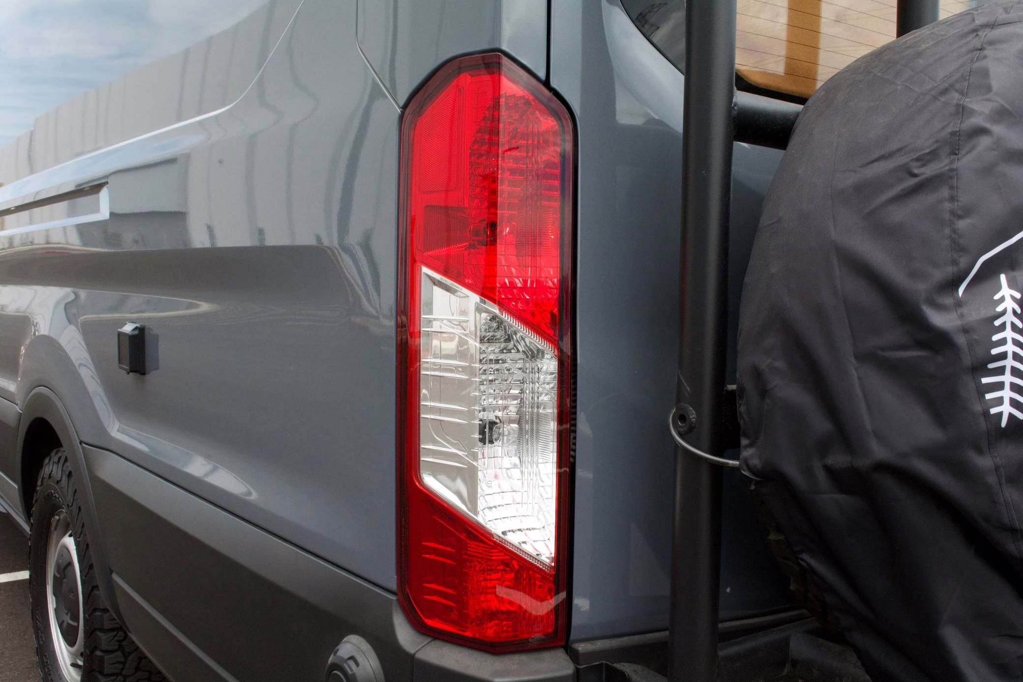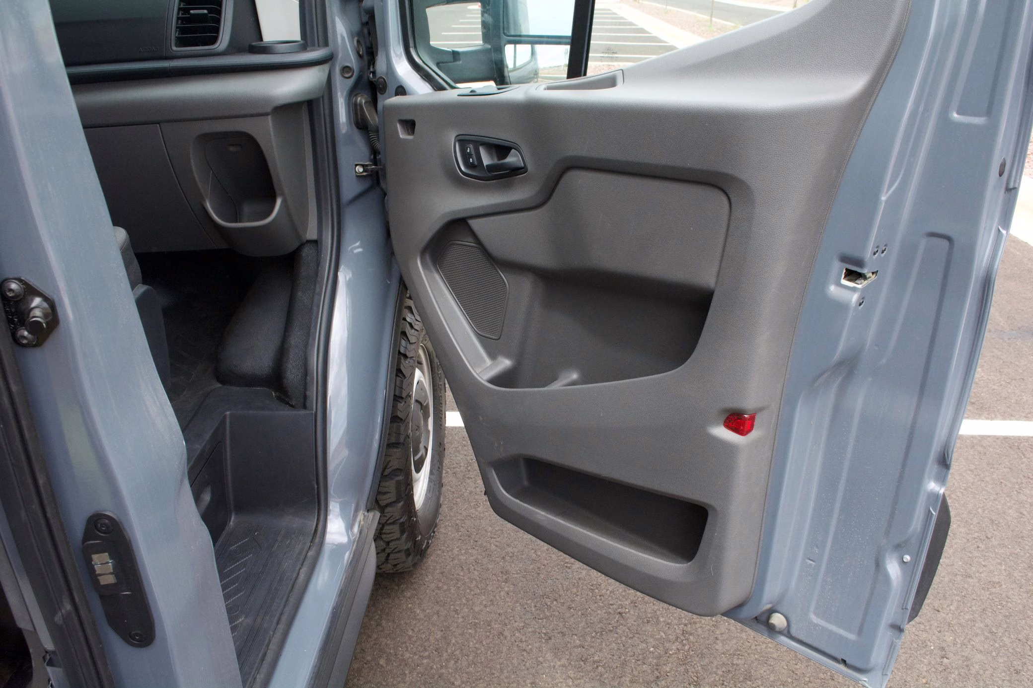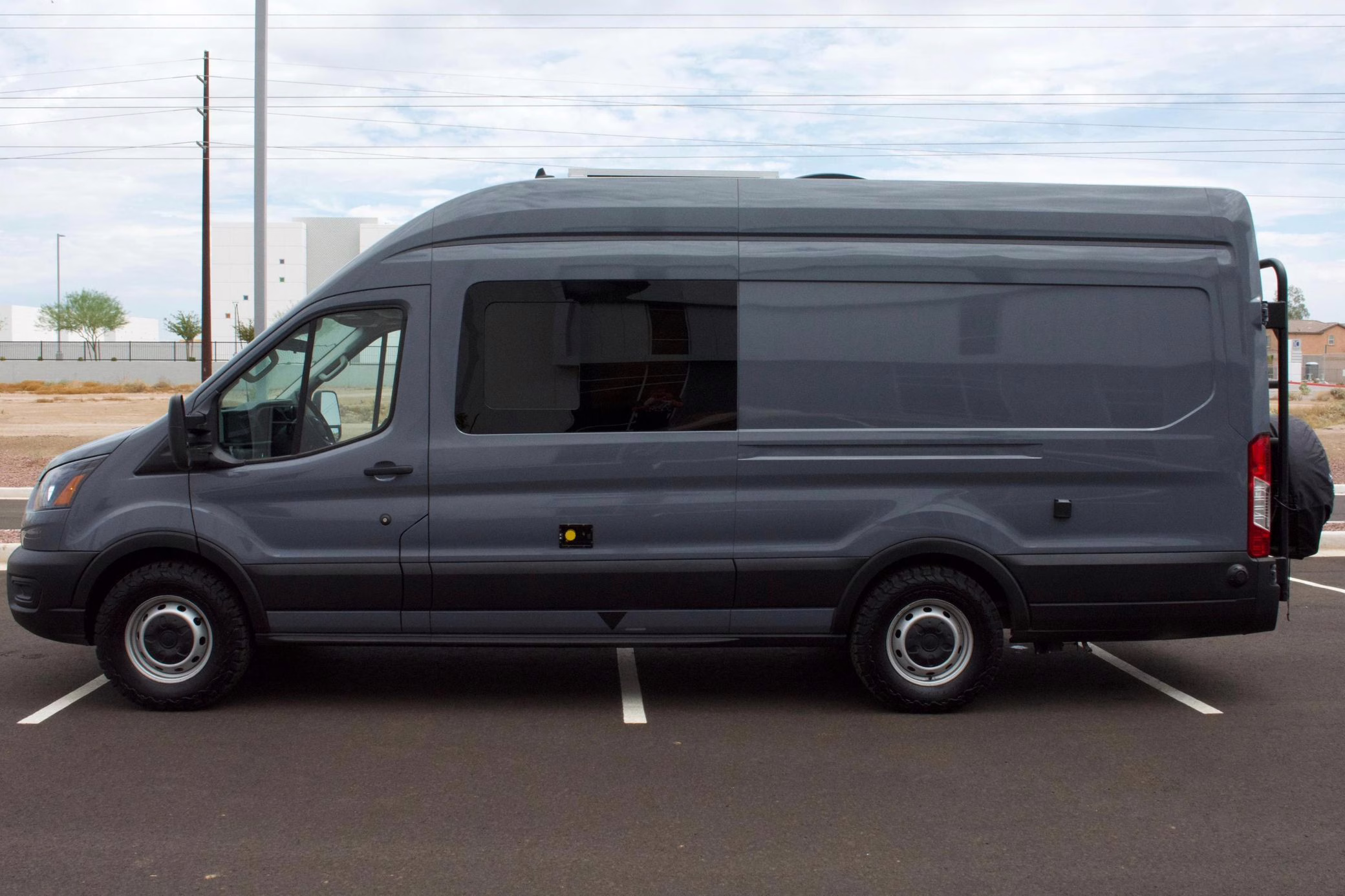 This Transit has been converted to a custom camper van. Modifications reported by the seller include 2 100-watt solar panels, a 12.5-foot wide and 7-foot extending Fiamma F80s awning, a rear sleeping and dining area with convertible 6-foot queen-size bed, a 6-drawer kitchen galley with hold-down straps, a CAN Campervan two-burner propane cooktop with sink, and more as detailed below.