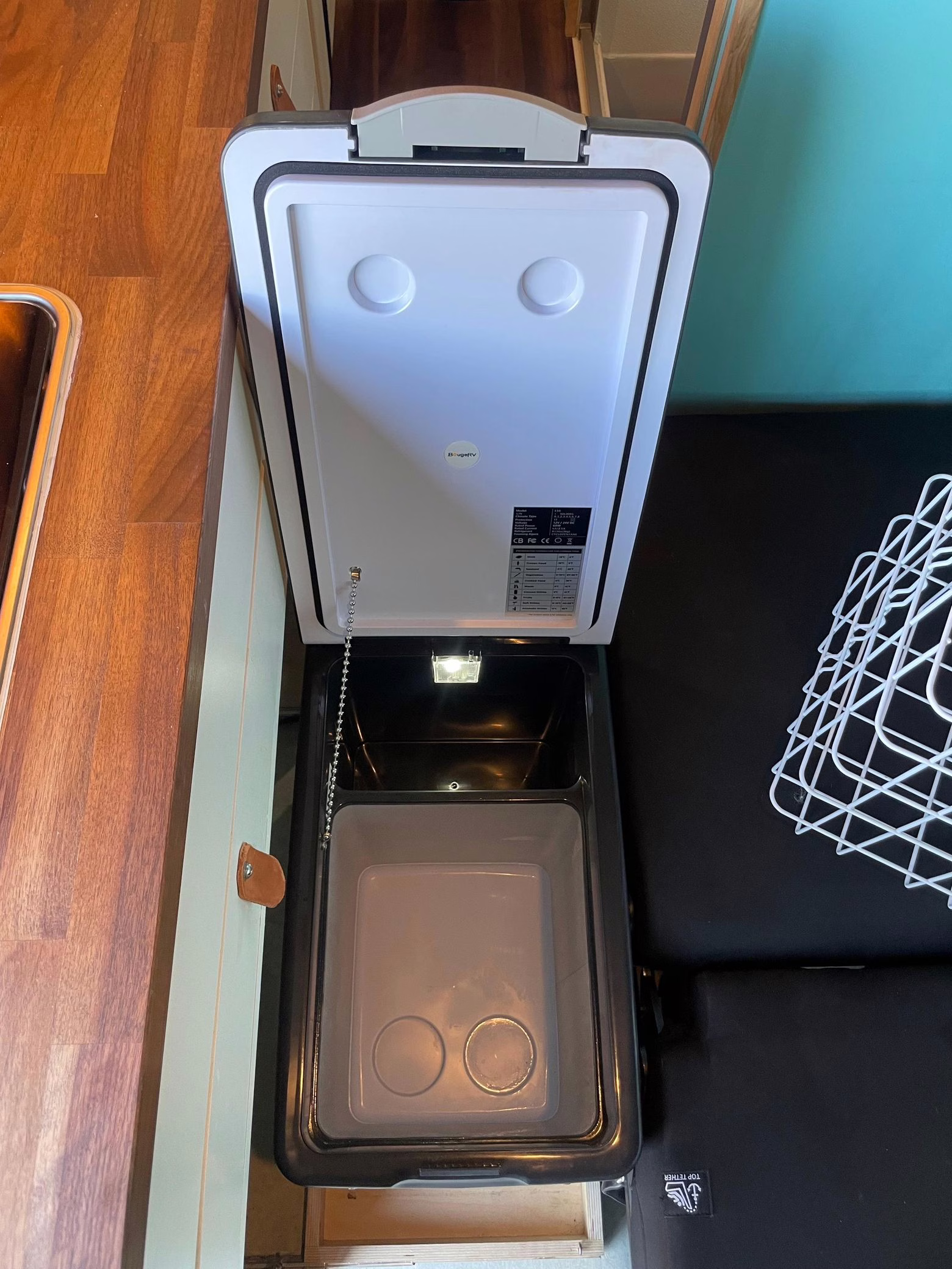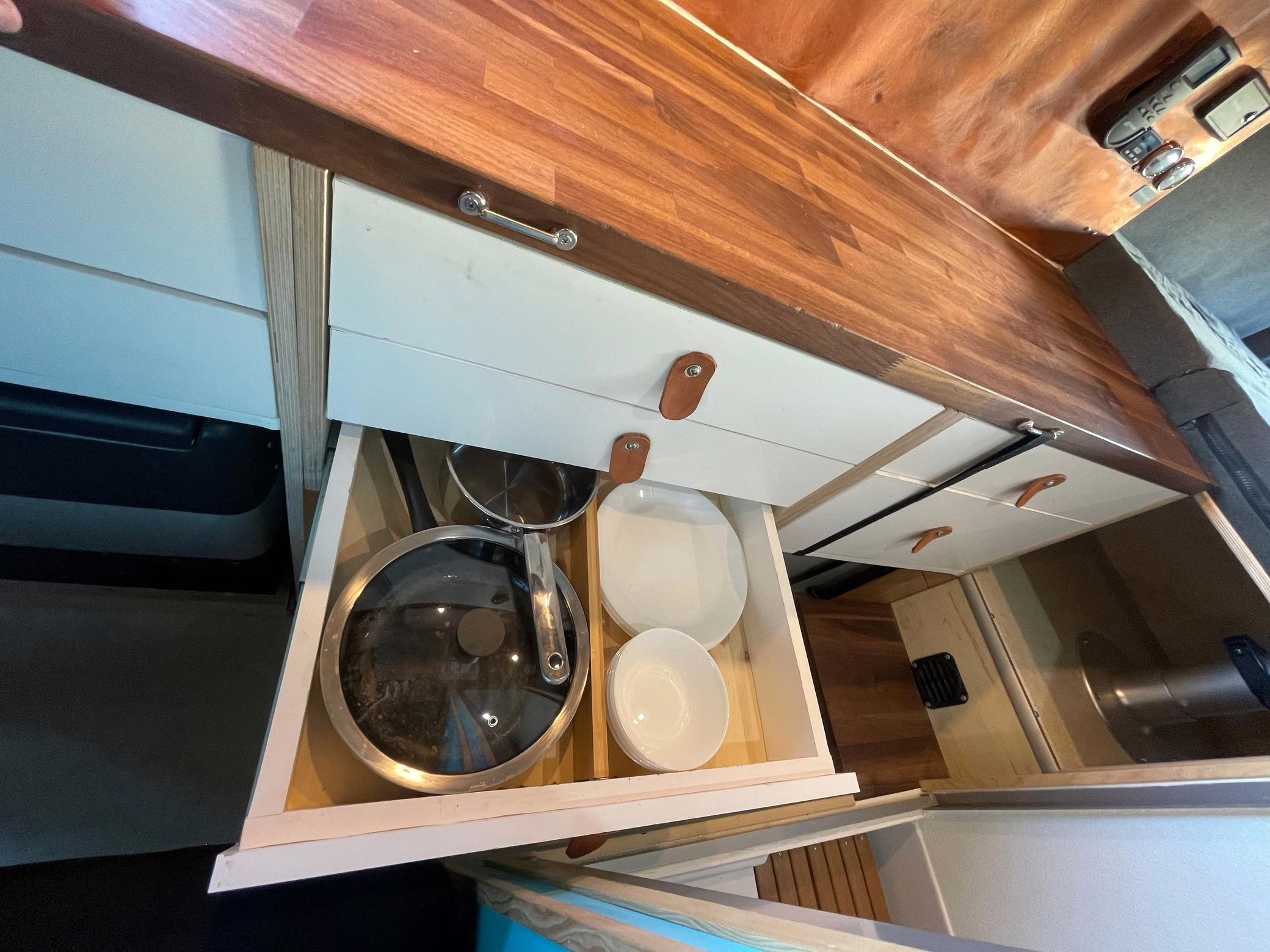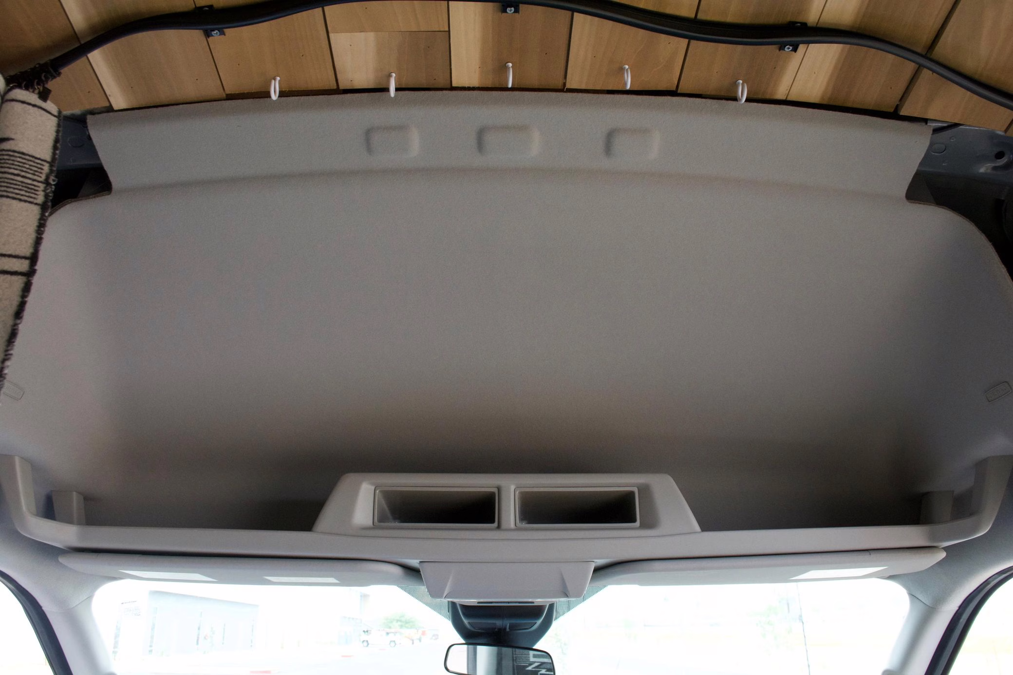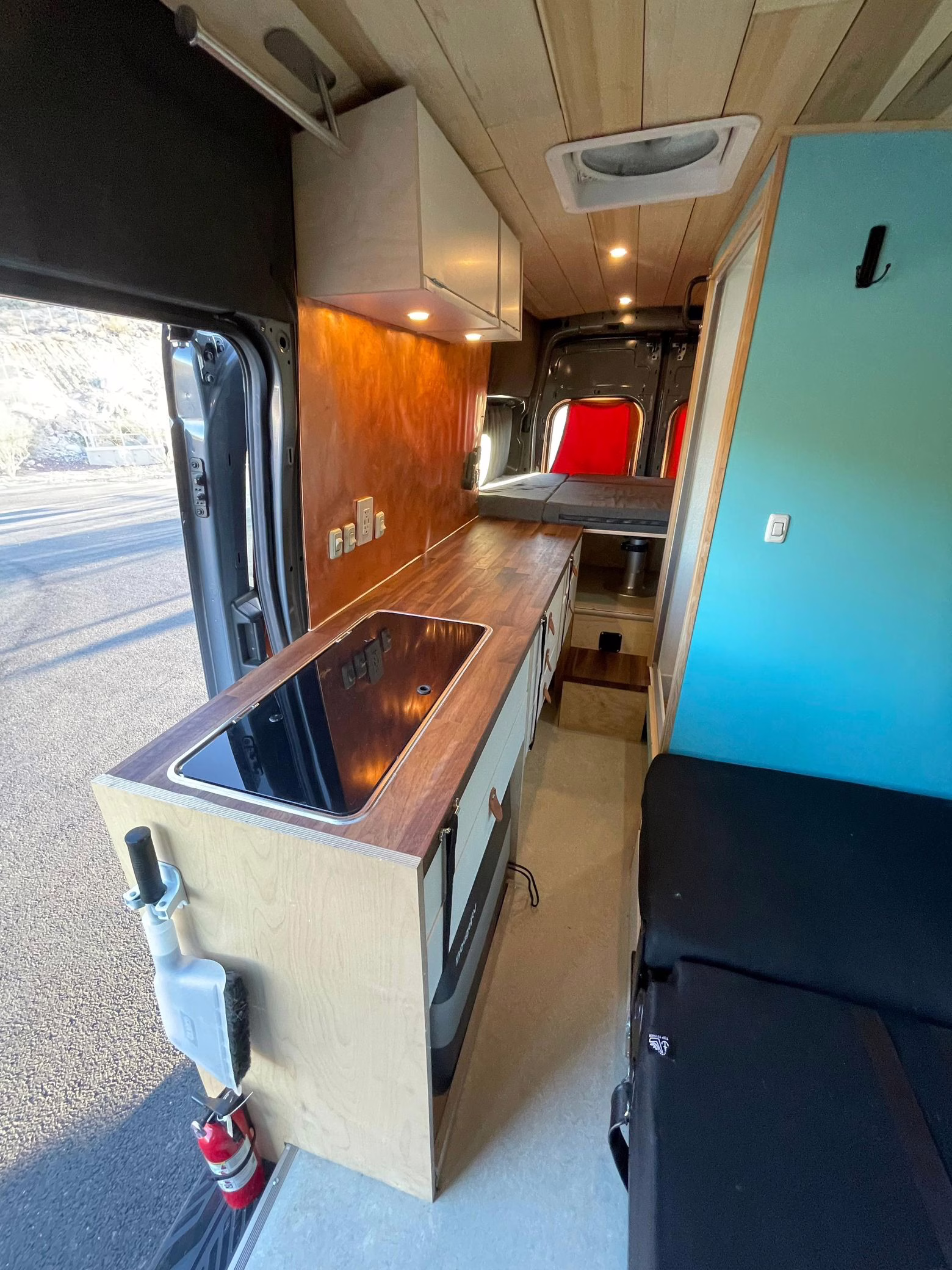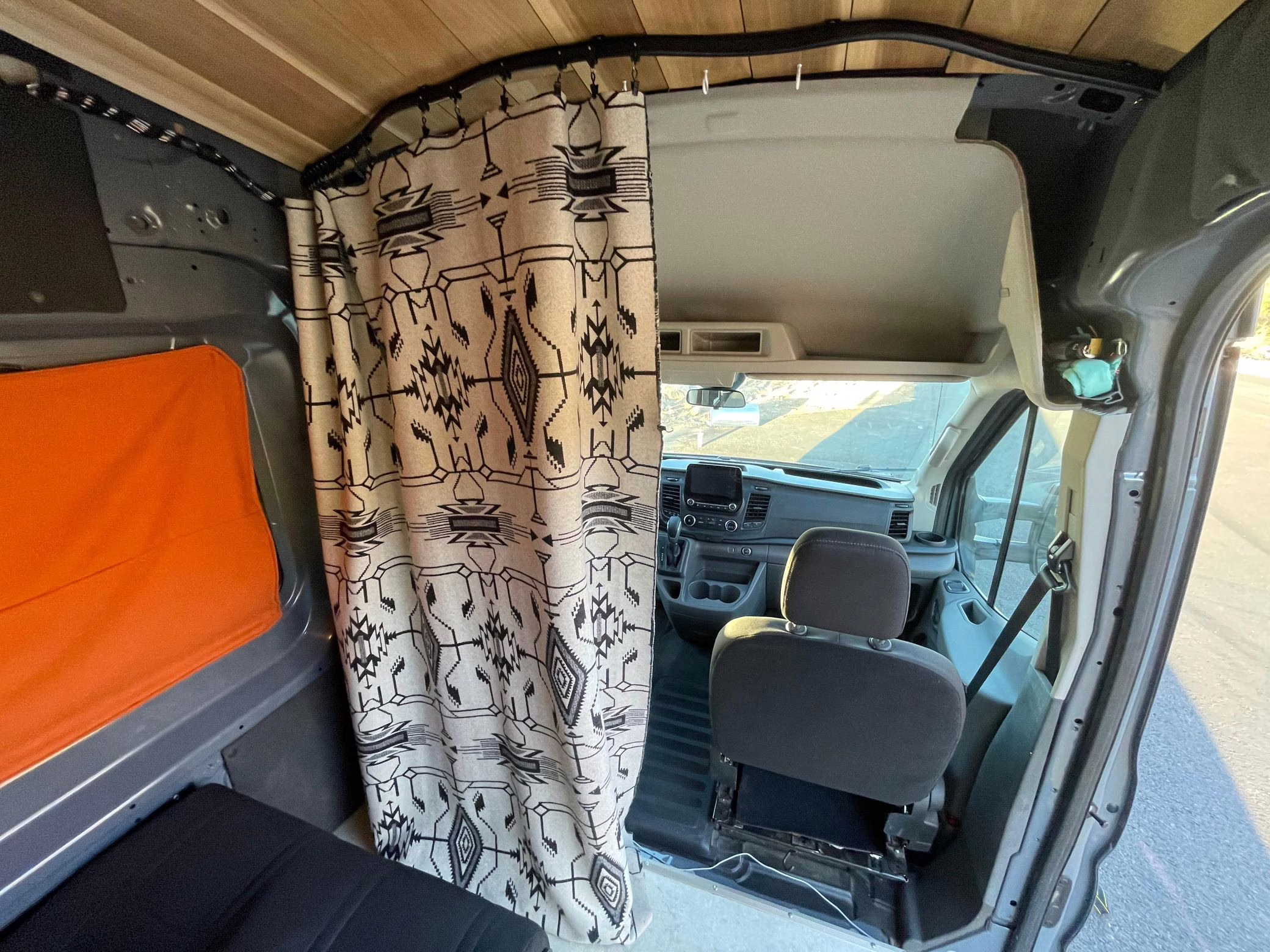 This Transit has been converted to a custom camper van. Modifications reported by the seller include 2 100-watt solar panels, a 12.5-foot wide and 7-foot extending Fiamma F80s awning, a rear sleeping and dining area with convertible 6-foot queen-size bed, a 6-drawer kitchen galley with hold-down straps, a CAN Campervan two-burner propane cooktop with sink, and more as detailed below.