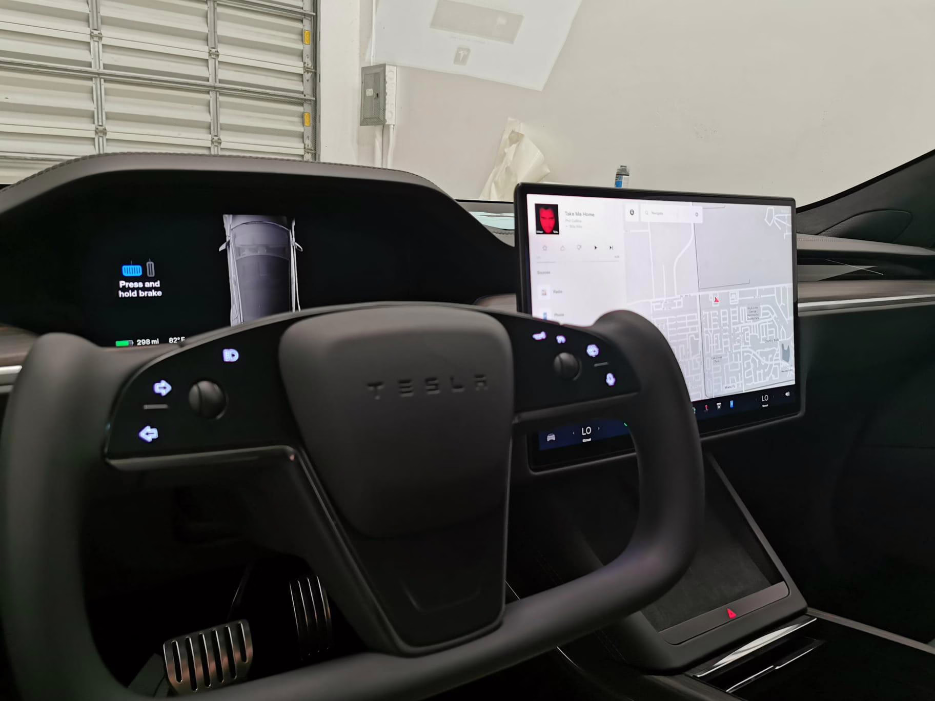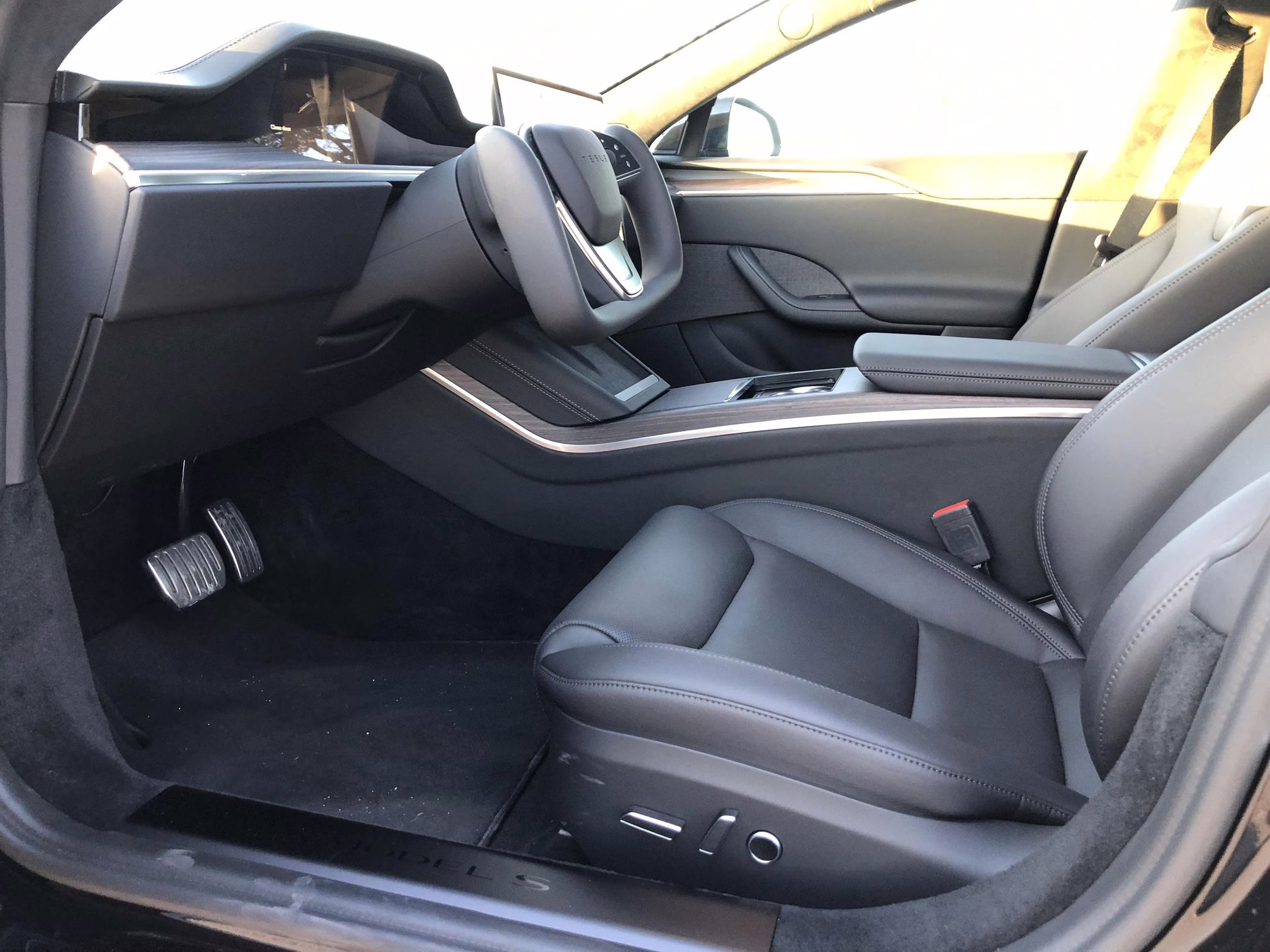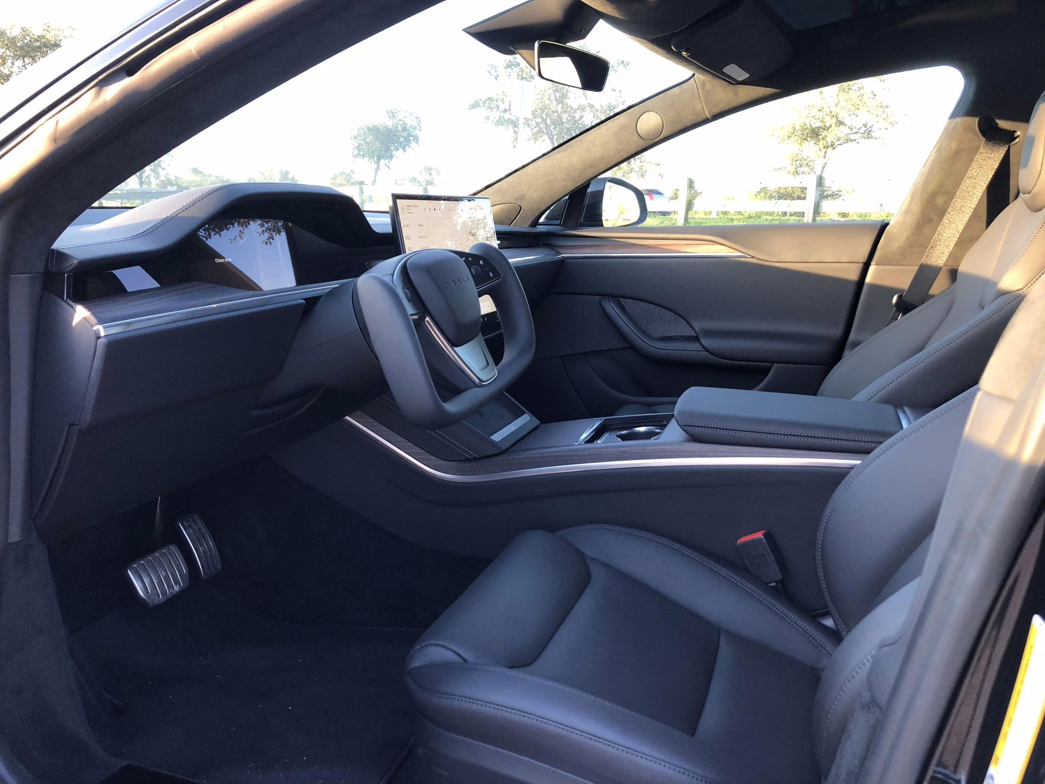 An included window sticker shows this Model S carried a sticker price of $97,690 and came equipped with 19-inch Tempest wheels, adaptive suspension damping, a panoramic glass roof, leatherette upholstery, a yoke steering wheel, heated and cooled front seats, 3-zone climate control system, a 22-speaker audio system, autopilot, and more as detailed below.