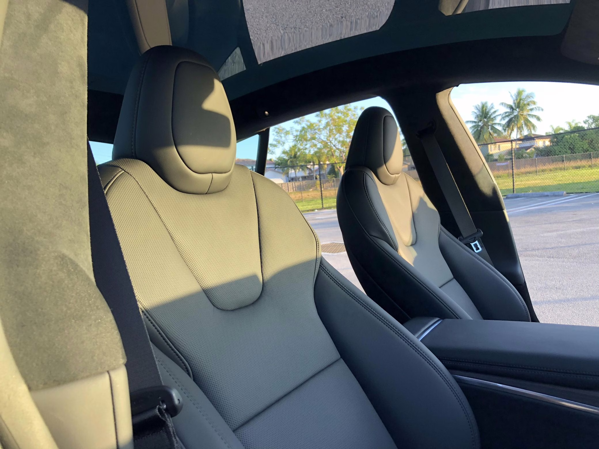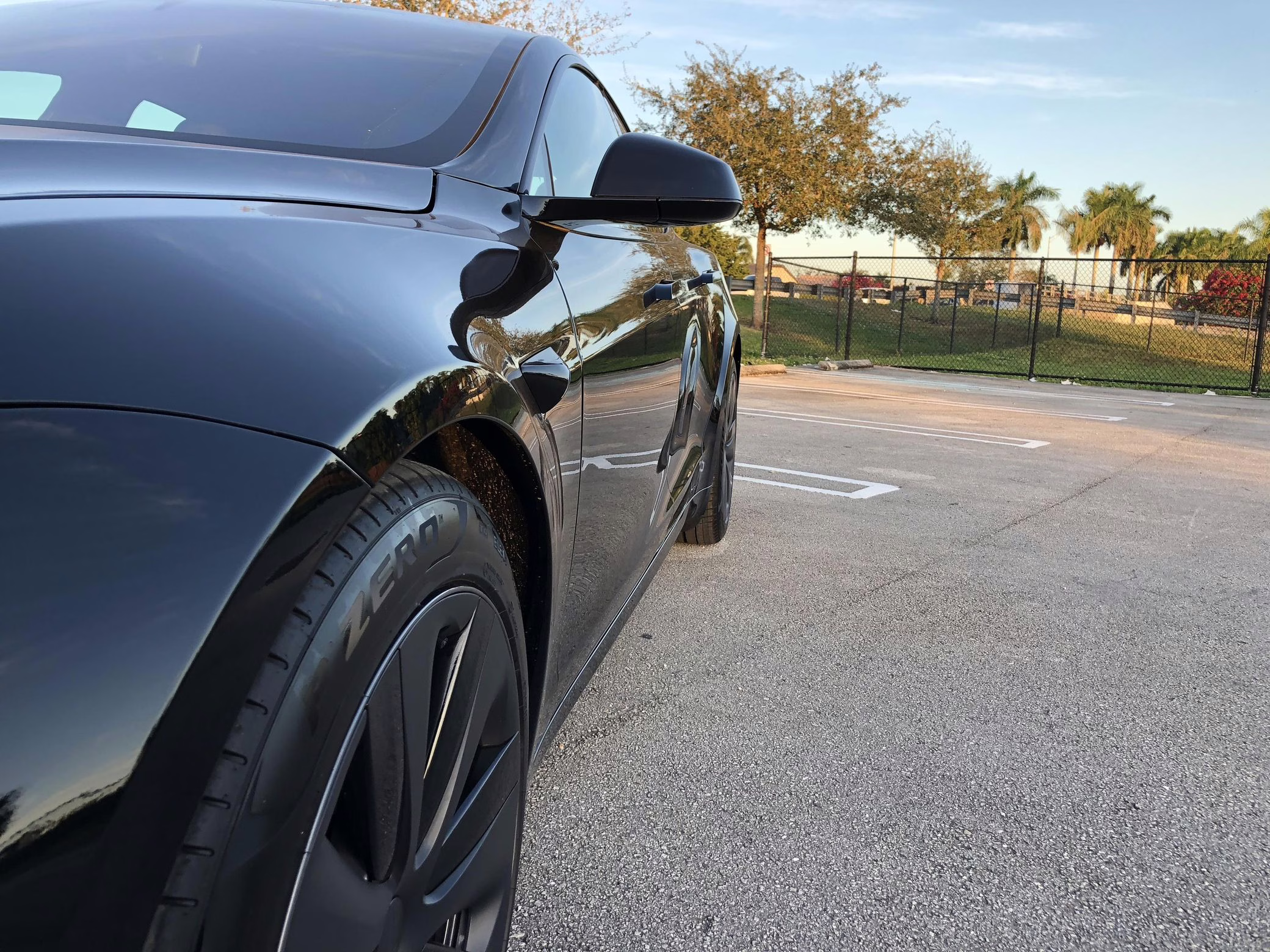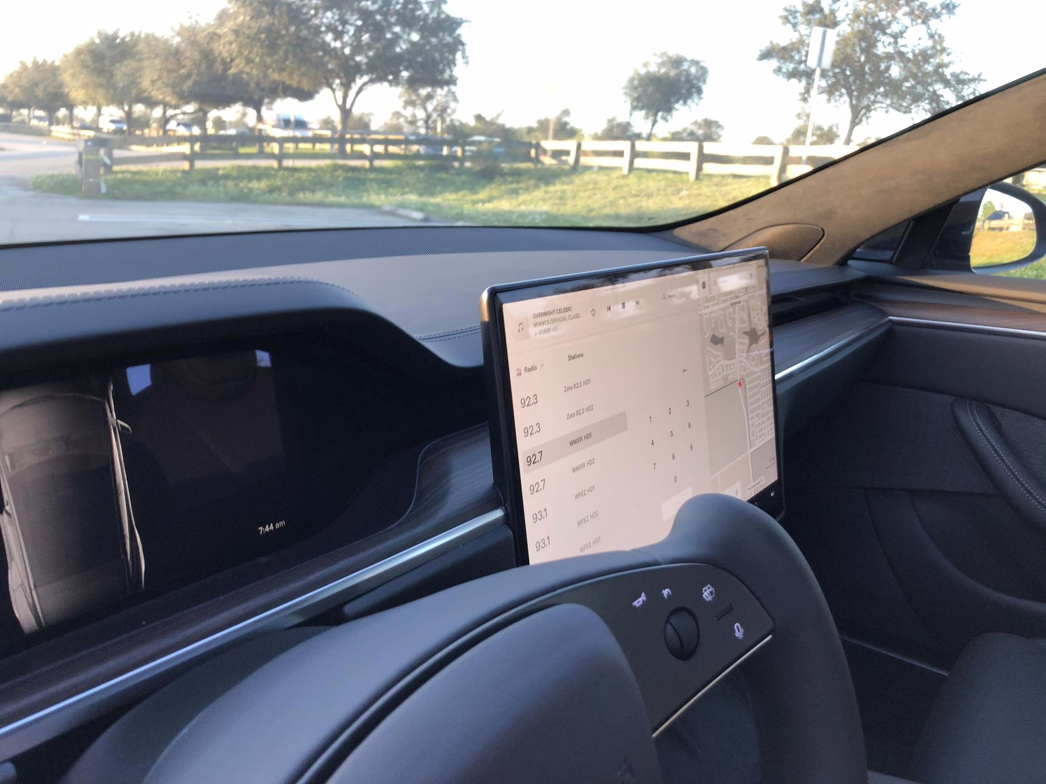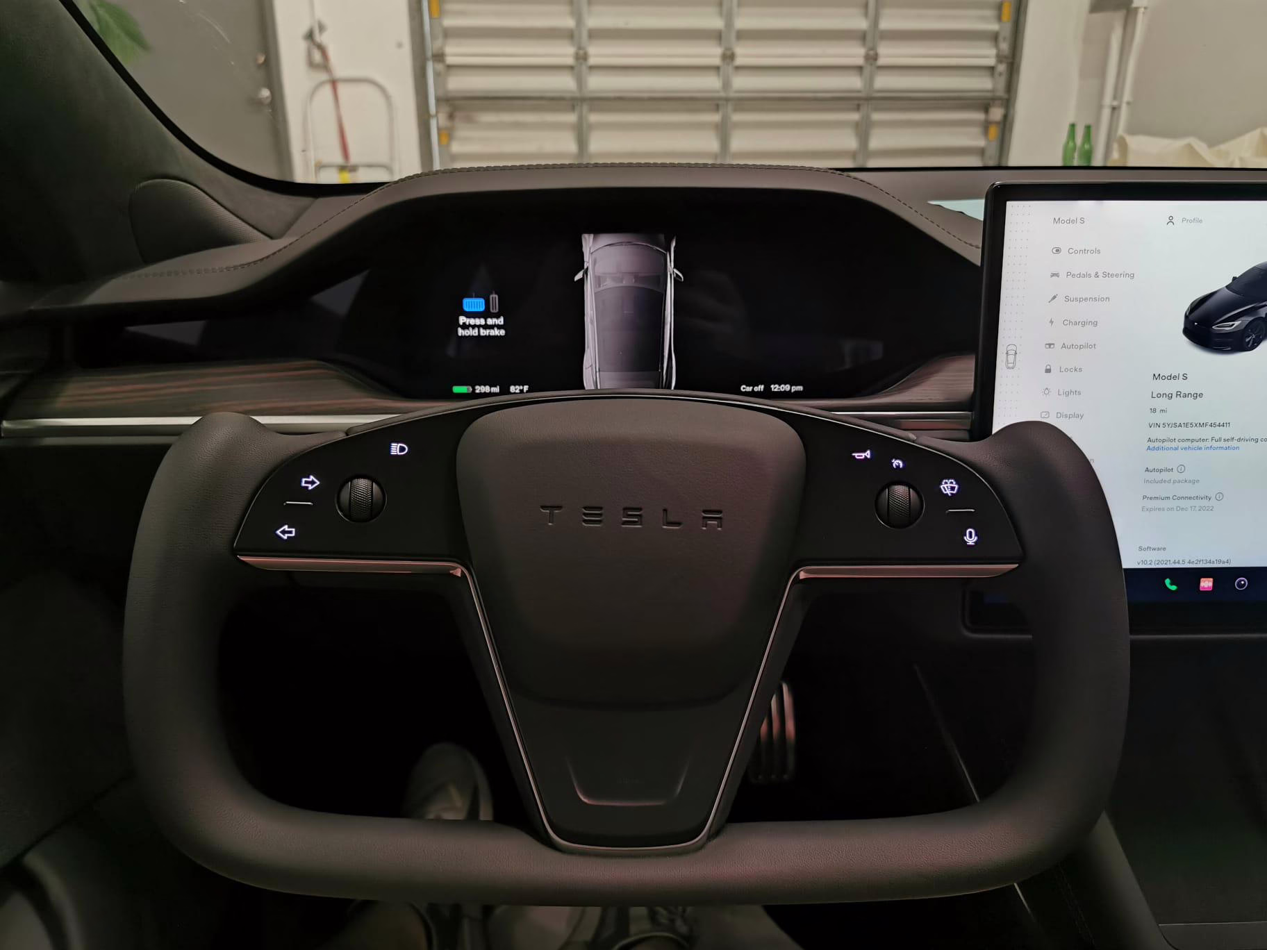 An included window sticker shows this Model S carried a sticker price of $97,690 and came equipped with 19-inch Tempest wheels, adaptive suspension damping, a panoramic glass roof, leatherette upholstery, a yoke steering wheel, heated and cooled front seats, 3-zone climate control system, a 22-speaker audio system, autopilot, and more as detailed below.