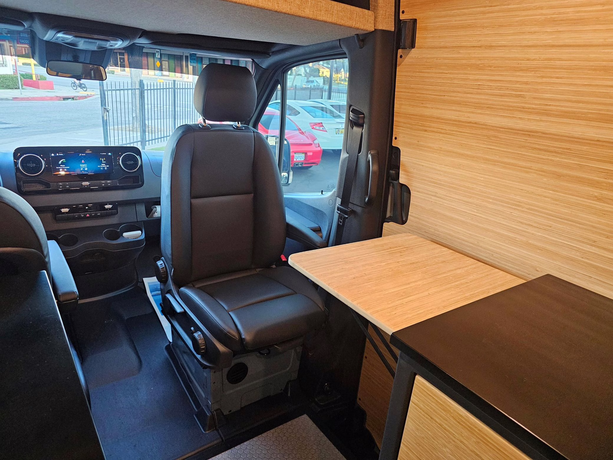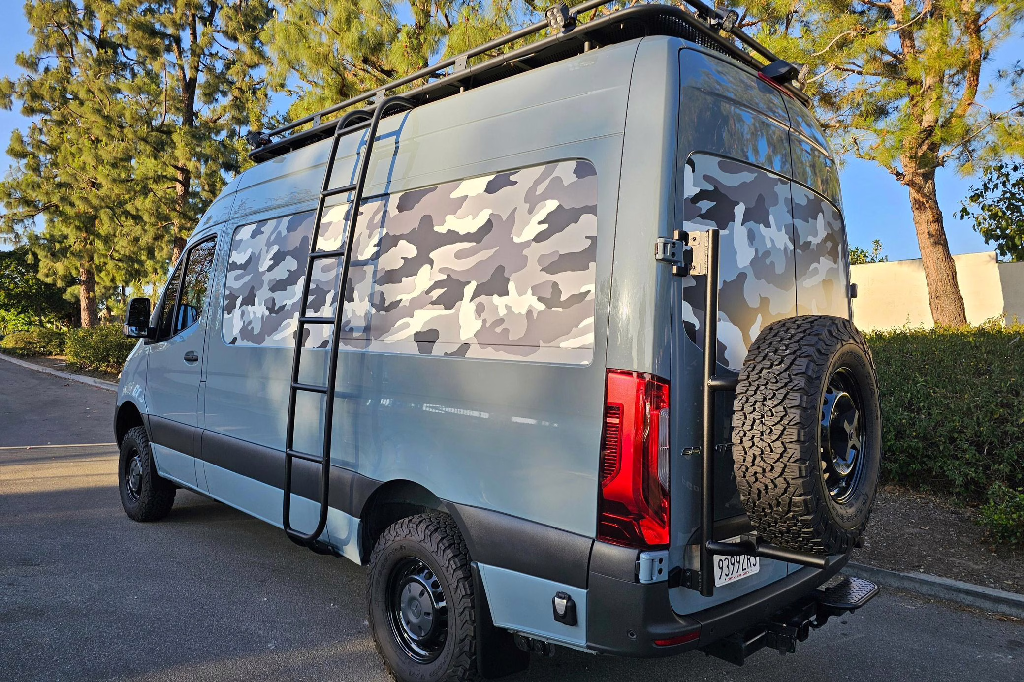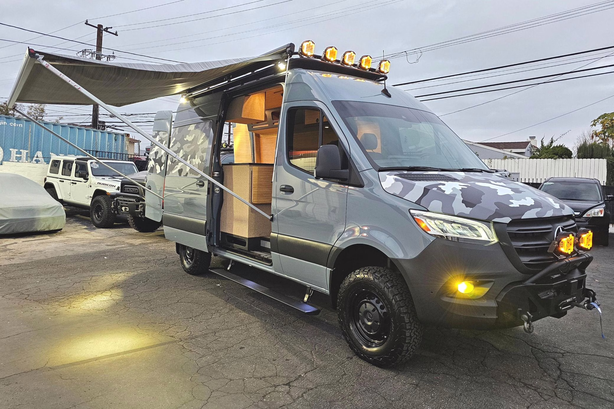 This Sprinter has been converted into a camper. Notable modifications reported by the selling dealer include an Owl Pismo front bumper, a Superwinch SX12SR front winch, a Fiamma awning, a Dometic A/C system, an Espar air heater, Zamp solar panels, a refrigerator, and more, as detailed below.