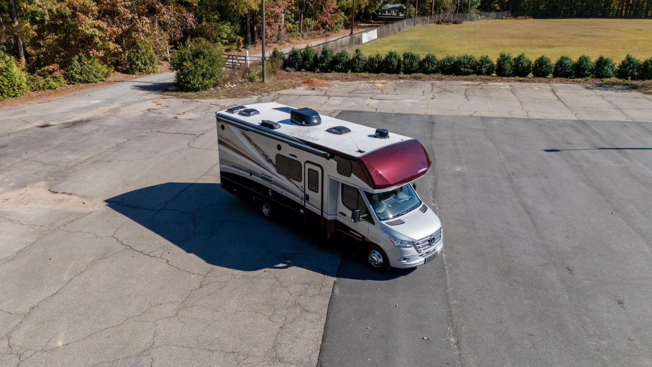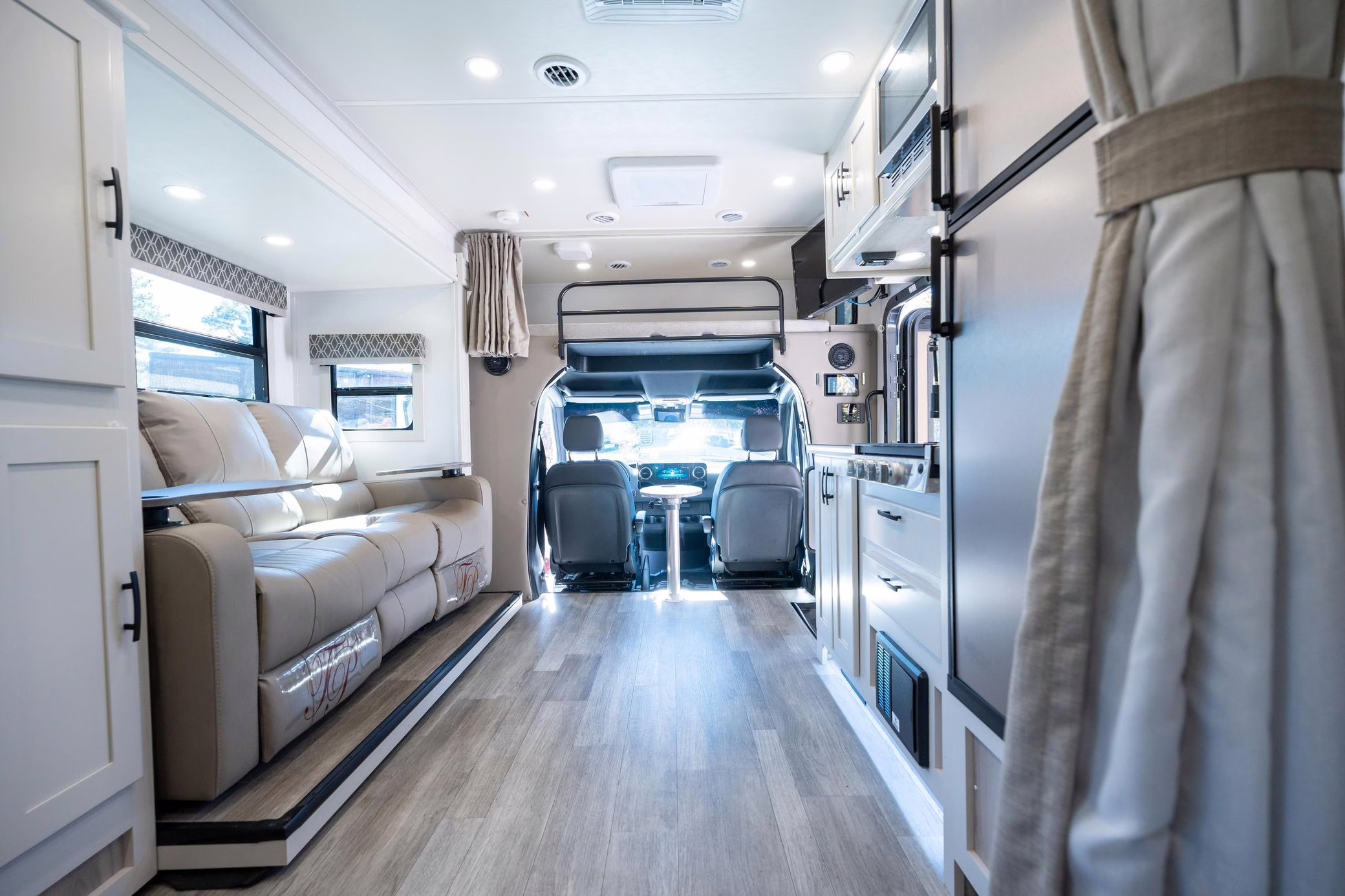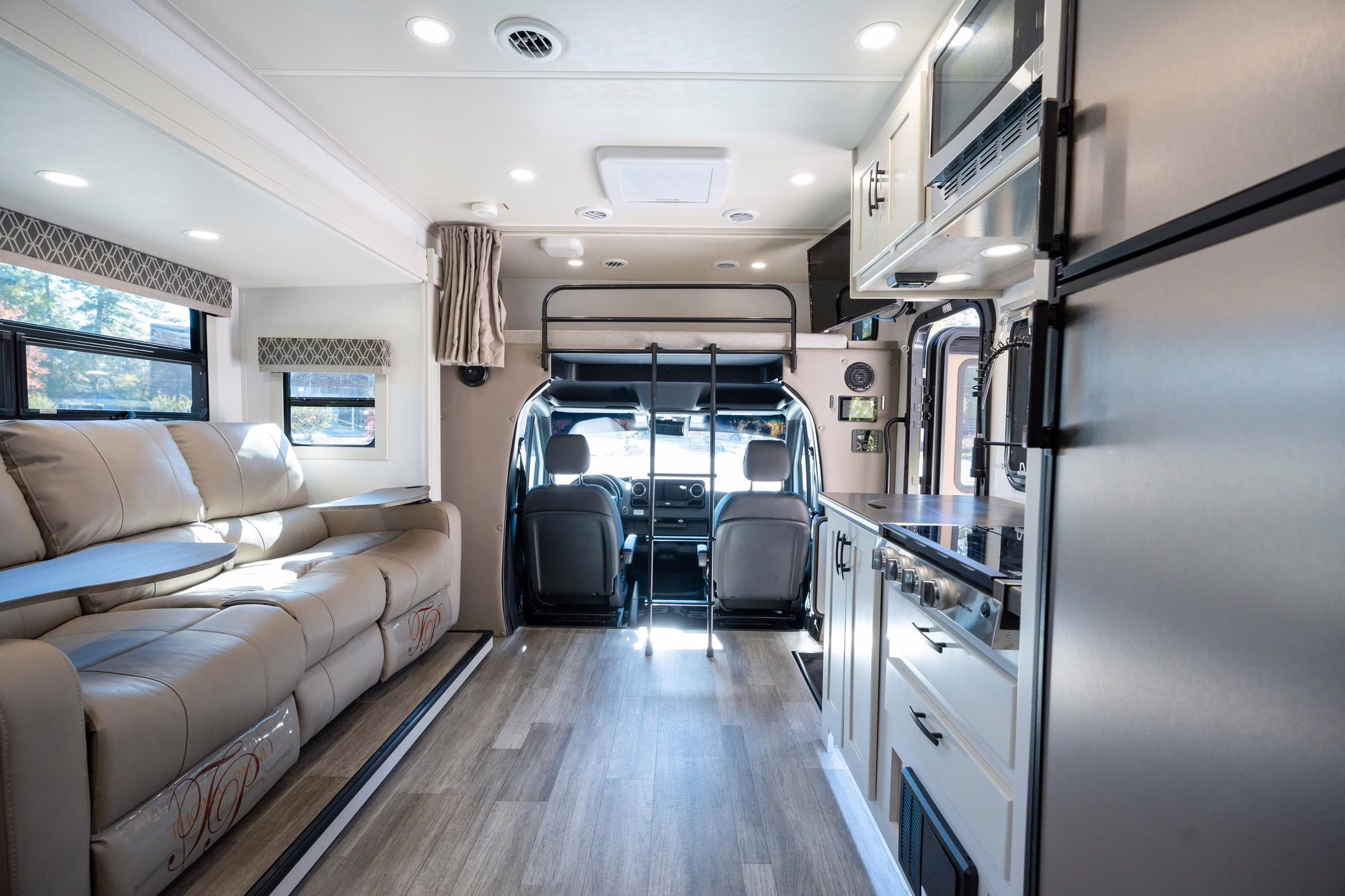 This Sprinter has been converted to a camper by Indiana-based Dynamax with their Class C Motorhome Isata 3 Series package. The list of modifications reported by the seller includes a two-tone exterior paint, a cab-over bunk, a driver-side wall slide, an awning, a kitchenette, a refrigerator, a queen bed, a 3-seat power-reclining sofa, and a toilet with a shower.
