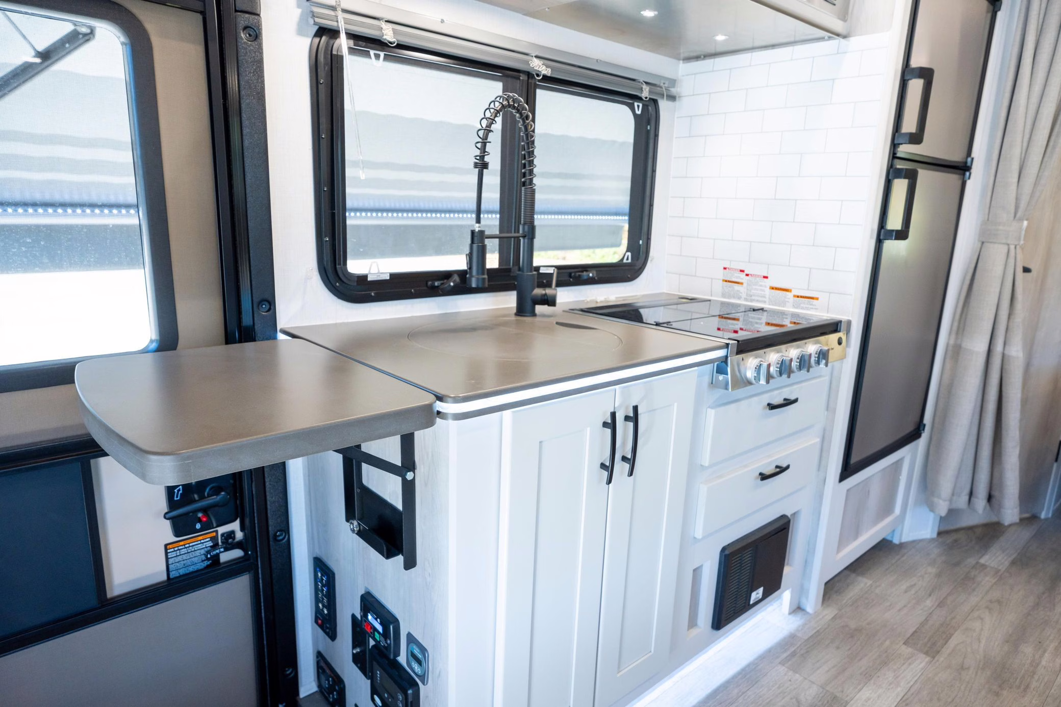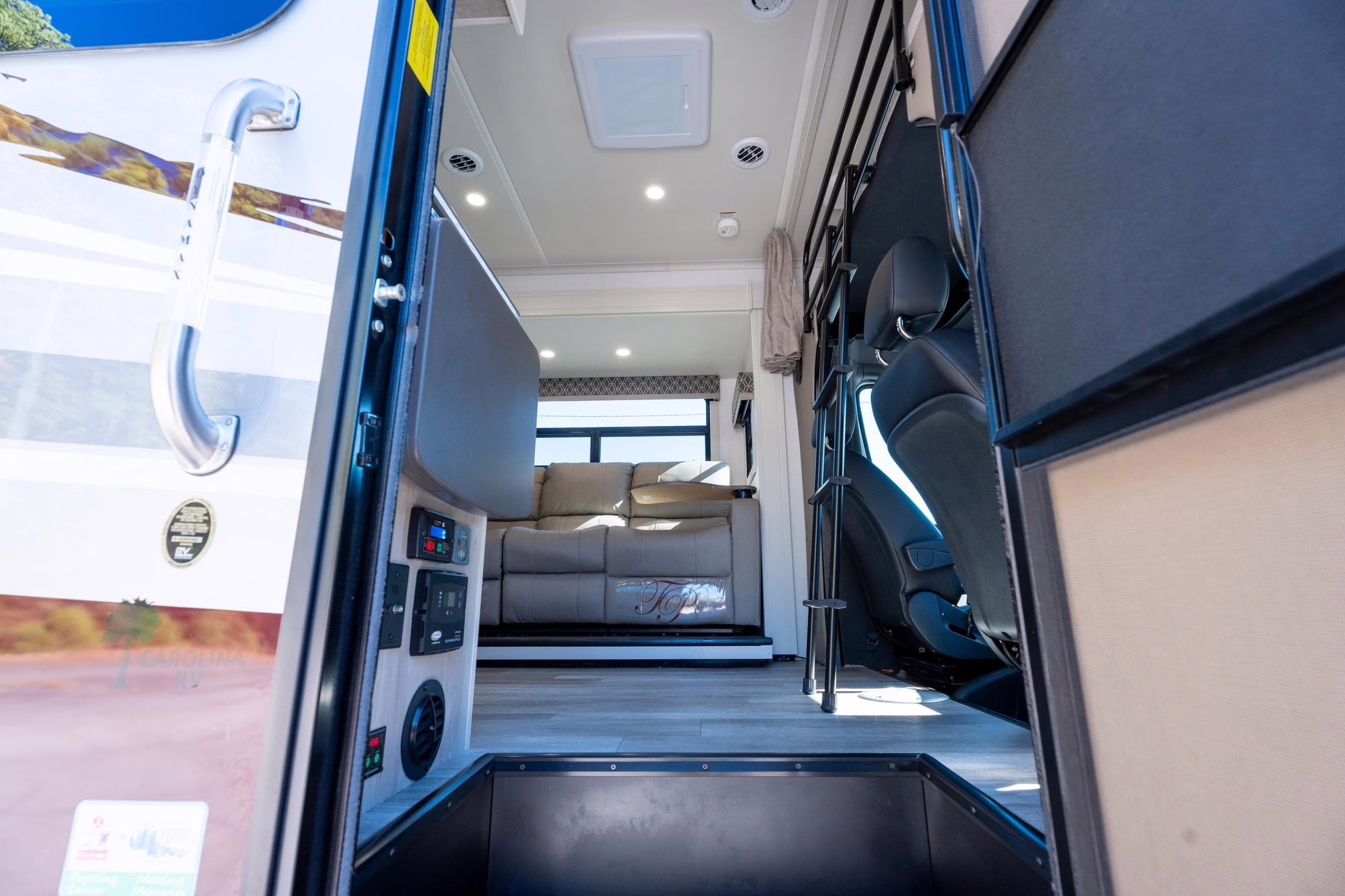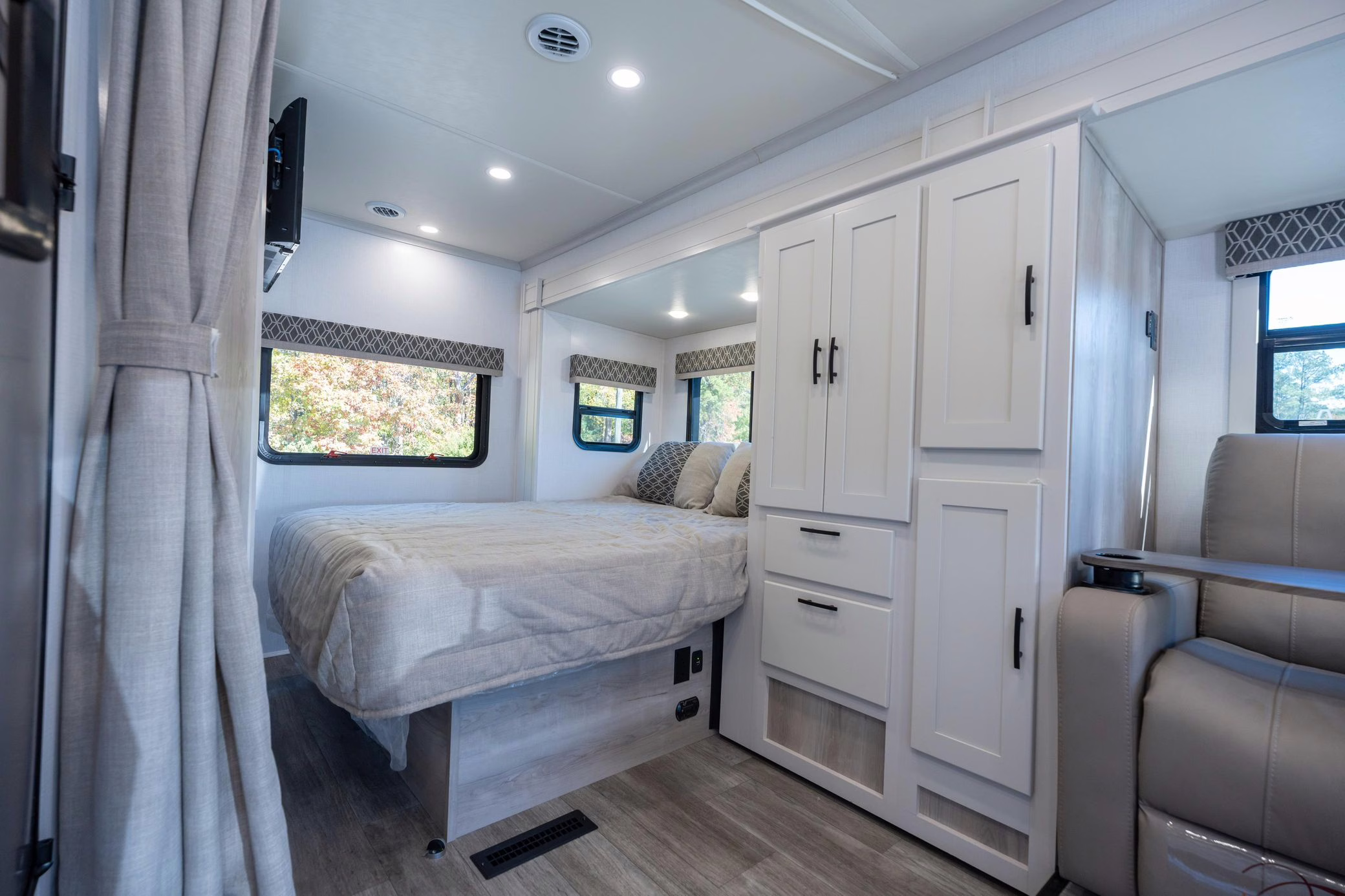 This Sprinter has been converted to a camper by Indiana-based Dynamax with their Class C Motorhome Isata 3 Series package. The list of modifications reported by the seller includes a two-tone exterior paint, a cab-over bunk, a driver-side wall slide, an awning, a kitchenette, a refrigerator, a queen bed, a 3-seat power-reclining sofa, and a toilet with a shower.
