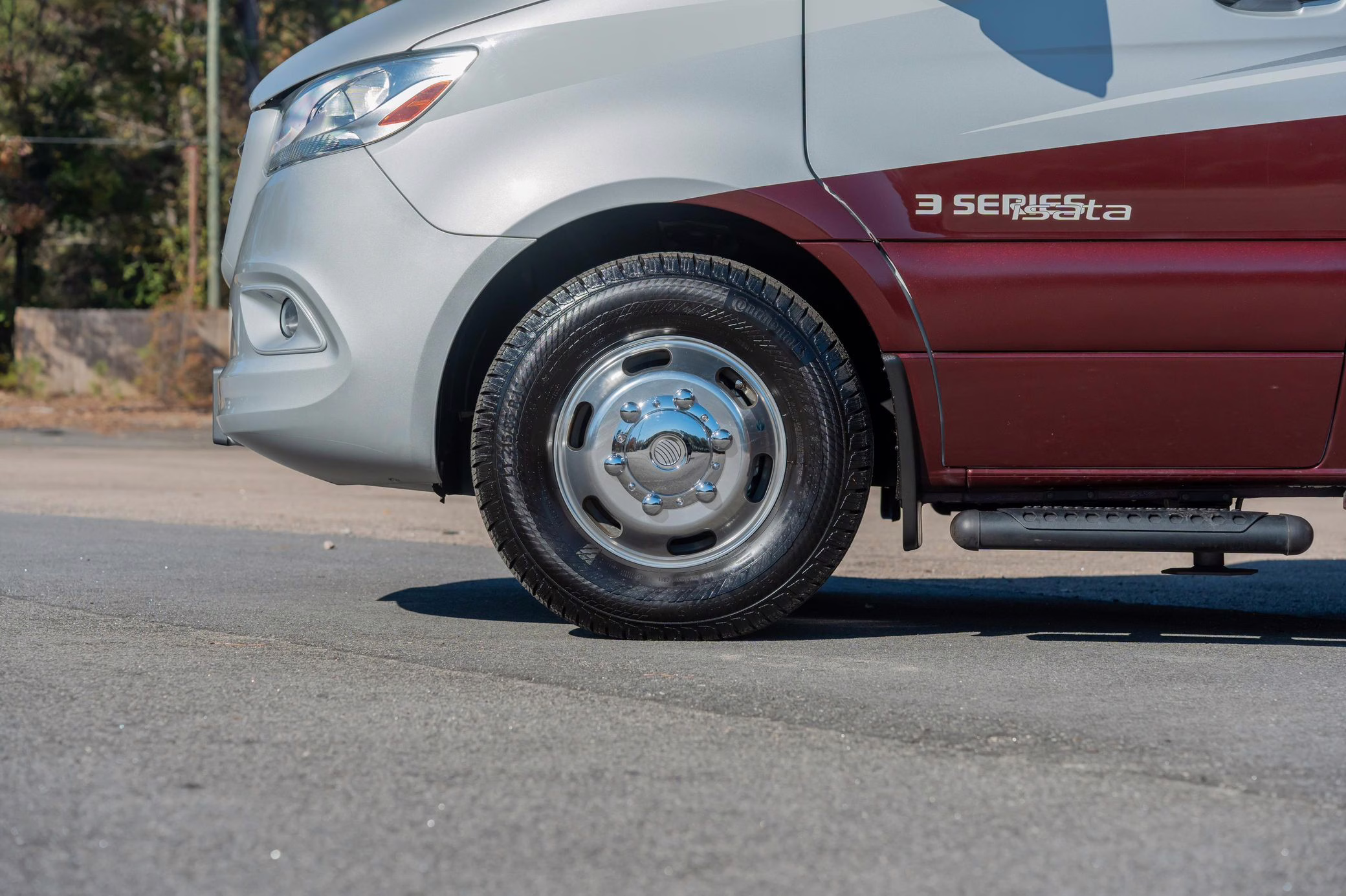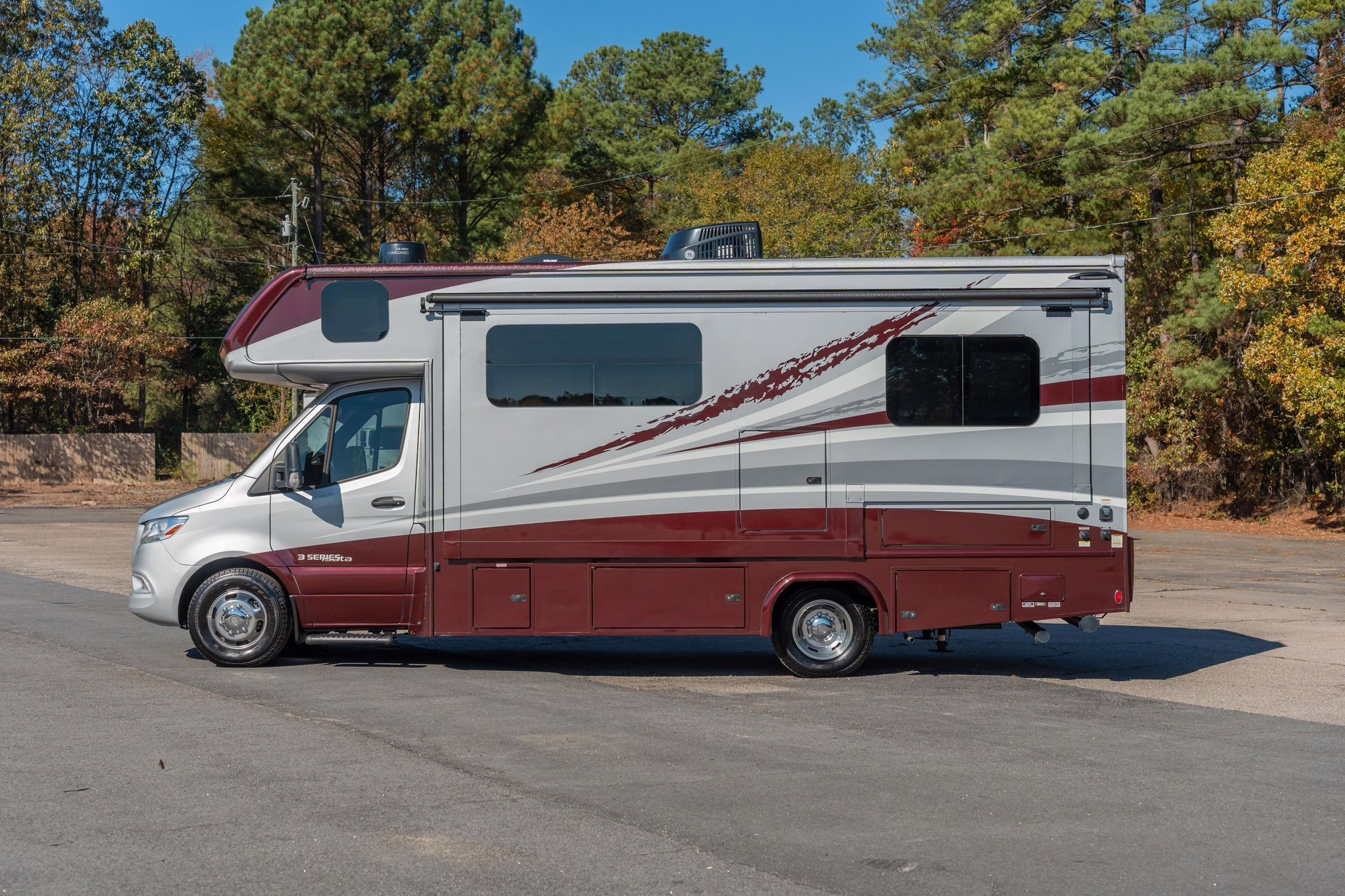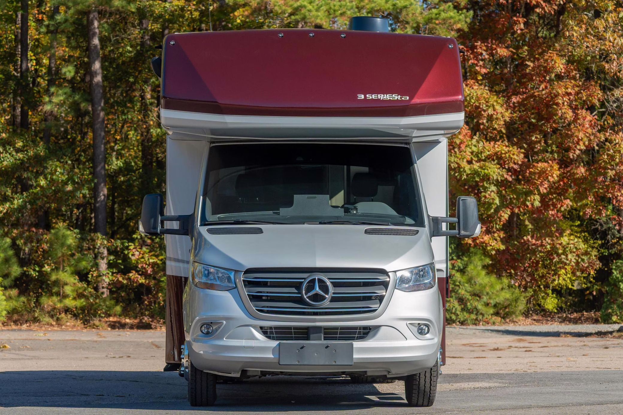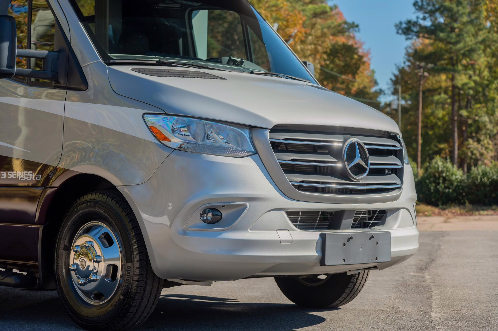 2023 Mercedes-Benz Sprinter 3500XD Isata 3 Series, finished in silver and burgundy with a black interior.
